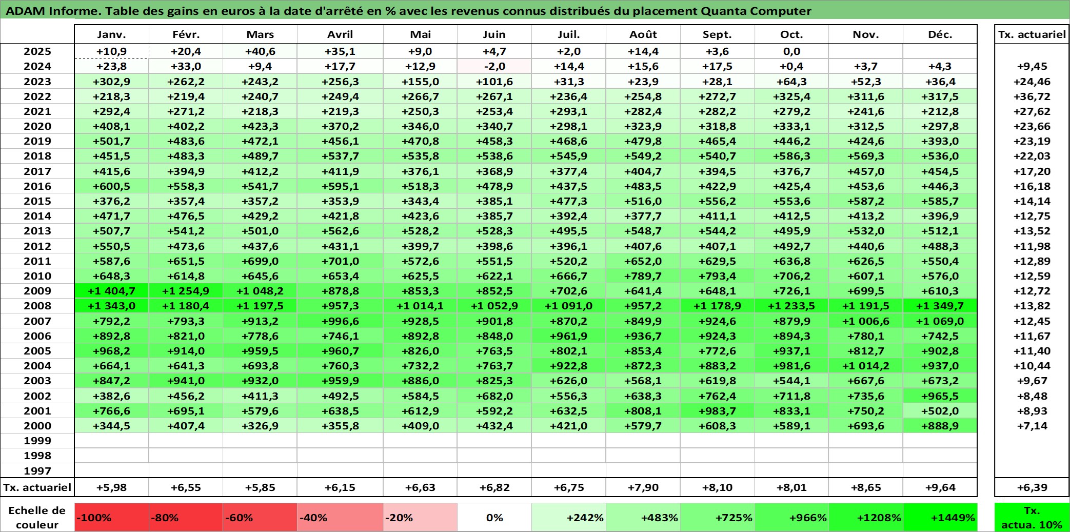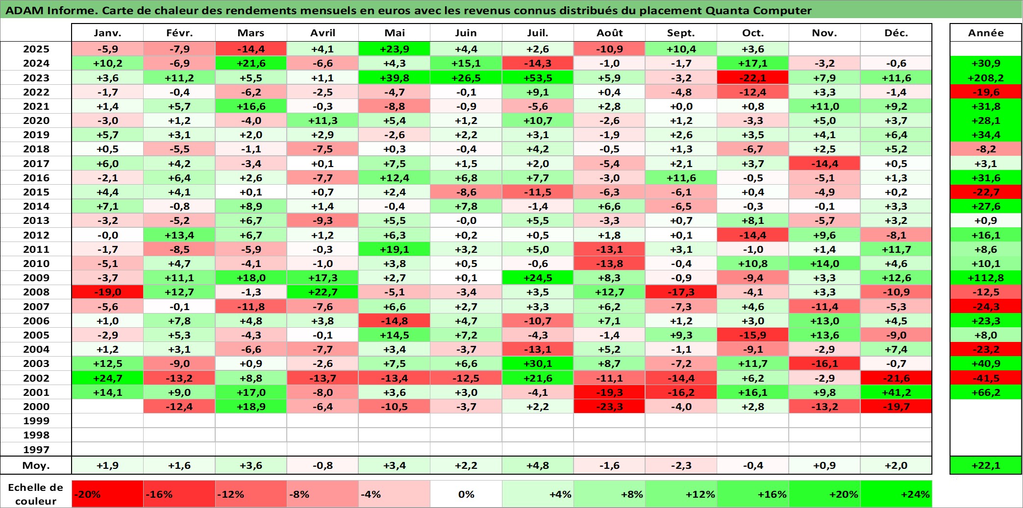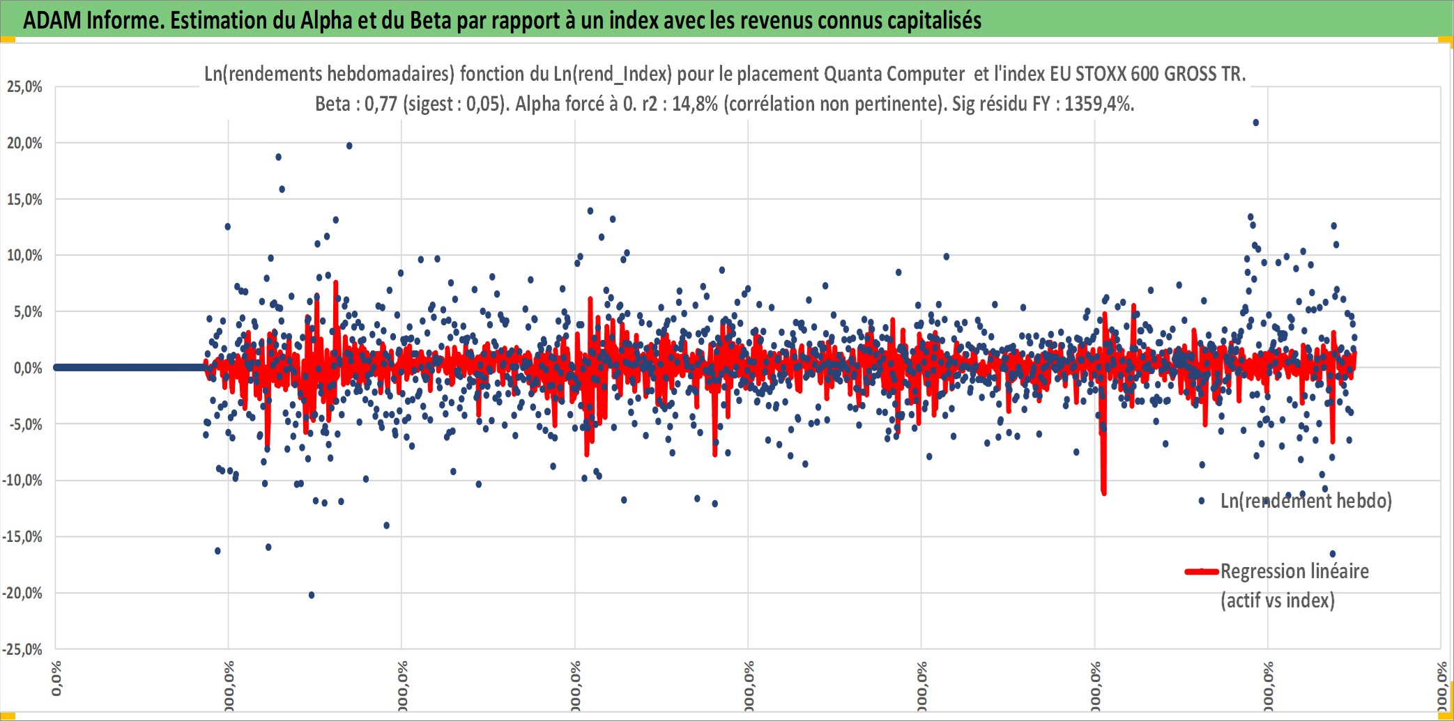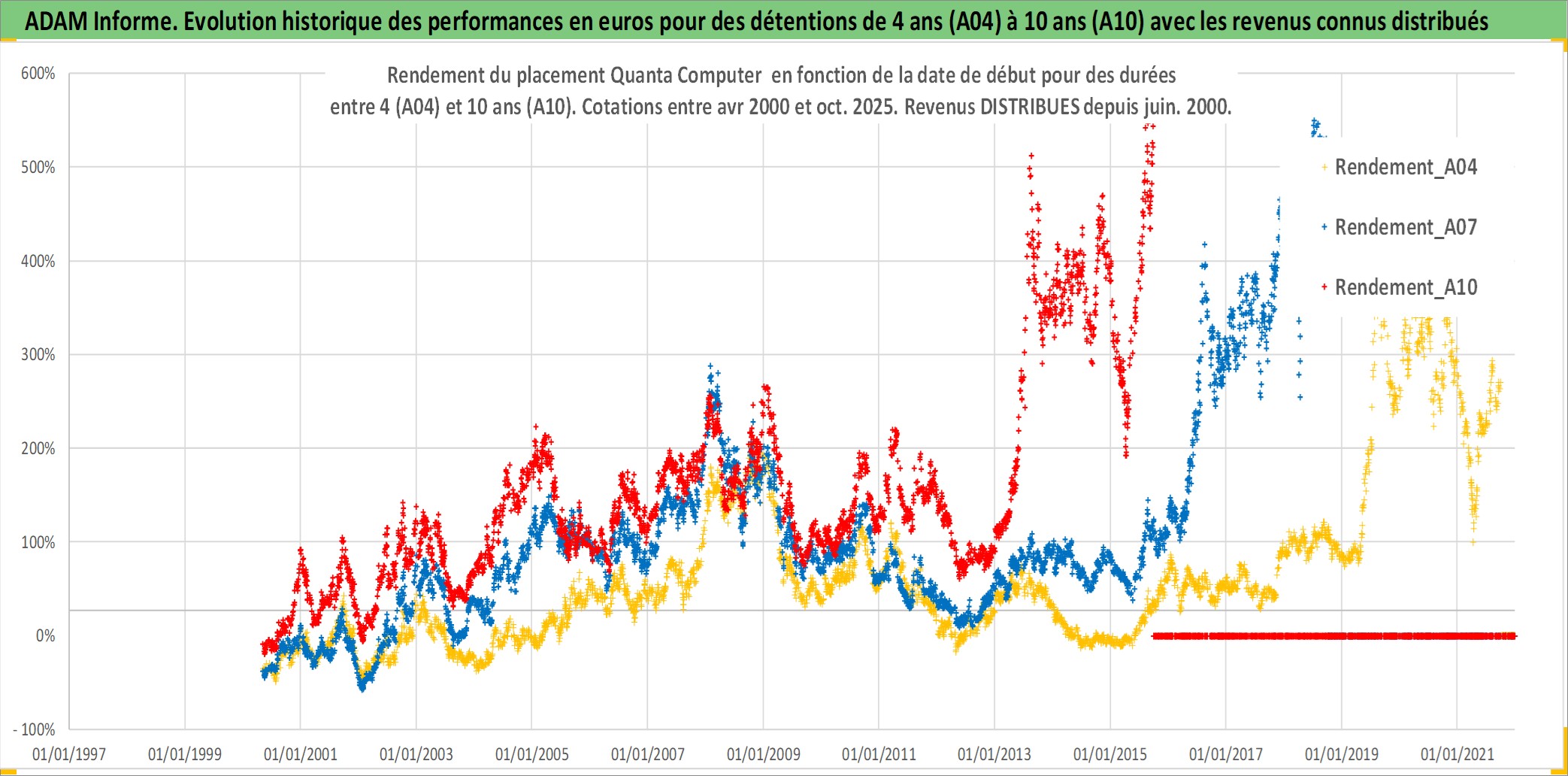 Site dédié aux investisseursPage dédiée sur site financeAnalyse des valorisations hebdomadaires de l'action Quanta Computer . Cet actif est cote en TWD. Les valorisations sont en contrevaleur EURO et couvrent les semaines 2000W17 a 2025W40. Les revenus de cet actif financier sont pris en compte depuis la semaine 2000W24. La note globale ESG de cet actif est estimee a 9.0 (apres rebasage entre 0 et 20).