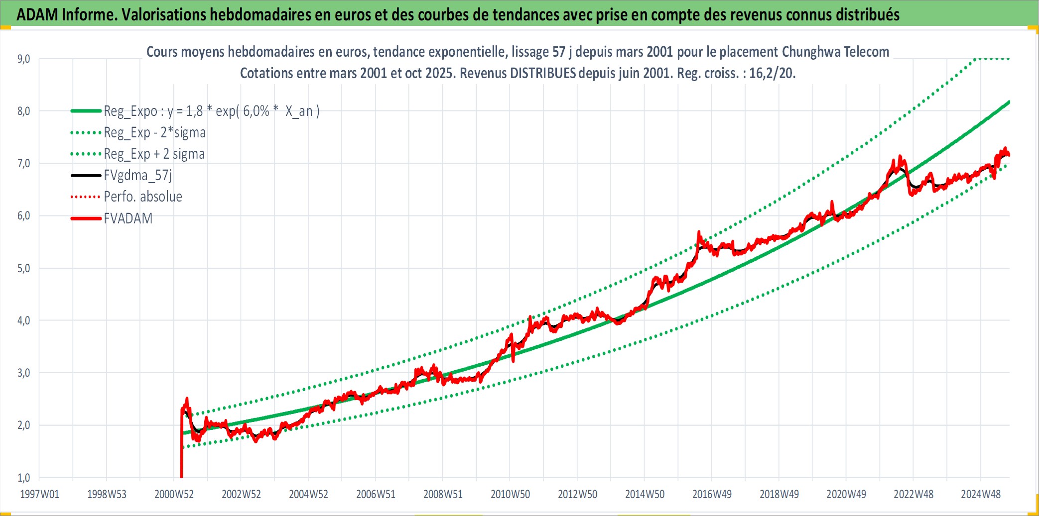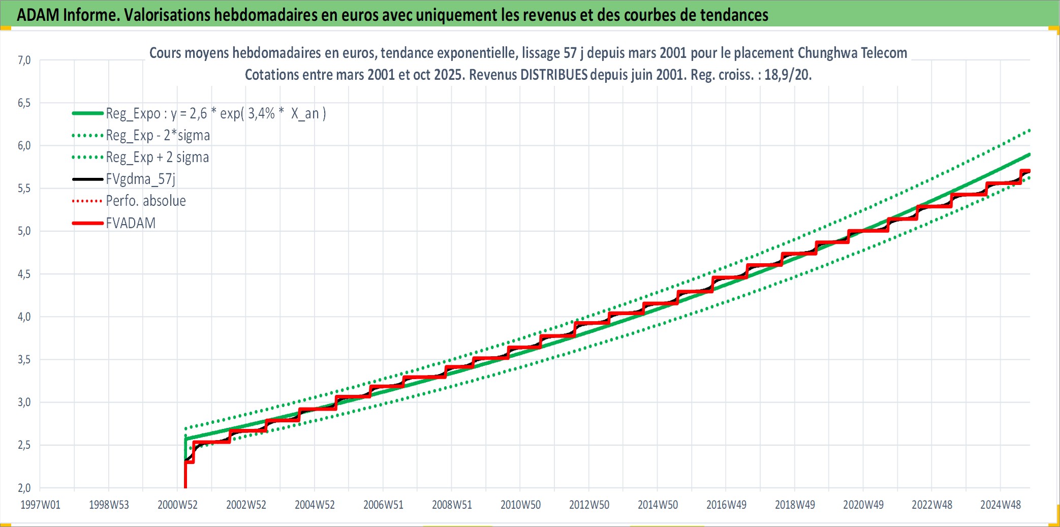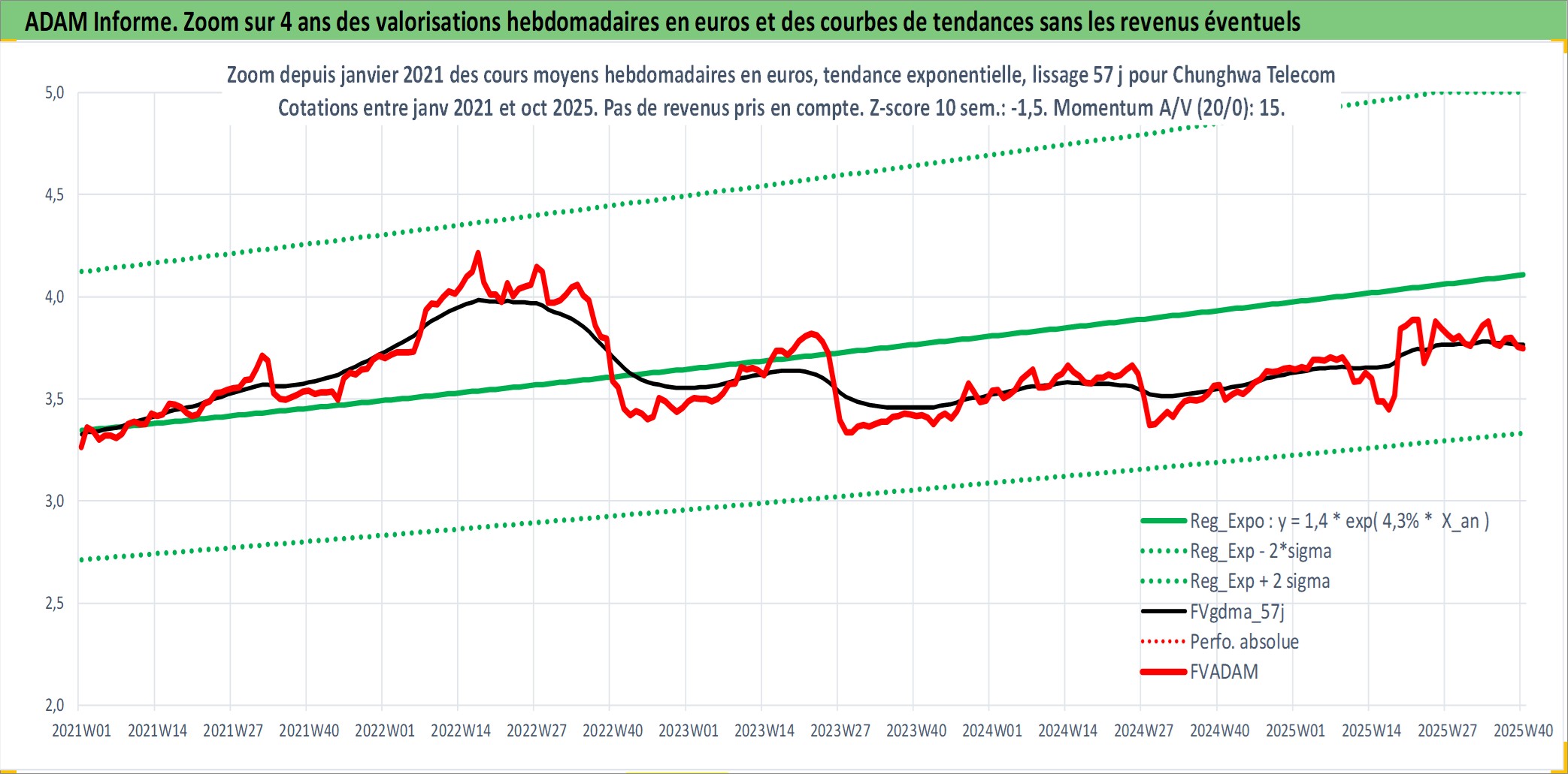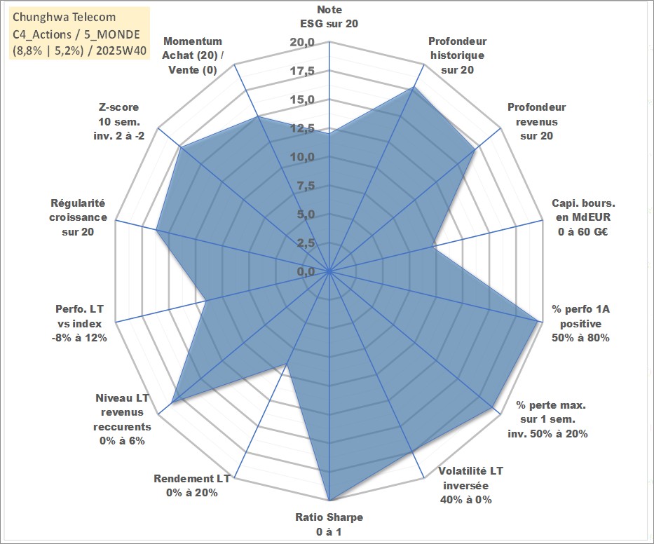 Site dédié aux investisseursPage dédiée sur site financeAnalyse des valorisations hebdomadaires de l'action Chunghwa Telecom . Cet actif est cote en TWD. Les valorisations sont en contrevaleur EURO et couvrent les semaines 2001W12 a 2025W40. Les revenus de cet actif financier sont pris en compte depuis la semaine 2001W25. La note globale ESG de cet actif est estimee a 12.0 (apres rebasage entre 0 et 20).