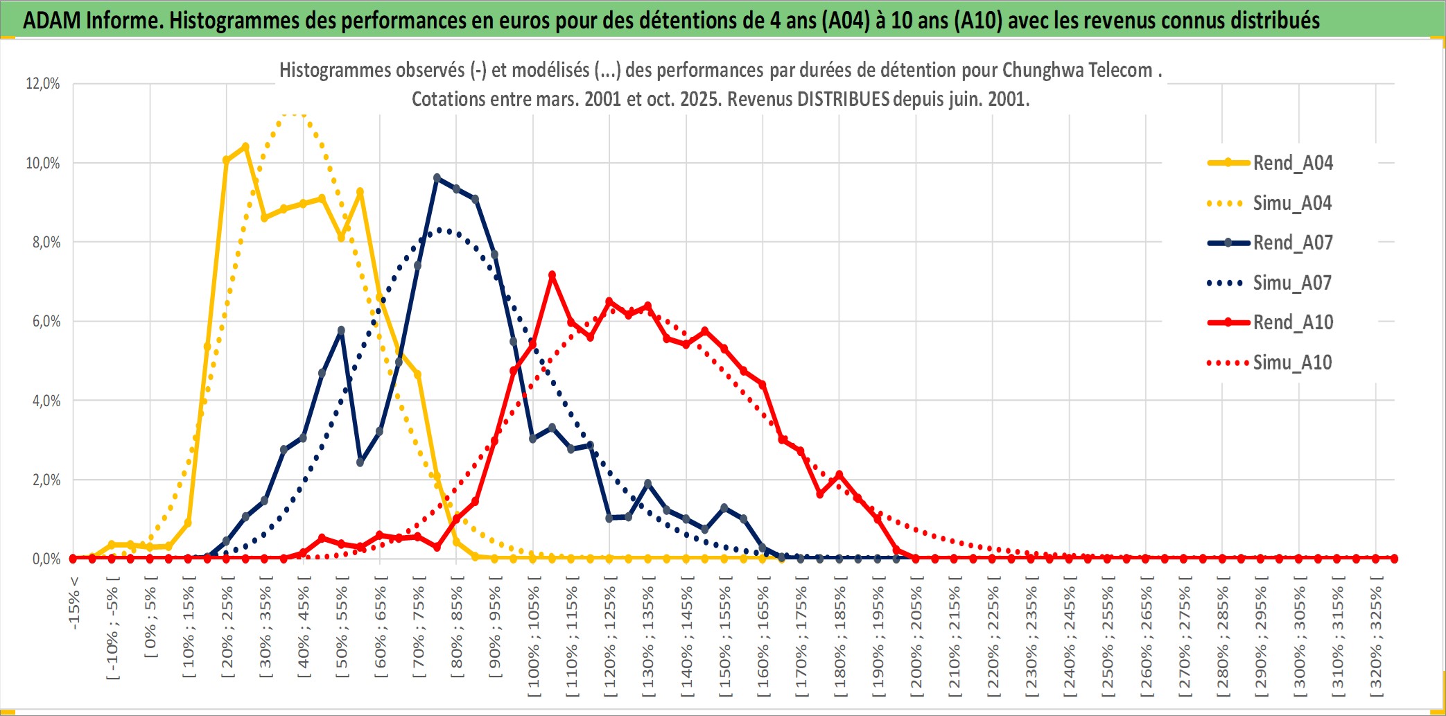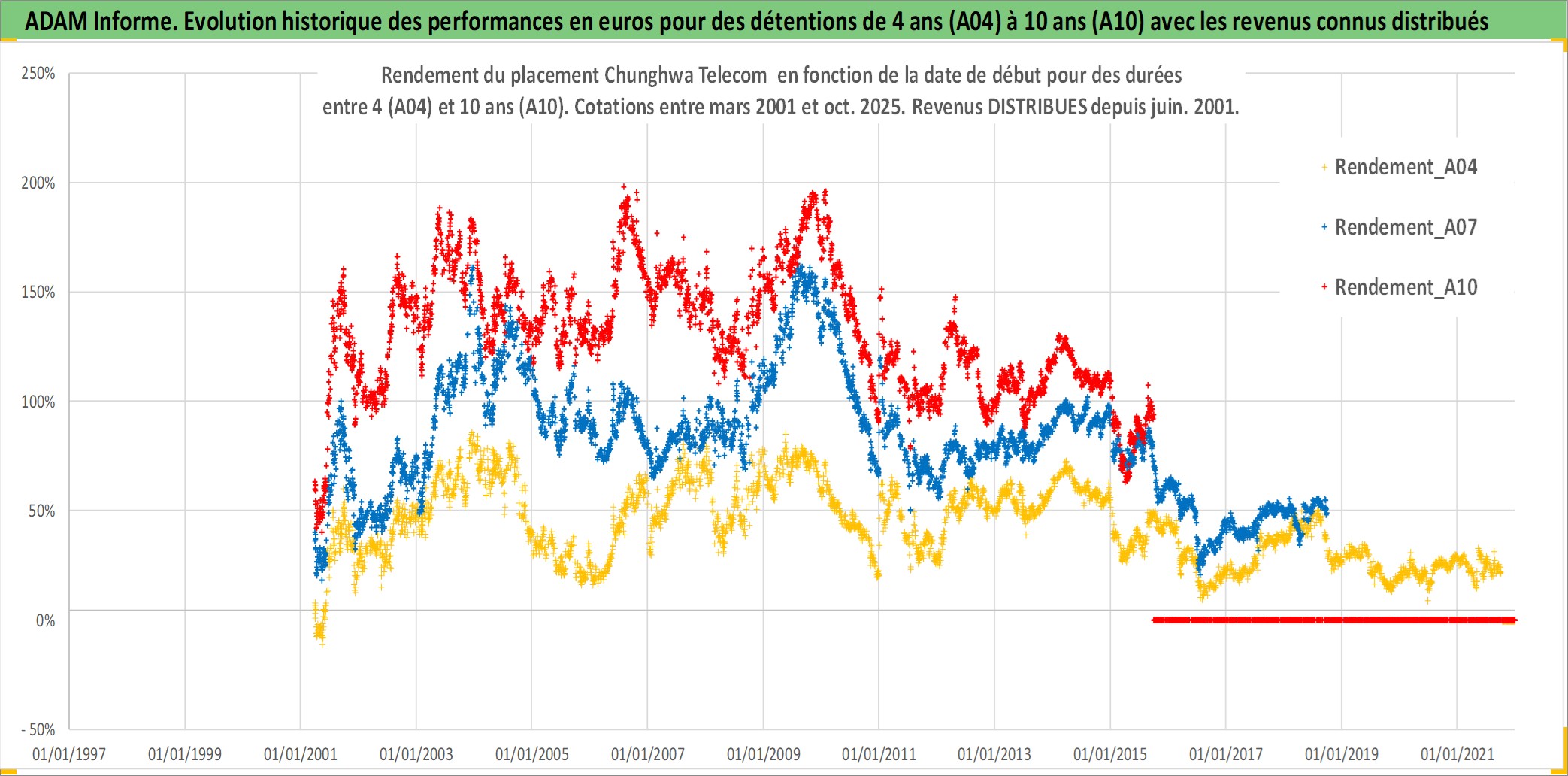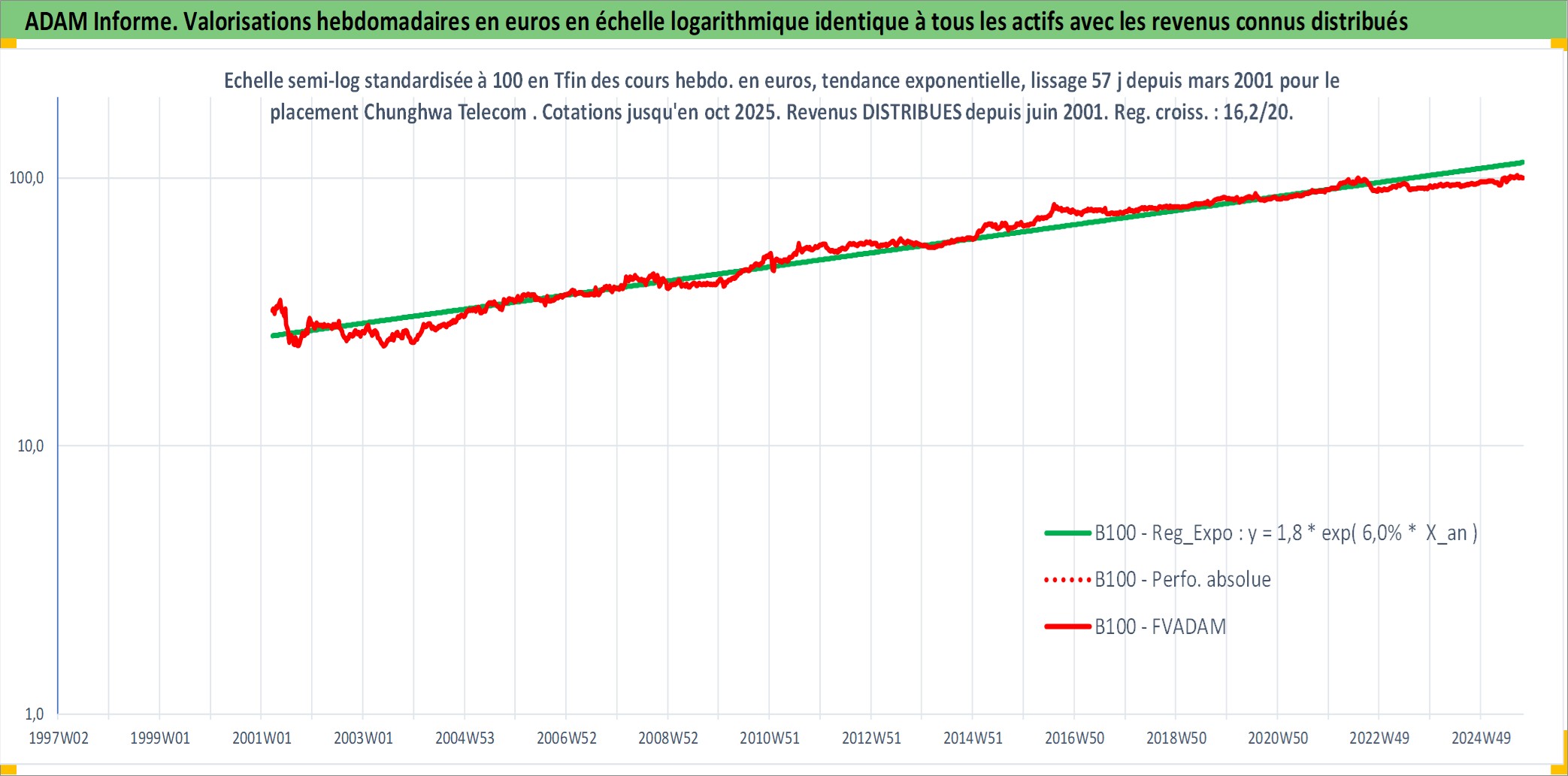 Site dédié aux investisseursPage dédiée sur site financeAnalyse des valorisations hebdomadaires de l'action Chunghwa Telecom . Cet actif est cote en TWD. Les valorisations sont en contrevaleur EURO et couvrent les semaines 2001W12 a 2025W40. Les revenus de cet actif financier sont pris en compte depuis la semaine 2001W25. La note globale ESG de cet actif est estimee a 12.0 (apres rebasage entre 0 et 20).