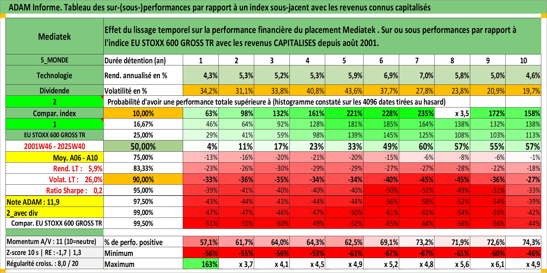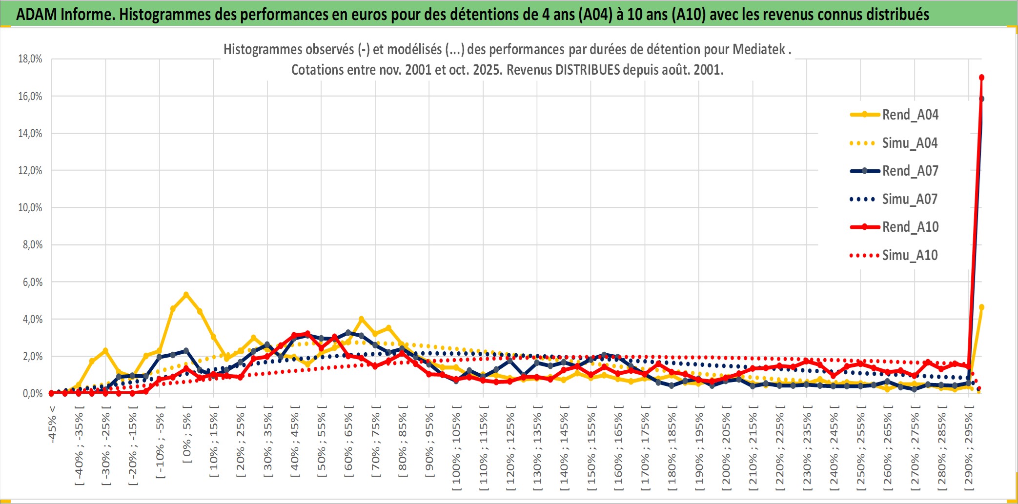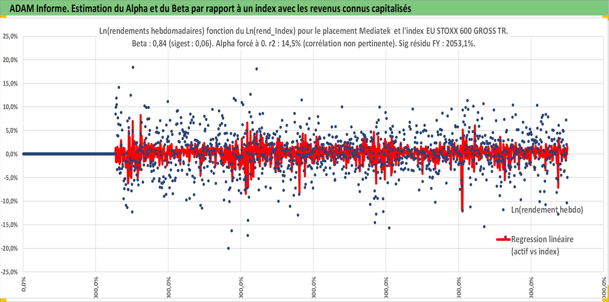 Site dédié aux investisseursPage dédiée sur site financeAnalyse des valorisations hebdomadaires de l'action Mediatek . Cet actif est cote en TWD. Les valorisations sont en contrevaleur EURO et couvrent les semaines 2001W46 a 2025W40. Les revenus de cet actif financier sont pris en compte depuis la semaine 2001W35. La note globale ESG de cet actif est estimee a 10.0 (apres rebasage entre 0 et 20).