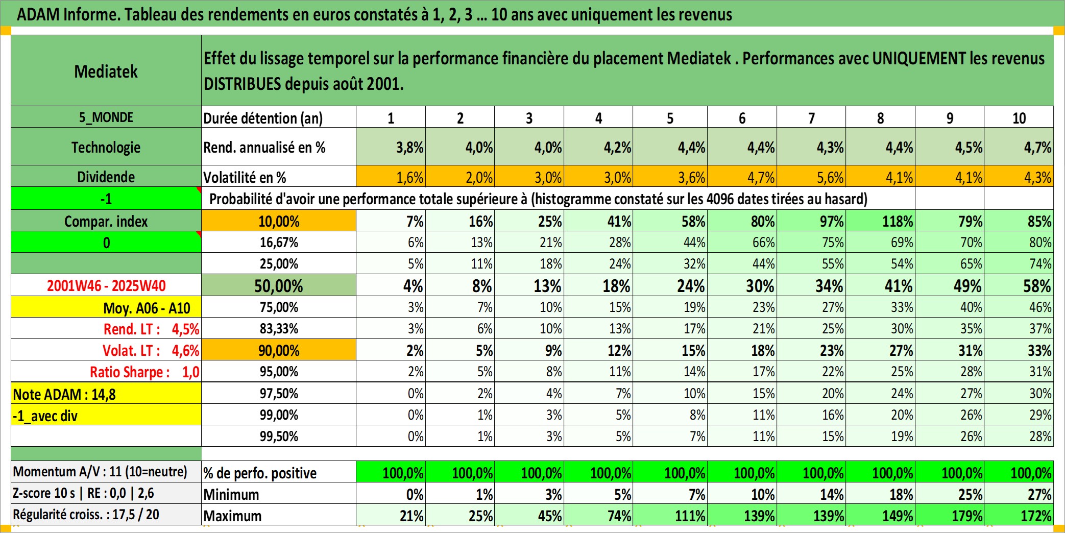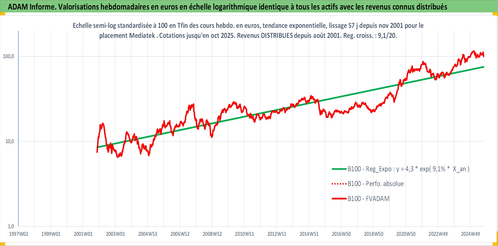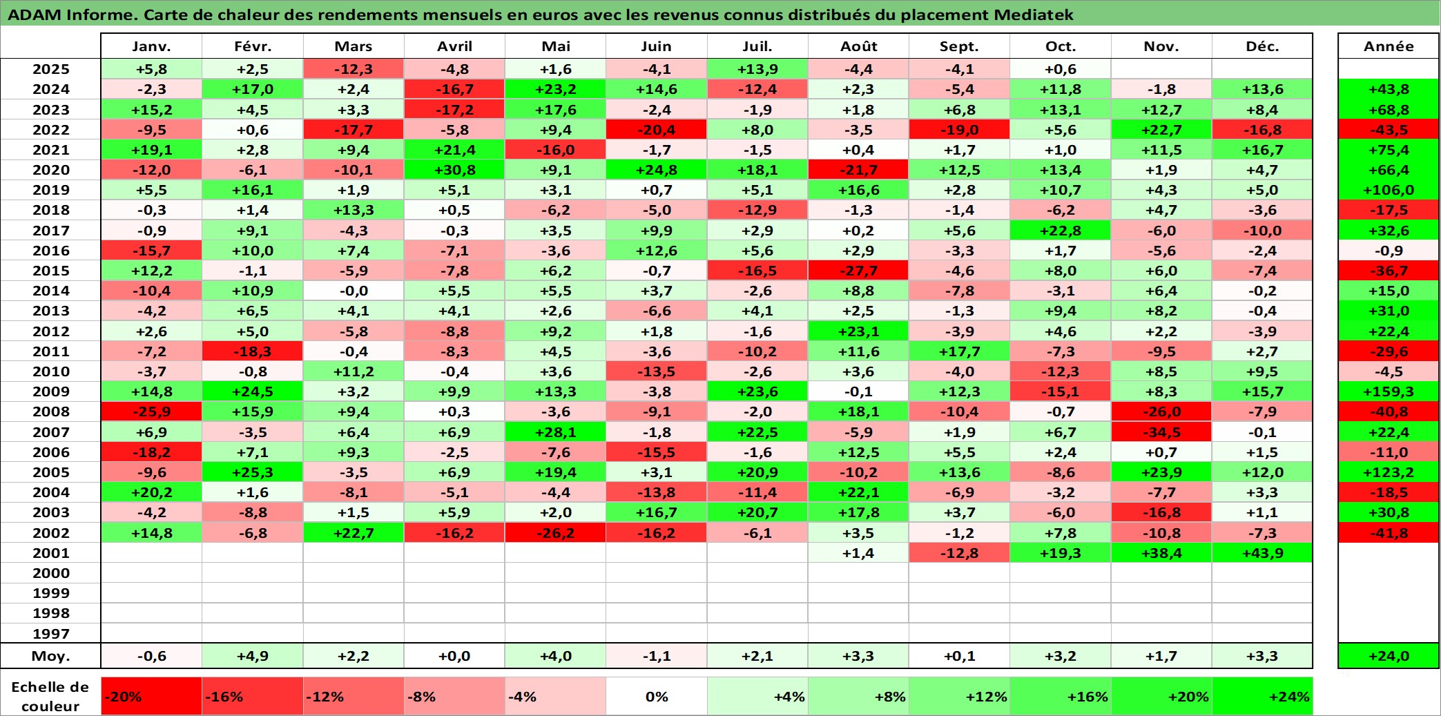 Site dédié aux investisseursPage dédiée sur site financeAnalyse des valorisations hebdomadaires de l'action Mediatek . Cet actif est cote en TWD. Les valorisations sont en contrevaleur EURO et couvrent les semaines 2001W46 a 2025W40. Les revenus de cet actif financier sont pris en compte depuis la semaine 2001W35. La note globale ESG de cet actif est estimee a 10.0 (apres rebasage entre 0 et 20).