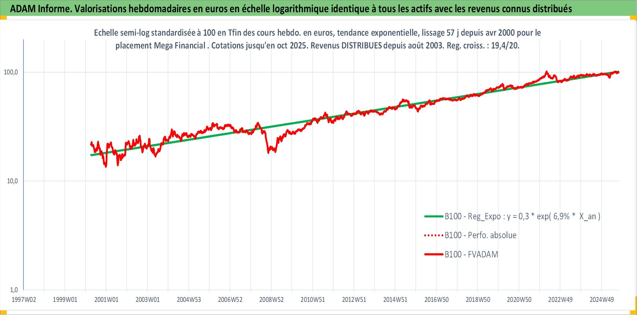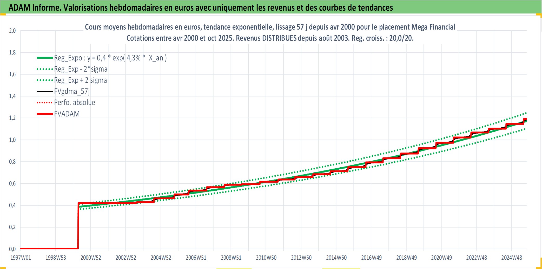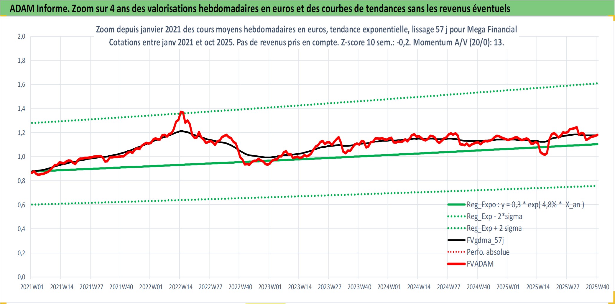 Site dédié aux investisseursPage dédiée sur site financeAnalyse des valorisations hebdomadaires de l'action Mega Financial . Cet actif est cote en TWD. Les valorisations sont en contrevaleur EURO et couvrent les semaines 2000W15 a 2025W40. Les revenus de cet actif financier sont pris en compte depuis la semaine 2003W32. La note globale ESG de cet actif est estimee a 8.0 (apres rebasage entre 0 et 20).
