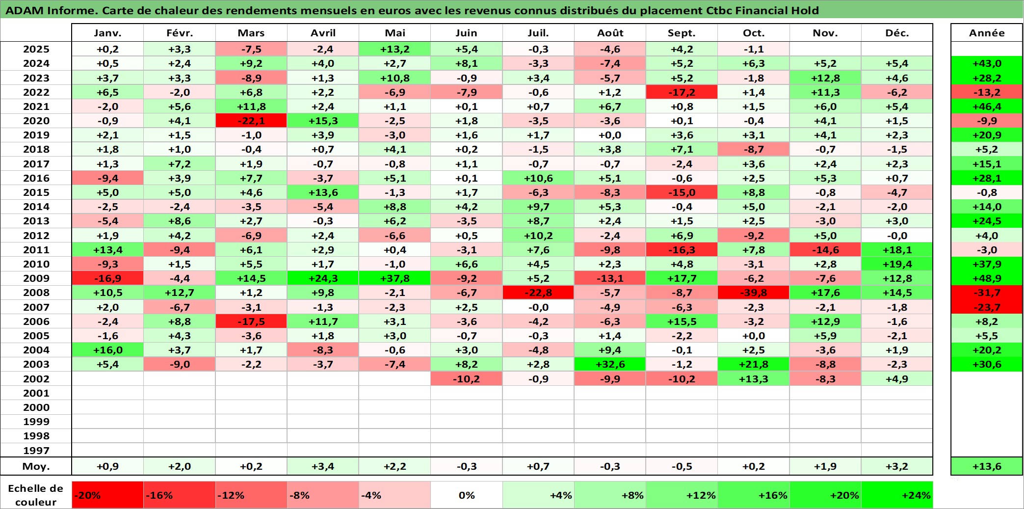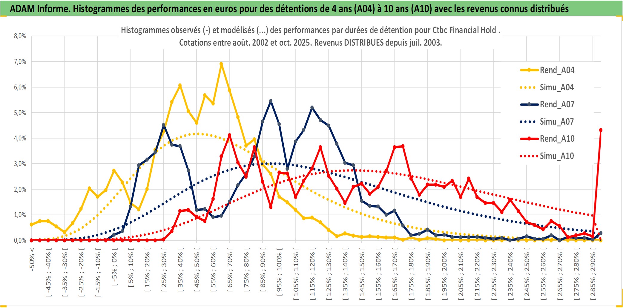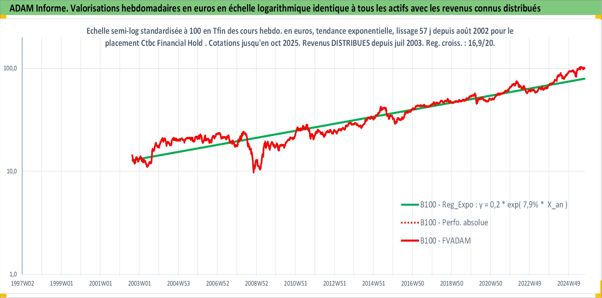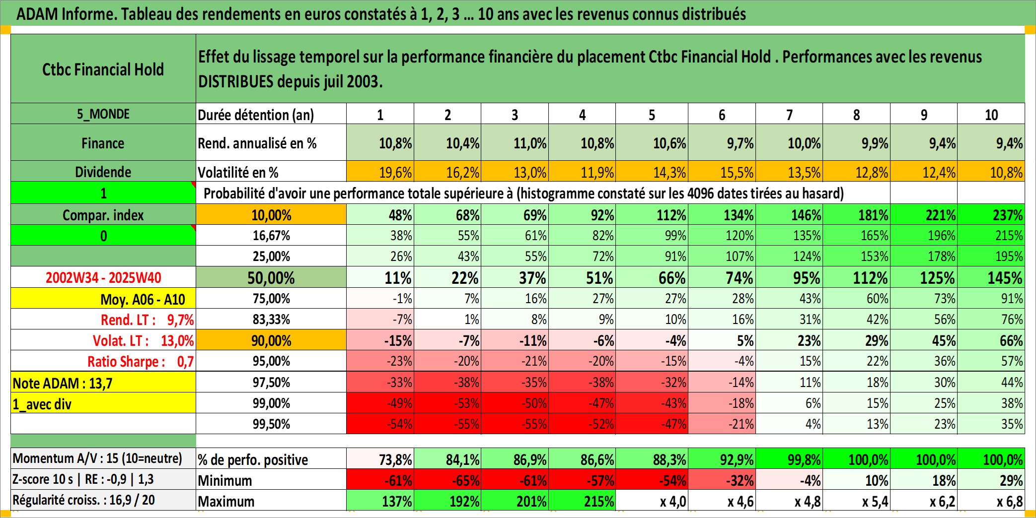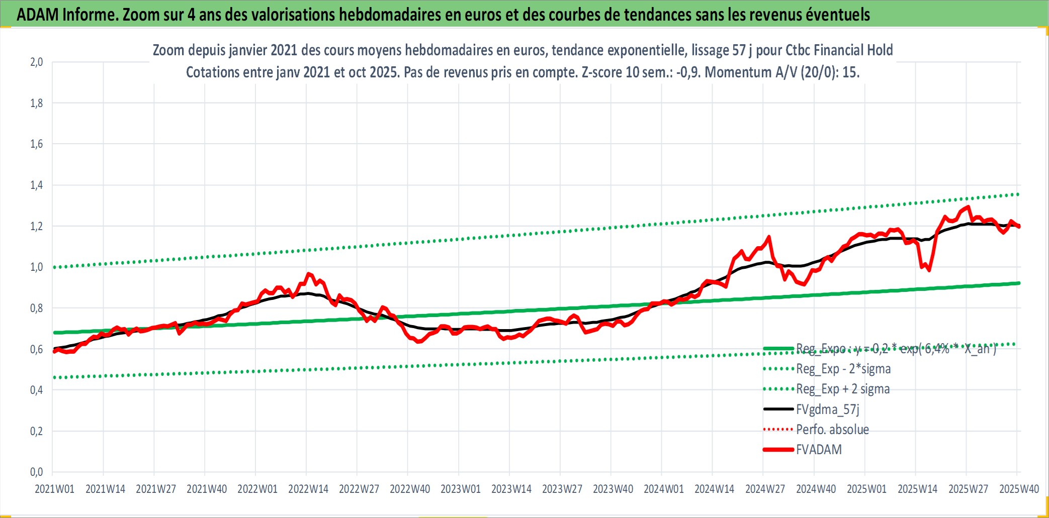 Site dédié aux investisseursPage dédiée sur site financeAnalyse des valorisations hebdomadaires de l'action Ctbc Financial Hold . Cet actif est cote en TWD. Les valorisations sont en contrevaleur EURO et couvrent les semaines 2002W34 a 2025W40. Les revenus de cet actif financier sont pris en compte depuis la semaine 2003W27. La note globale ESG de cet actif est estimee a 10.0 (apres rebasage entre 0 et 20).