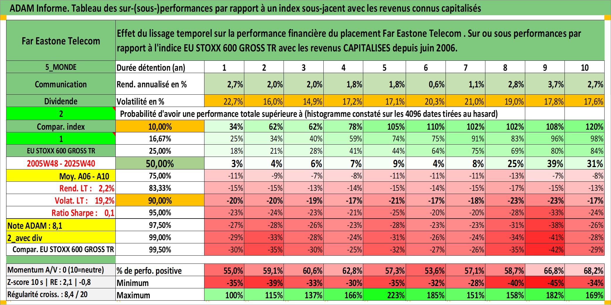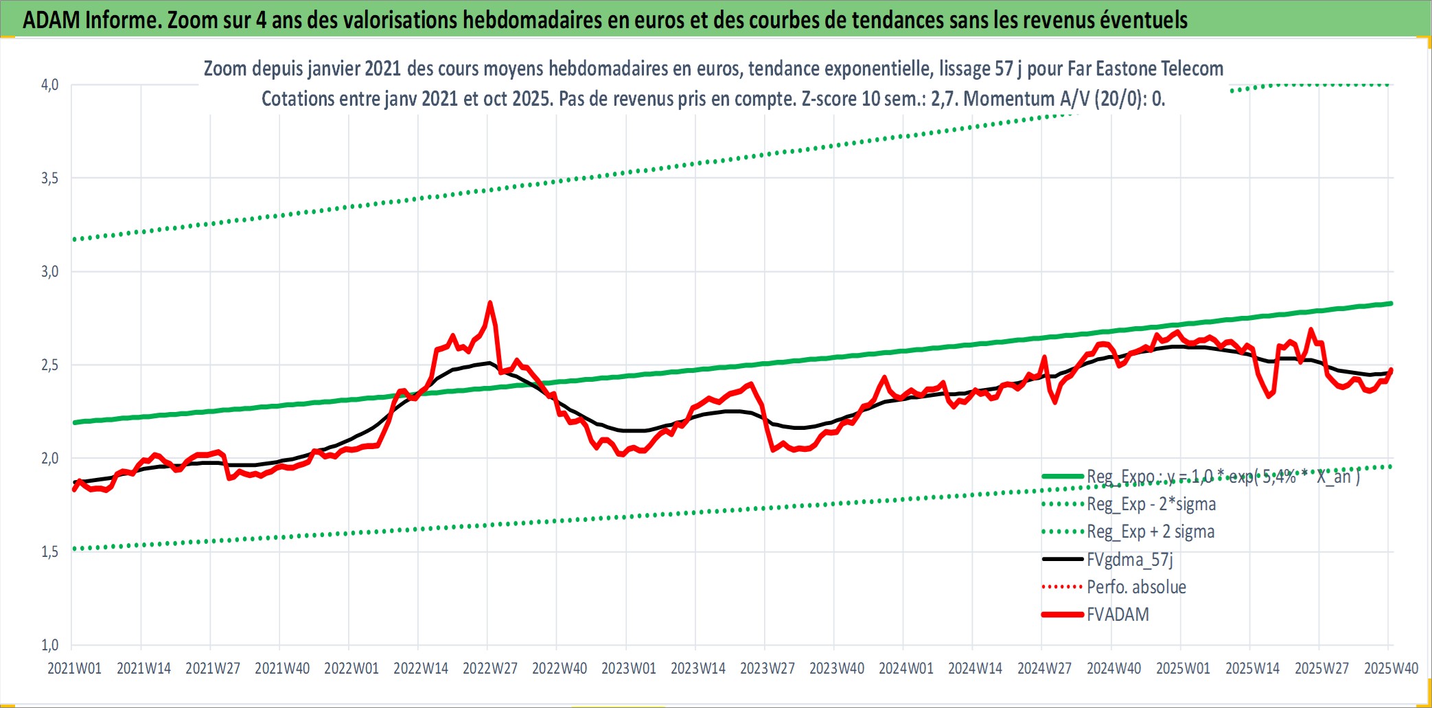 Site dédié aux investisseursPage dédiée sur site financeAnalyse des valorisations hebdomadaires de l'action Far Eastone Telecom . Cet actif est cote en TWD. Les valorisations sont en contrevaleur EURO et couvrent les semaines 2005W48 a 2025W40. Les revenus de cet actif financier sont pris en compte depuis la semaine 2006W24. La note globale ESG de cet actif est estimee a 10.0 (apres rebasage entre 0 et 20).