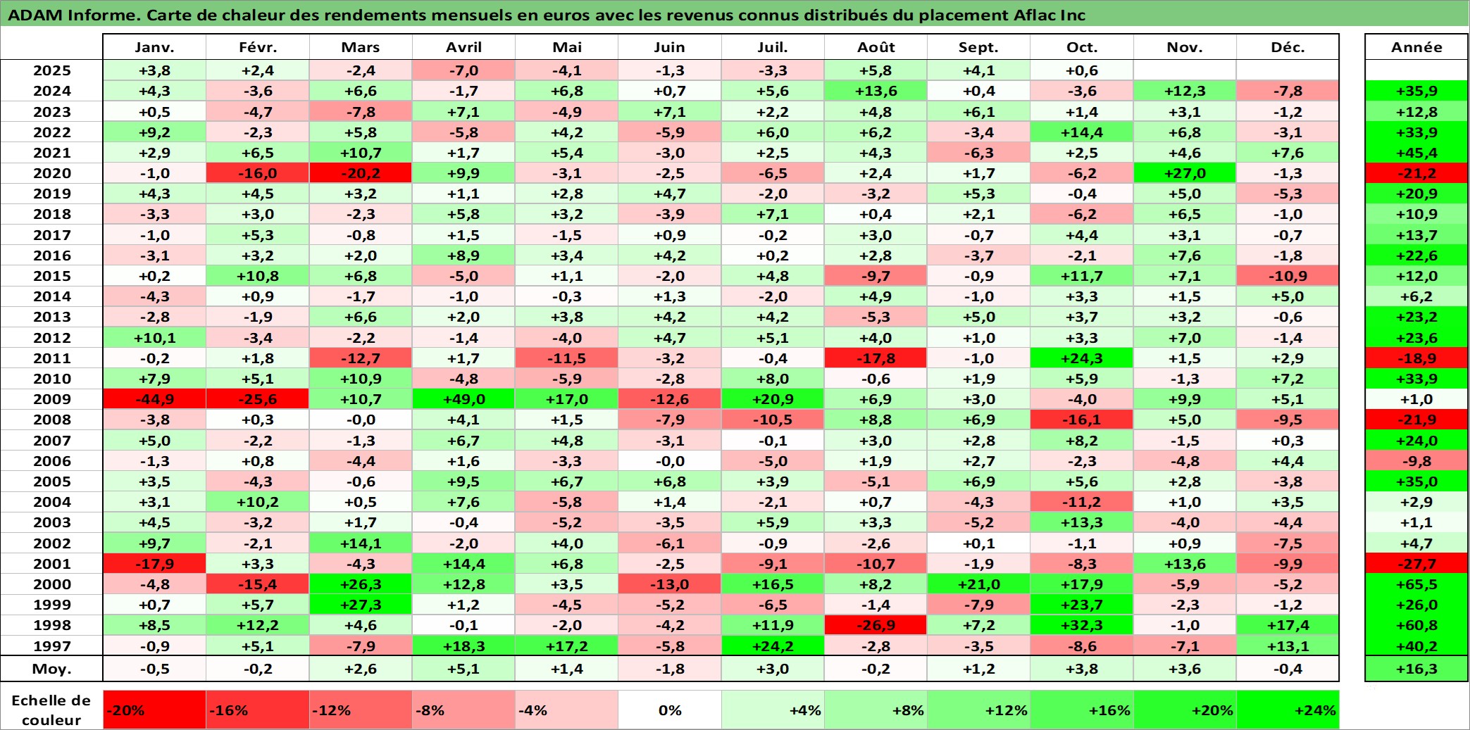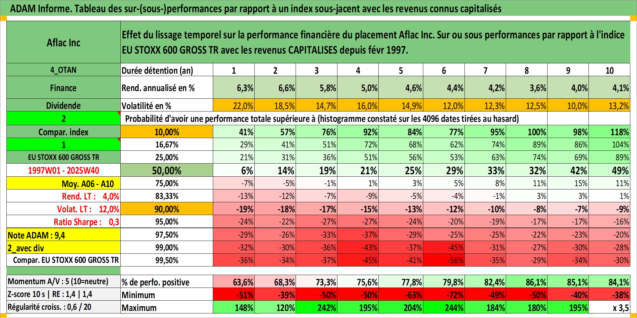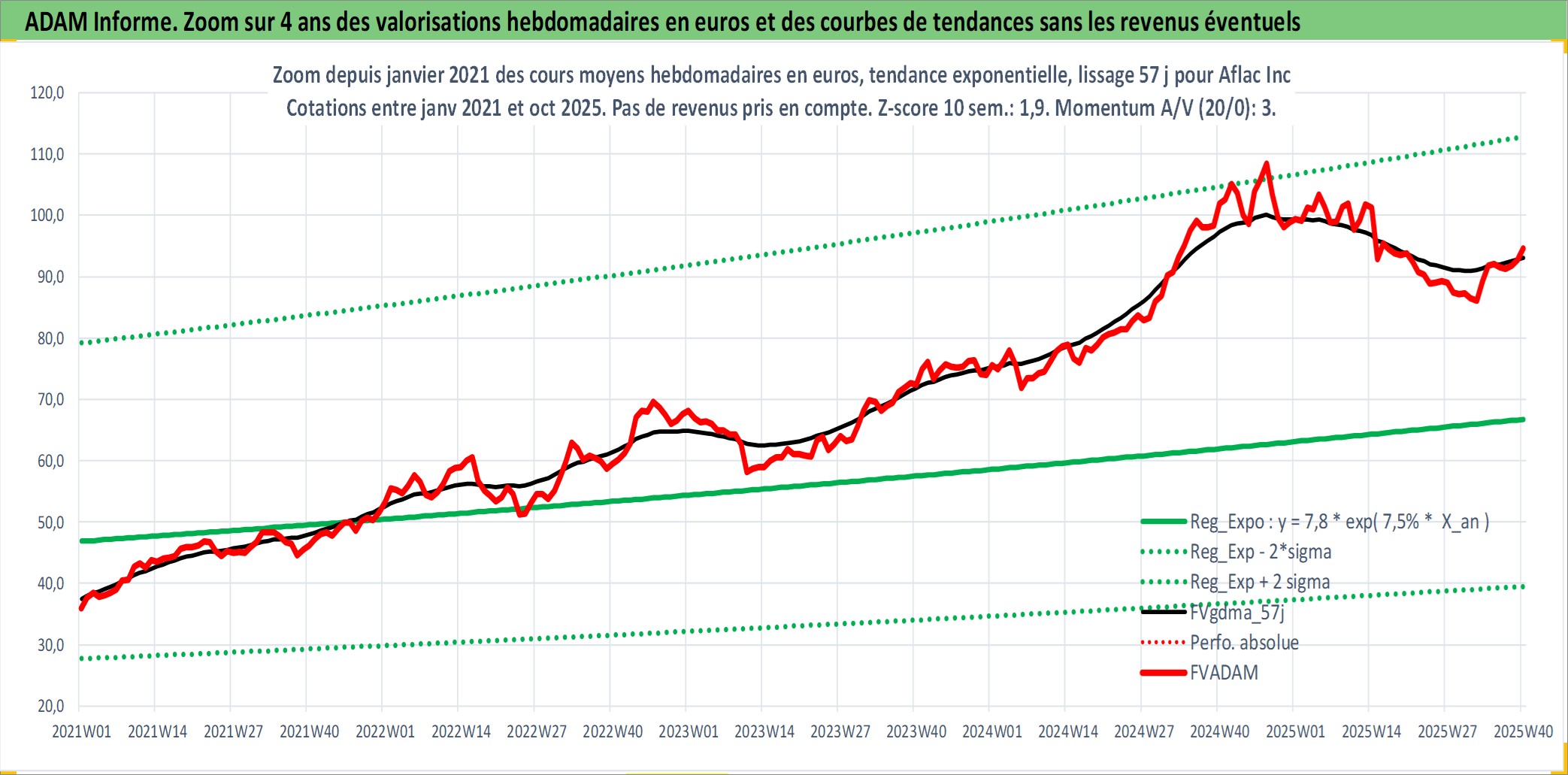 Site dédié aux investisseursPage dédiée sur site financeAnalyse des valorisations hebdomadaires de l'action Aflac Inc. Cet actif est cote en USD. Les valorisations sont en contrevaleur EURO et couvrent les semaines 1997W01 a 2025W40. Les revenus de cet actif financier sont pris en compte depuis la semaine 1997W08. La note globale ESG de cet actif est estimee a 12.0 (apres rebasage entre 0 et 20).