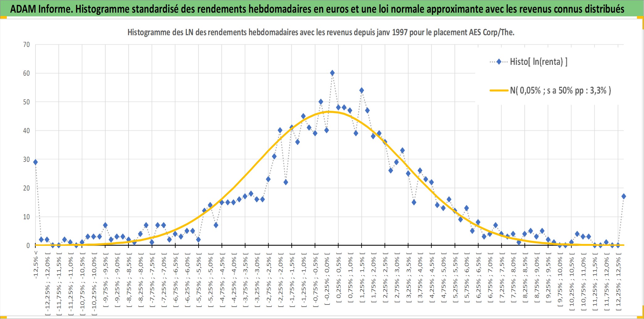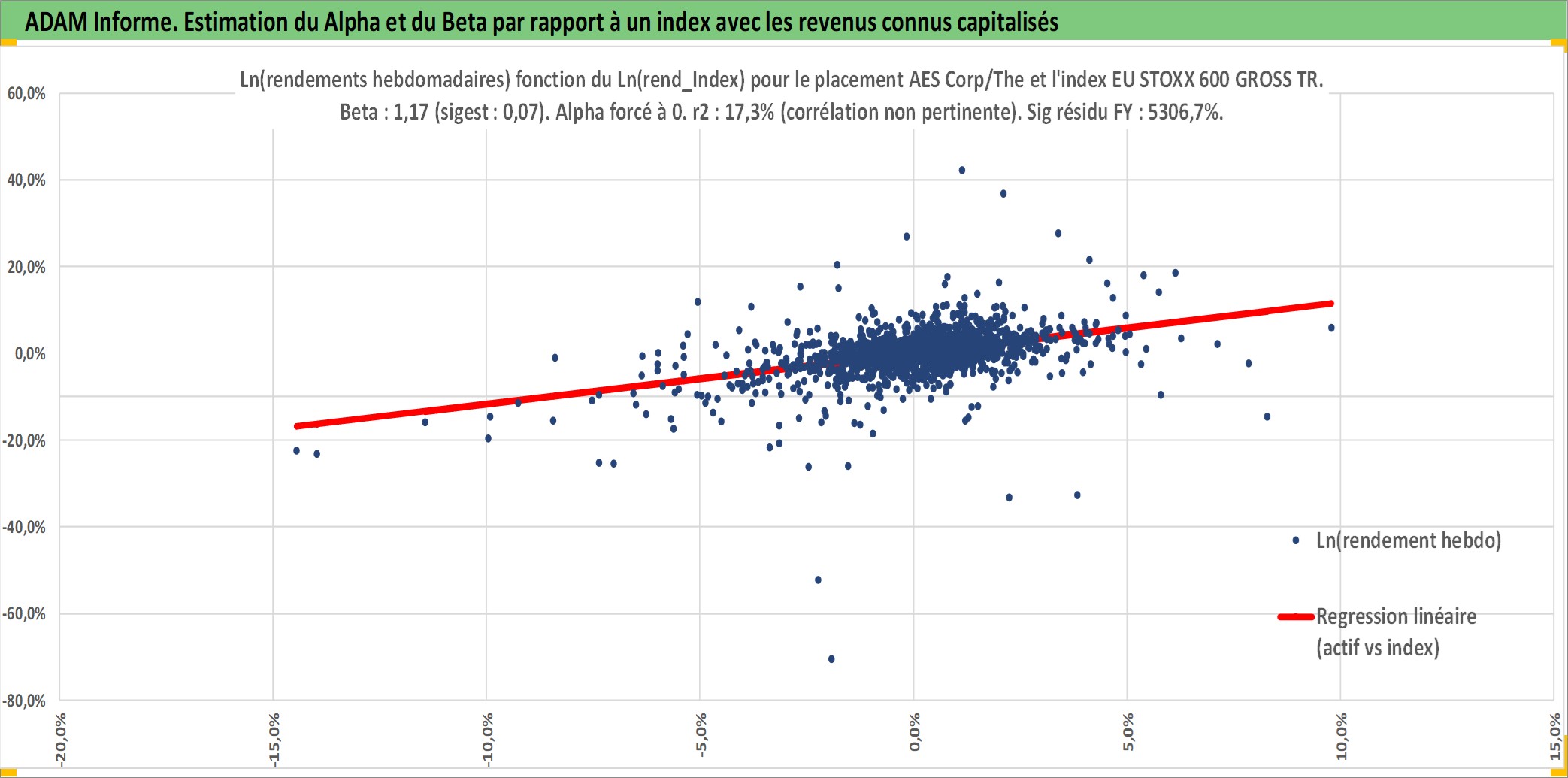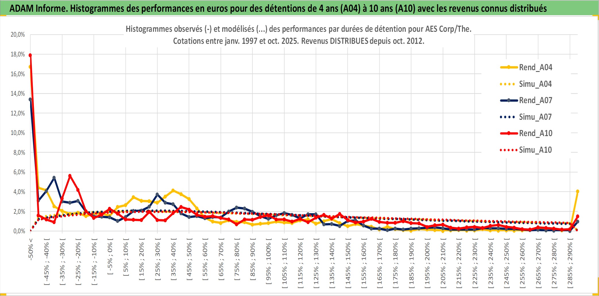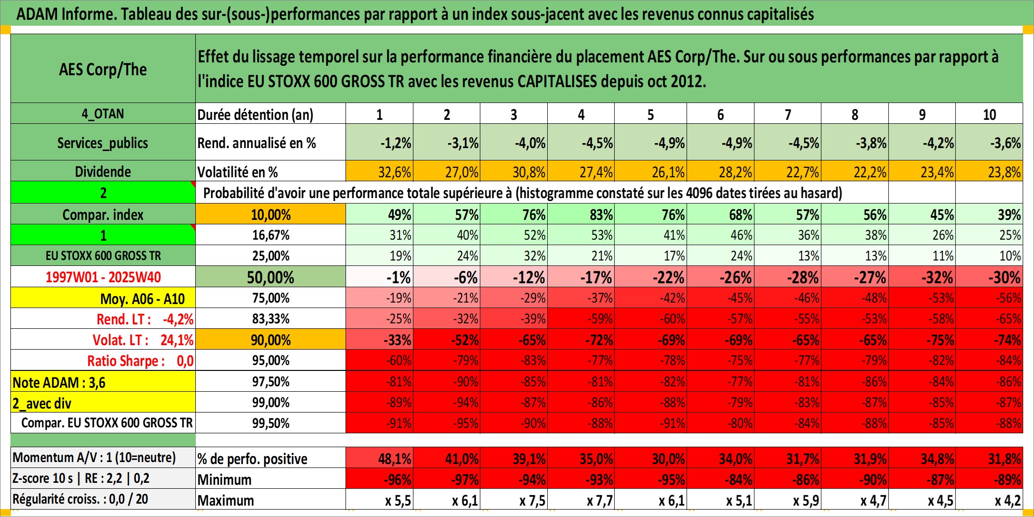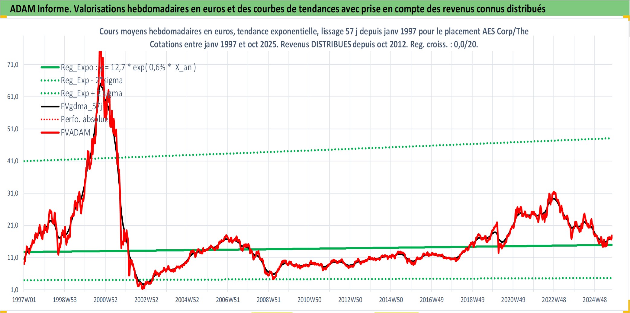 Site dédié aux investisseursPage dédiée sur site financeAnalyse des valorisations hebdomadaires de l'action AES Corp/The. Cet actif est cote en USD. Les valorisations sont en contrevaleur EURO et couvrent les semaines 1997W01 a 2025W40. Les revenus de cet actif financier sont pris en compte depuis la semaine 2012W43. La note globale ESG de cet actif est estimee a 4.0 (apres rebasage entre 0 et 20).