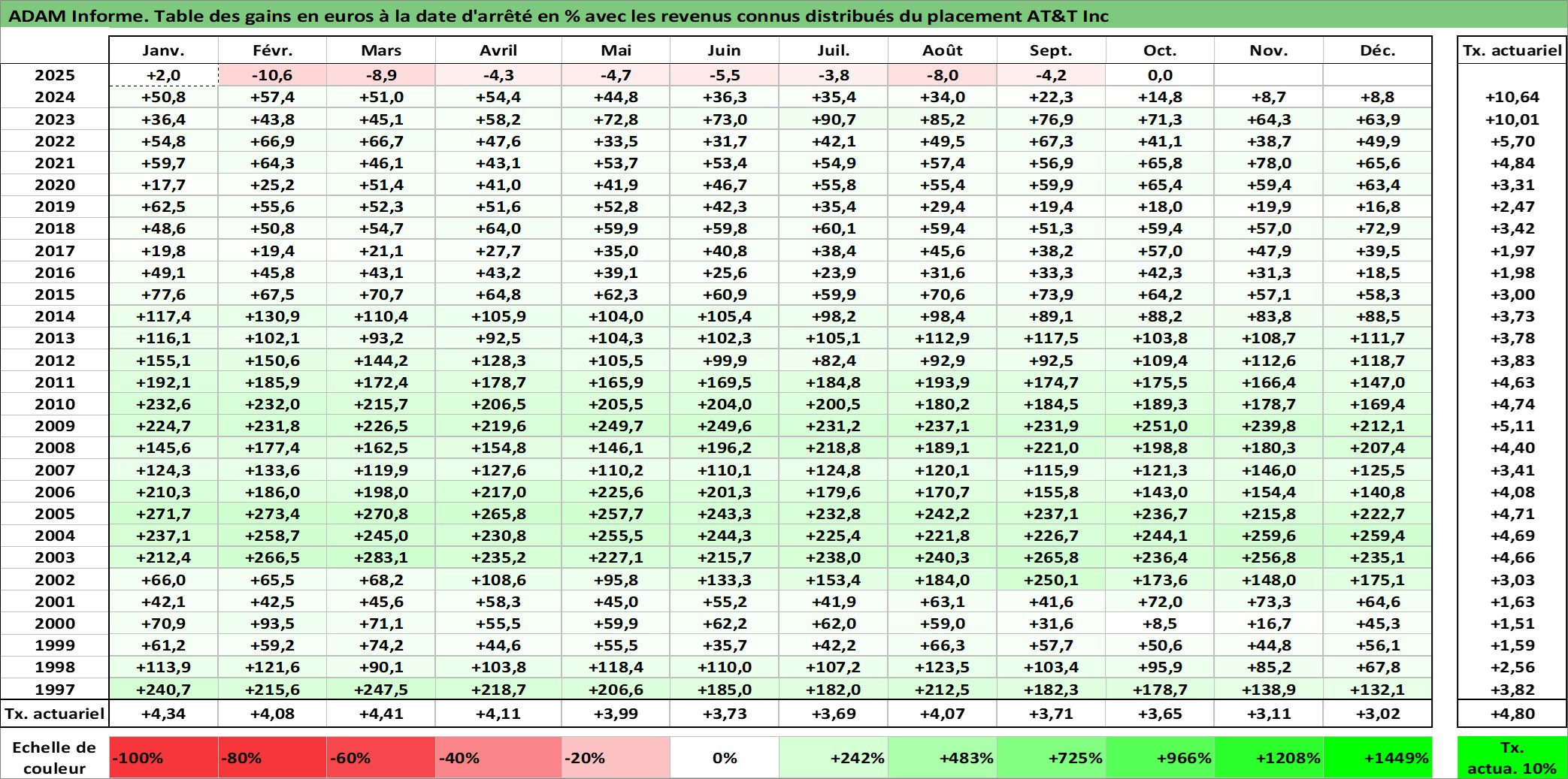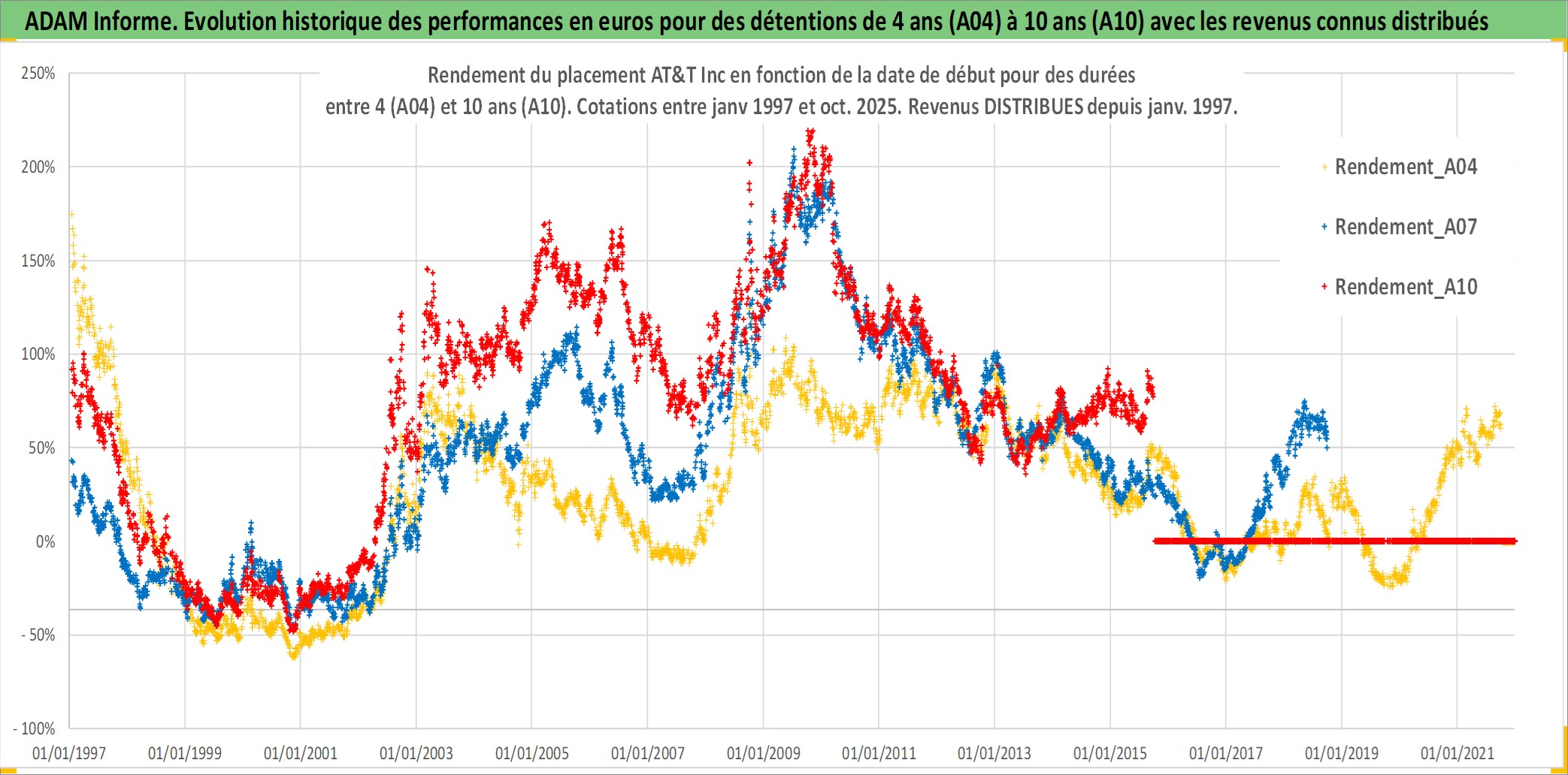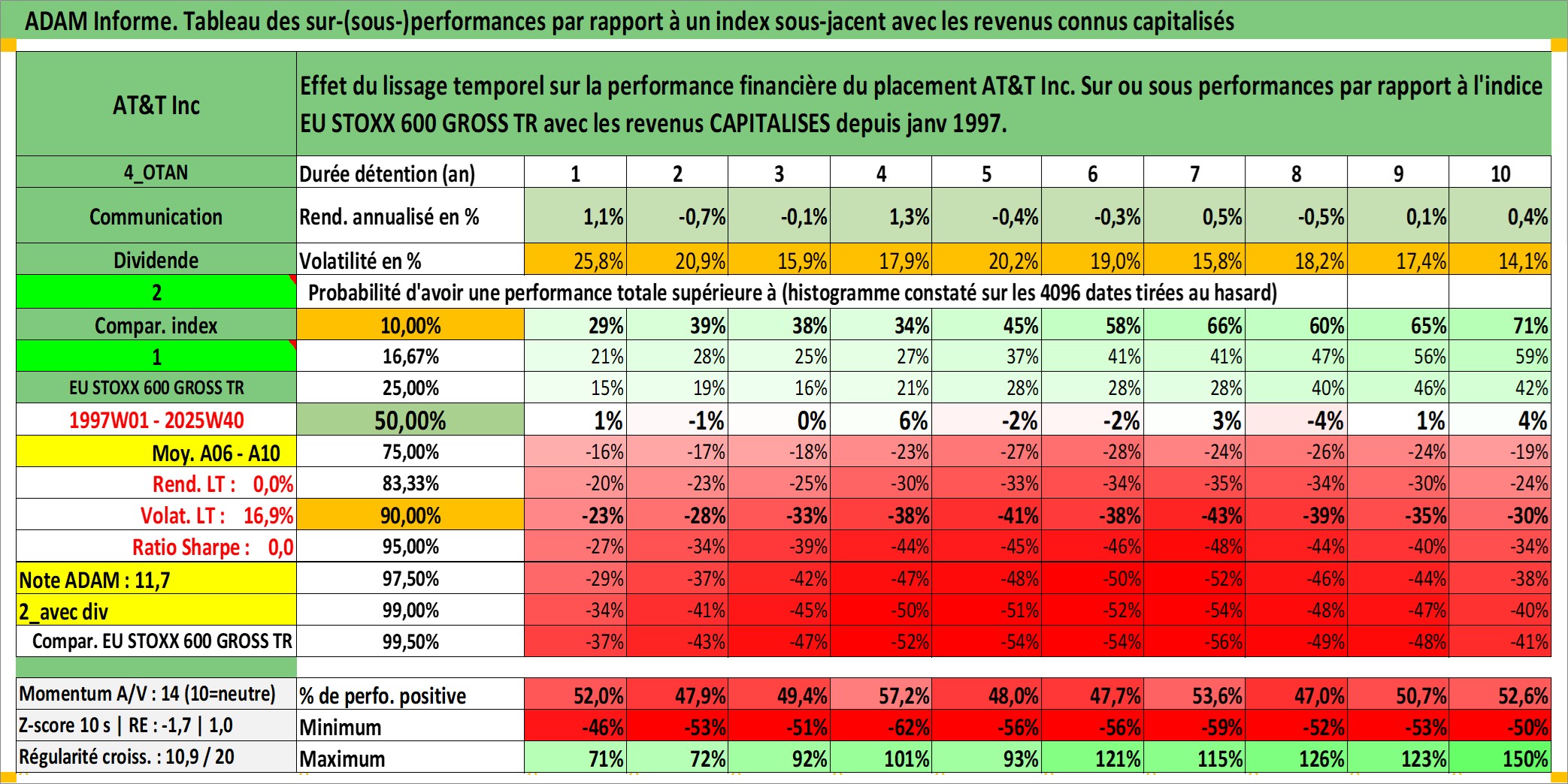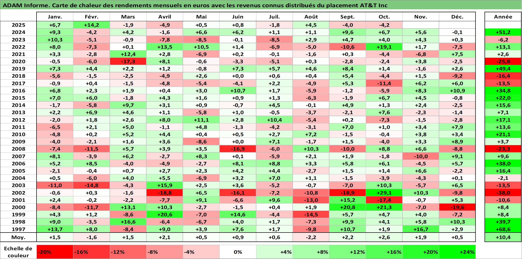Site dédié aux investisseursPage dédiée sur site financeAnalyse des valorisations hebdomadaires de l'action AT&T Inc. Cet actif est cote en USD. Les valorisations sont en contrevaleur EURO et couvrent les semaines 1997W01 a 2025W40. Les revenus de cet actif financier sont pris en compte depuis la semaine 1997W02. La note globale ESG de cet actif est estimee a 9.0 (apres rebasage entre 0 et 20).