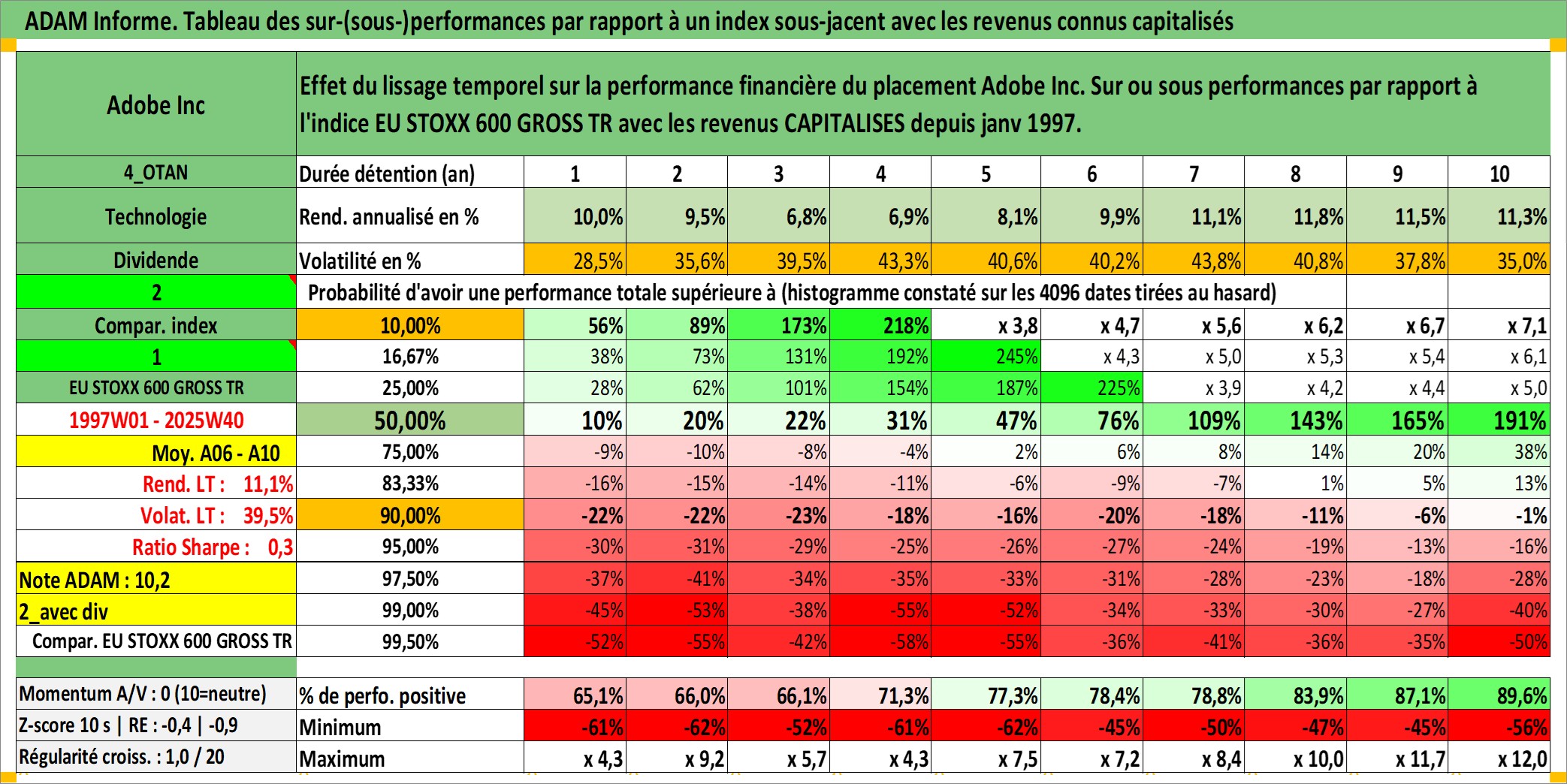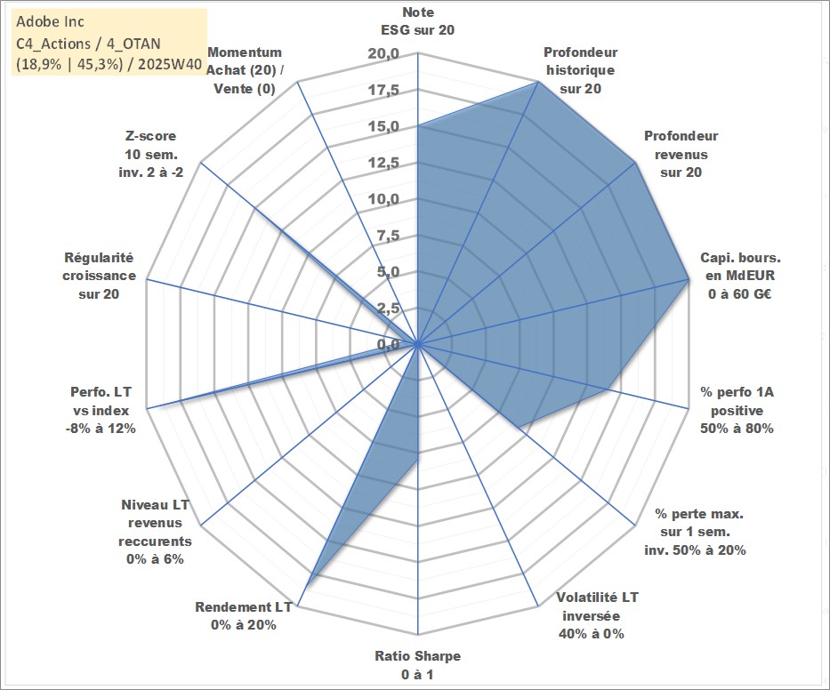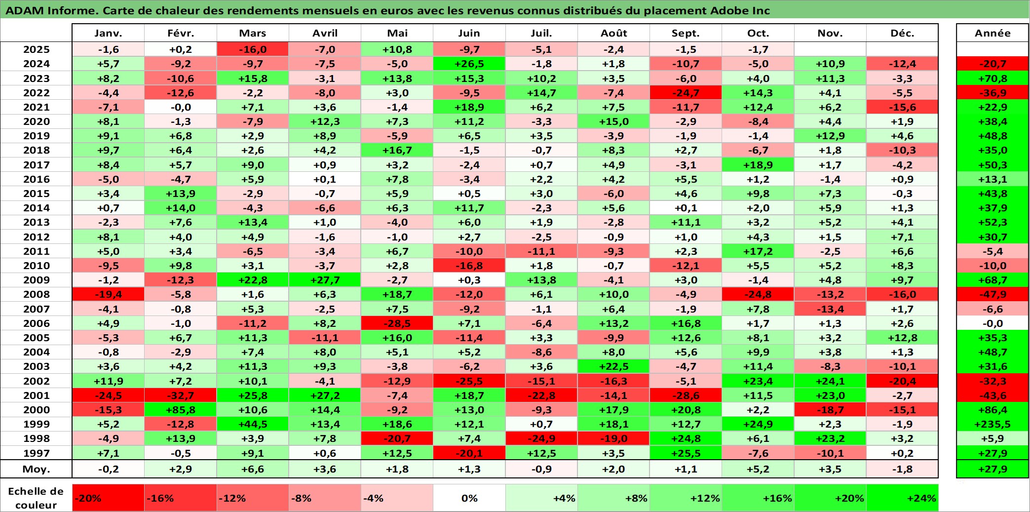 Site dédié aux investisseursPage dédiée sur site financeAnalyse des valorisations hebdomadaires de l'action Adobe Inc. Cet actif est cote en USD. Les valorisations sont en contrevaleur EURO et couvrent les semaines 1997W01 a 2025W40. Les revenus de cet actif financier sont pris en compte depuis la semaine 1997W03. La note globale ESG de cet actif est estimee a 15.0 (apres rebasage entre 0 et 20).