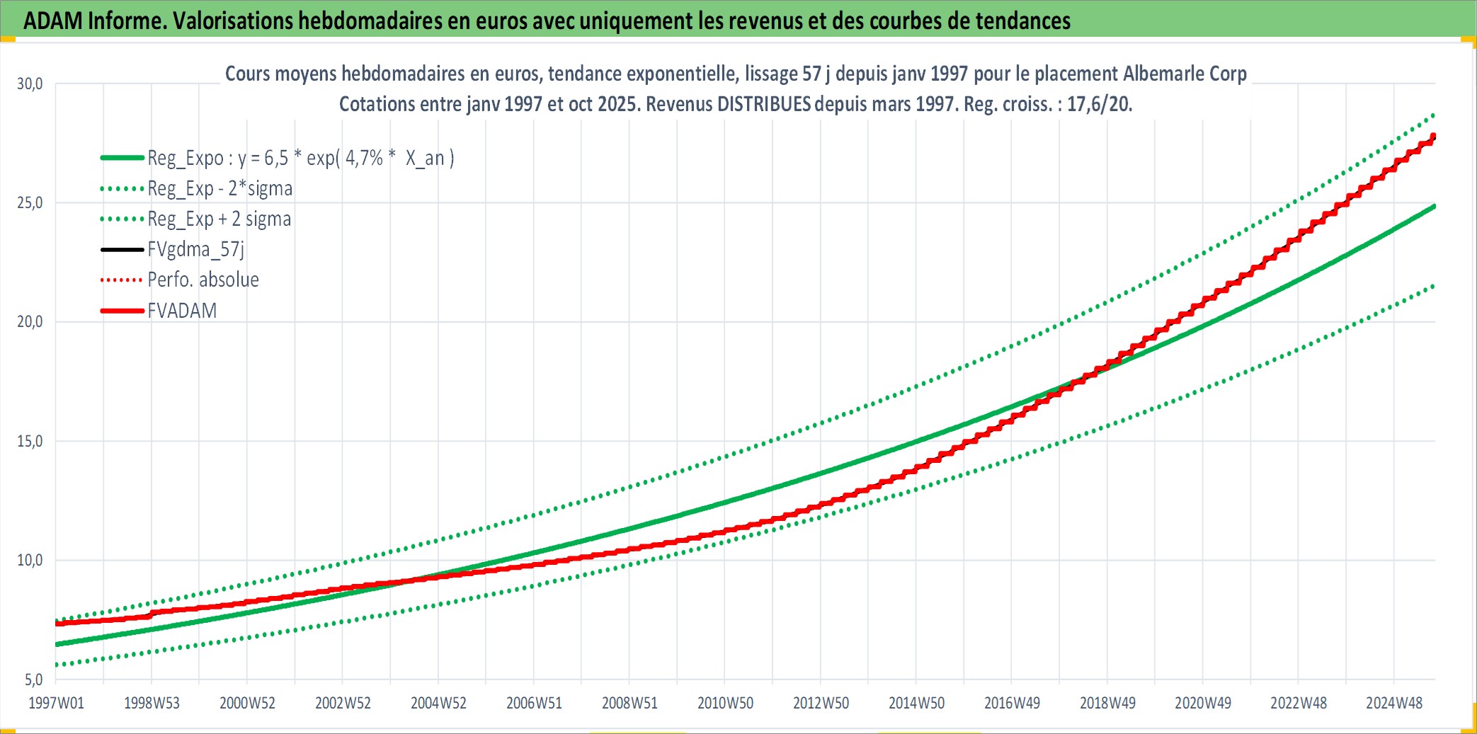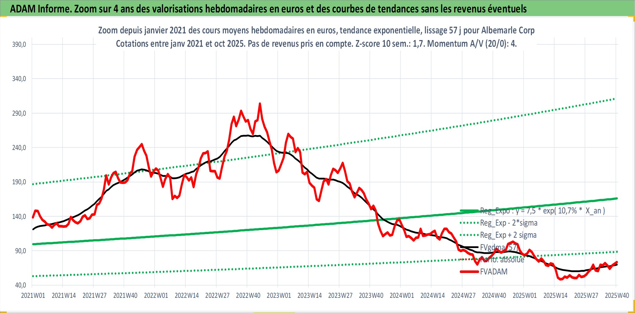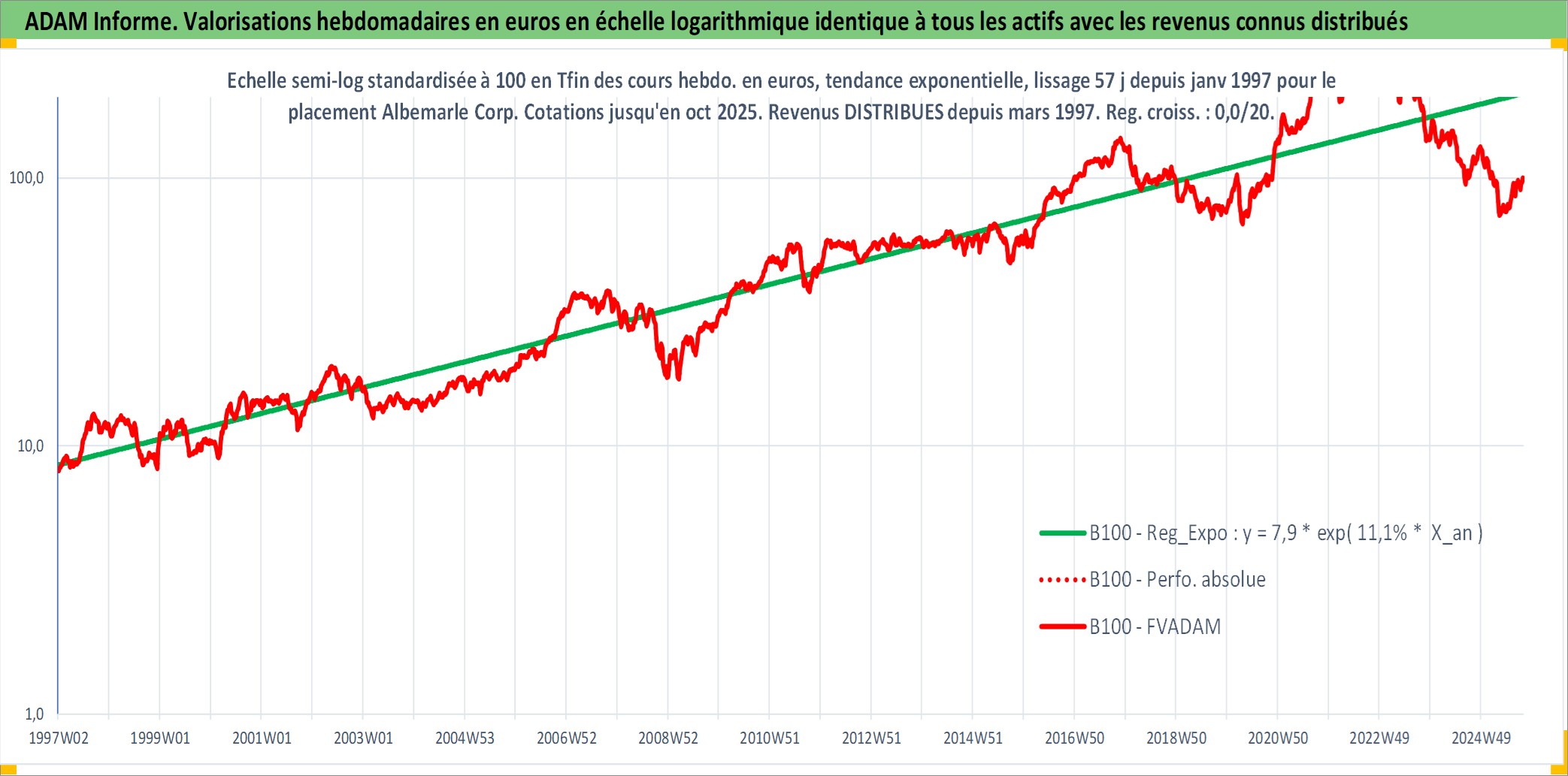 Site dédié aux investisseursPage dédiée sur site financeAnalyse des valorisations hebdomadaires de l'action Albemarle Corp. Cet actif est cote en USD. Les valorisations sont en contrevaleur EURO et couvrent les semaines 1997W01 a 2025W40. Les revenus de cet actif financier sont pris en compte depuis la semaine 1997W10. La note globale ESG de cet actif est estimee a 6.0 (apres rebasage entre 0 et 20).