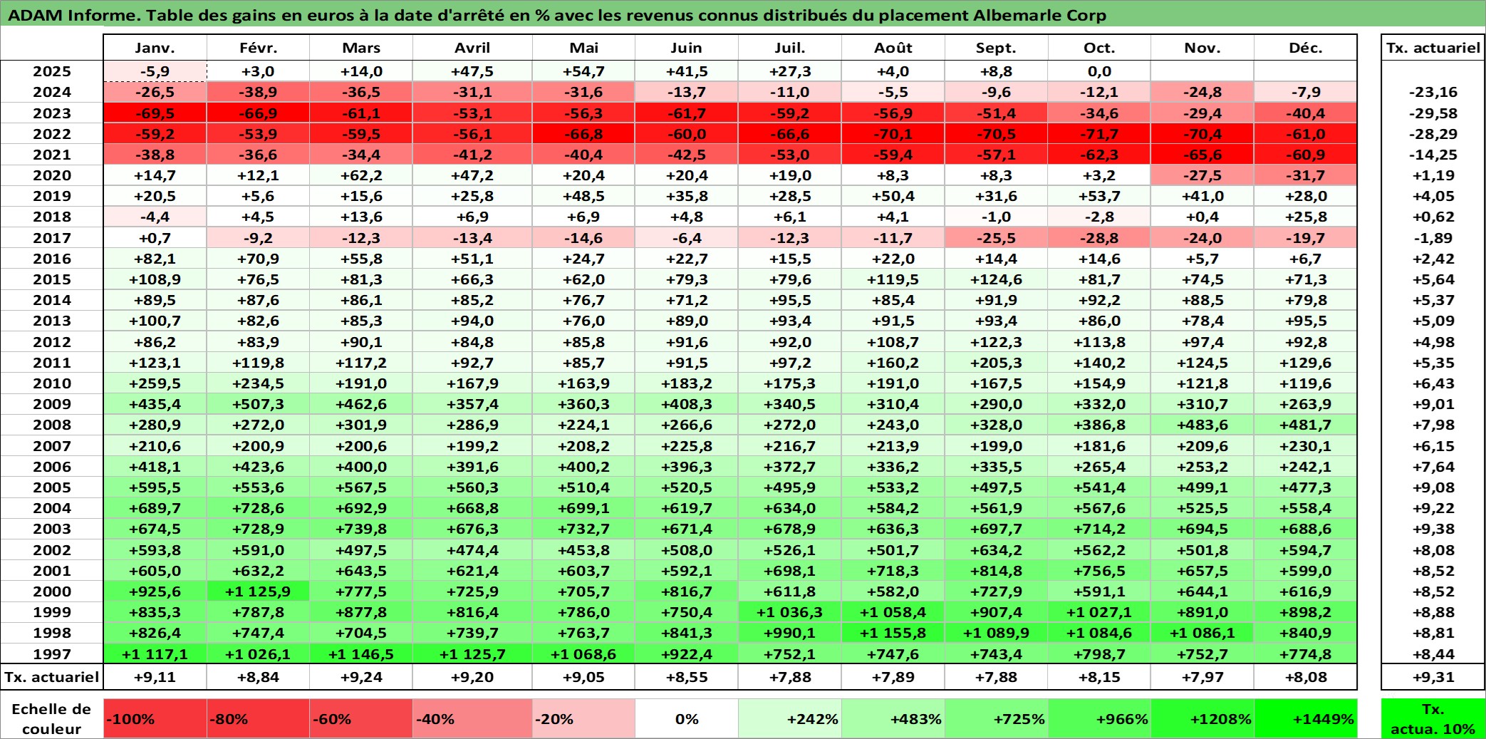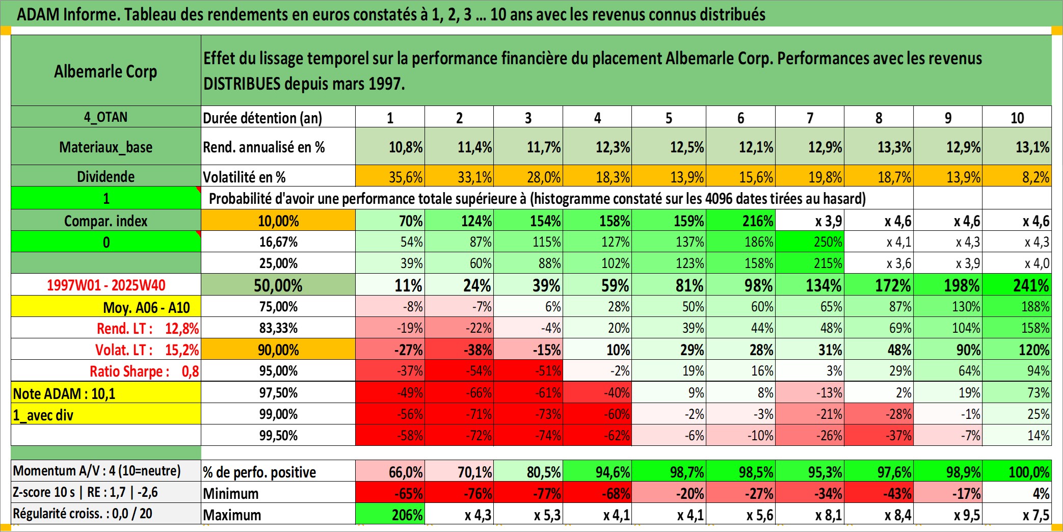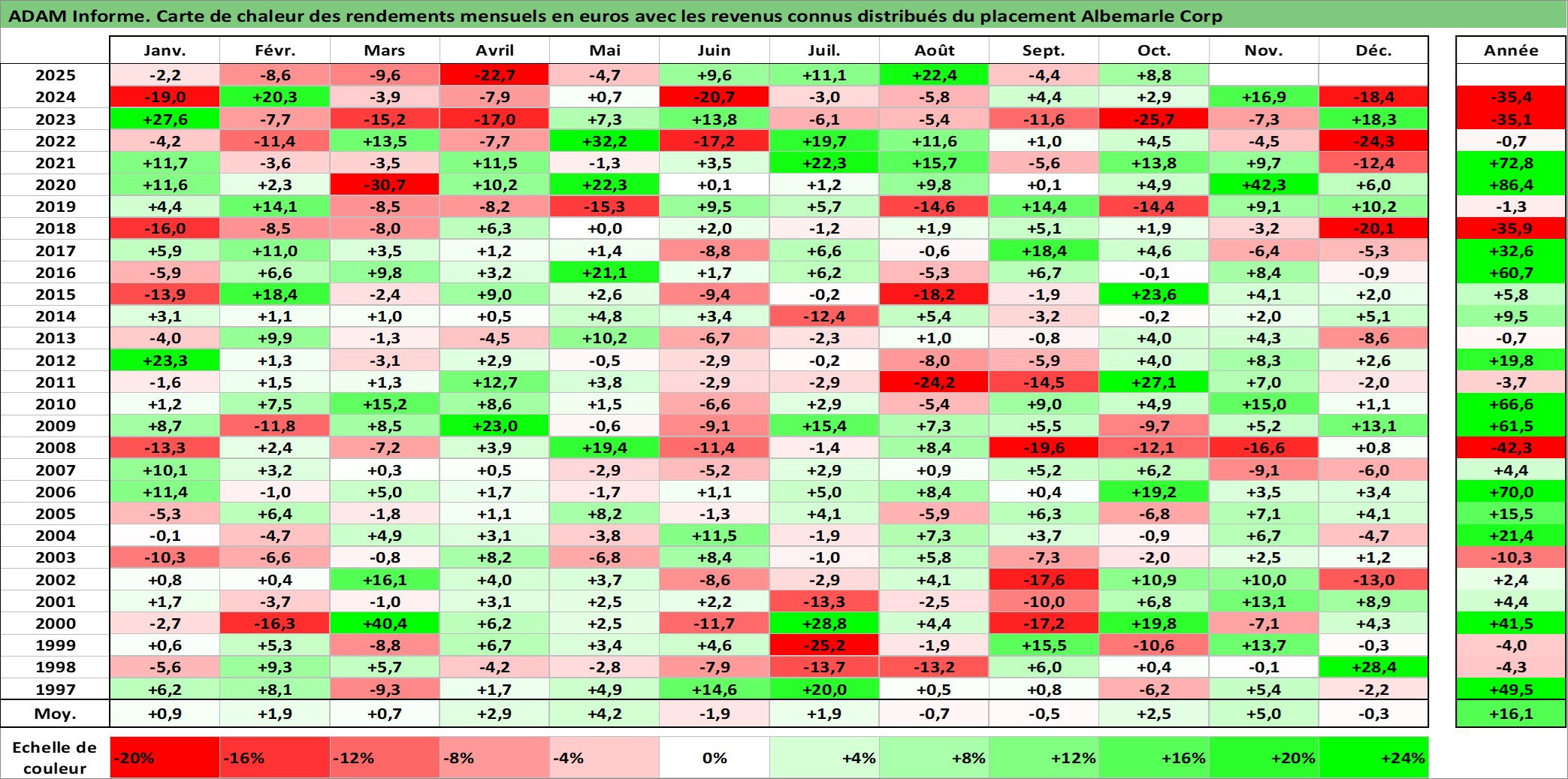 Site dédié aux investisseursPage dédiée sur site financeAnalyse des valorisations hebdomadaires de l'action Albemarle Corp. Cet actif est cote en USD. Les valorisations sont en contrevaleur EURO et couvrent les semaines 1997W01 a 2025W40. Les revenus de cet actif financier sont pris en compte depuis la semaine 1997W10. La note globale ESG de cet actif est estimee a 6.0 (apres rebasage entre 0 et 20).