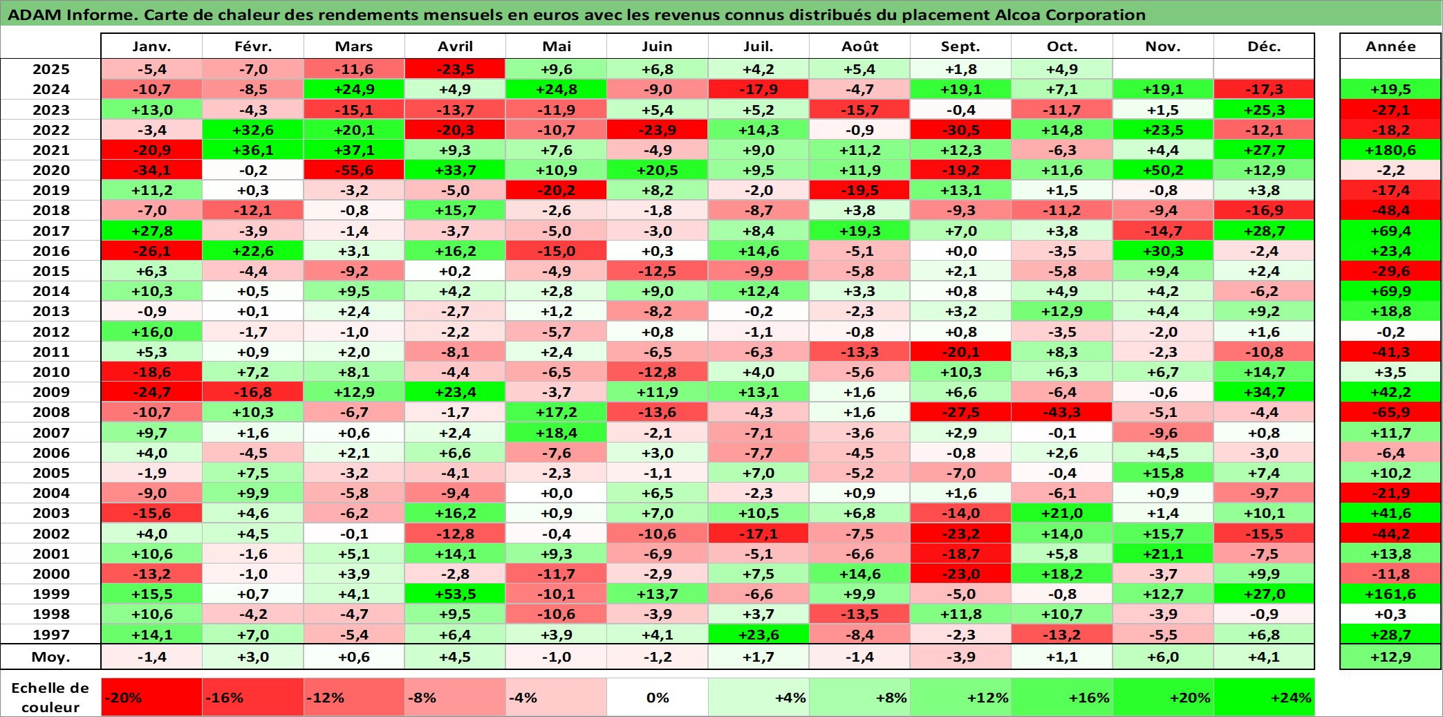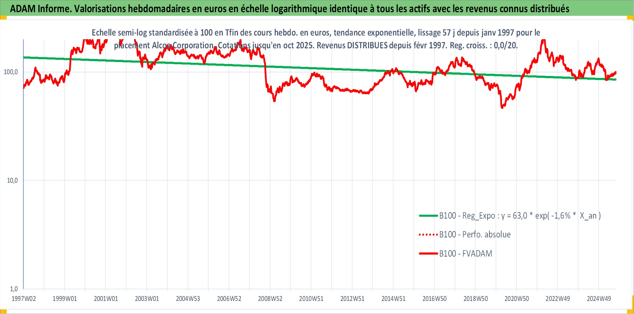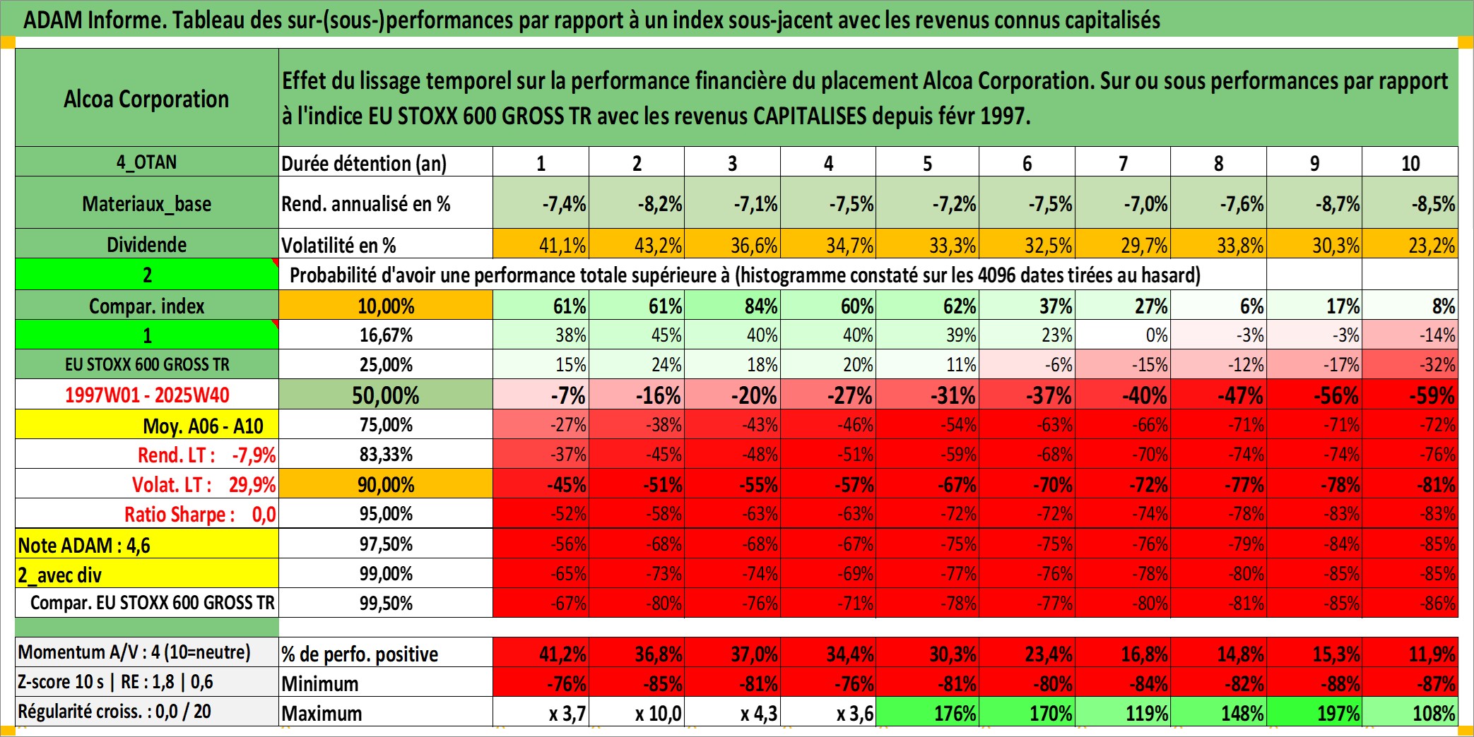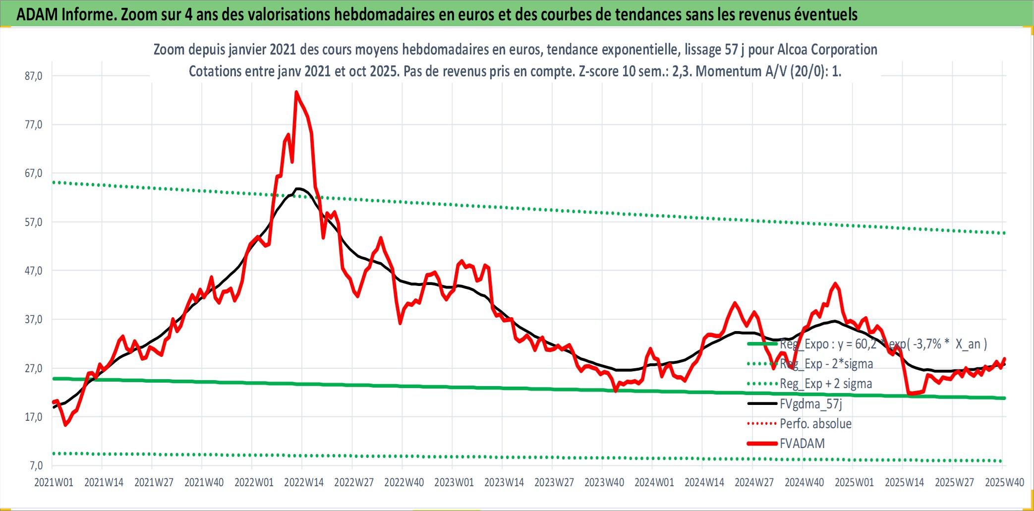 Site dédié aux investisseursPage dédiée sur site financeAnalyse des valorisations hebdomadaires de l'action Alcoa Corporation. Cet actif est cote en USD. Les valorisations sont en contrevaleur EURO et couvrent les semaines 1997W01 a 2025W40. Les revenus de cet actif financier sont pris en compte depuis la semaine 1997W06. La note globale ESG de cet actif est estimee a 8.0 (apres rebasage entre 0 et 20).
