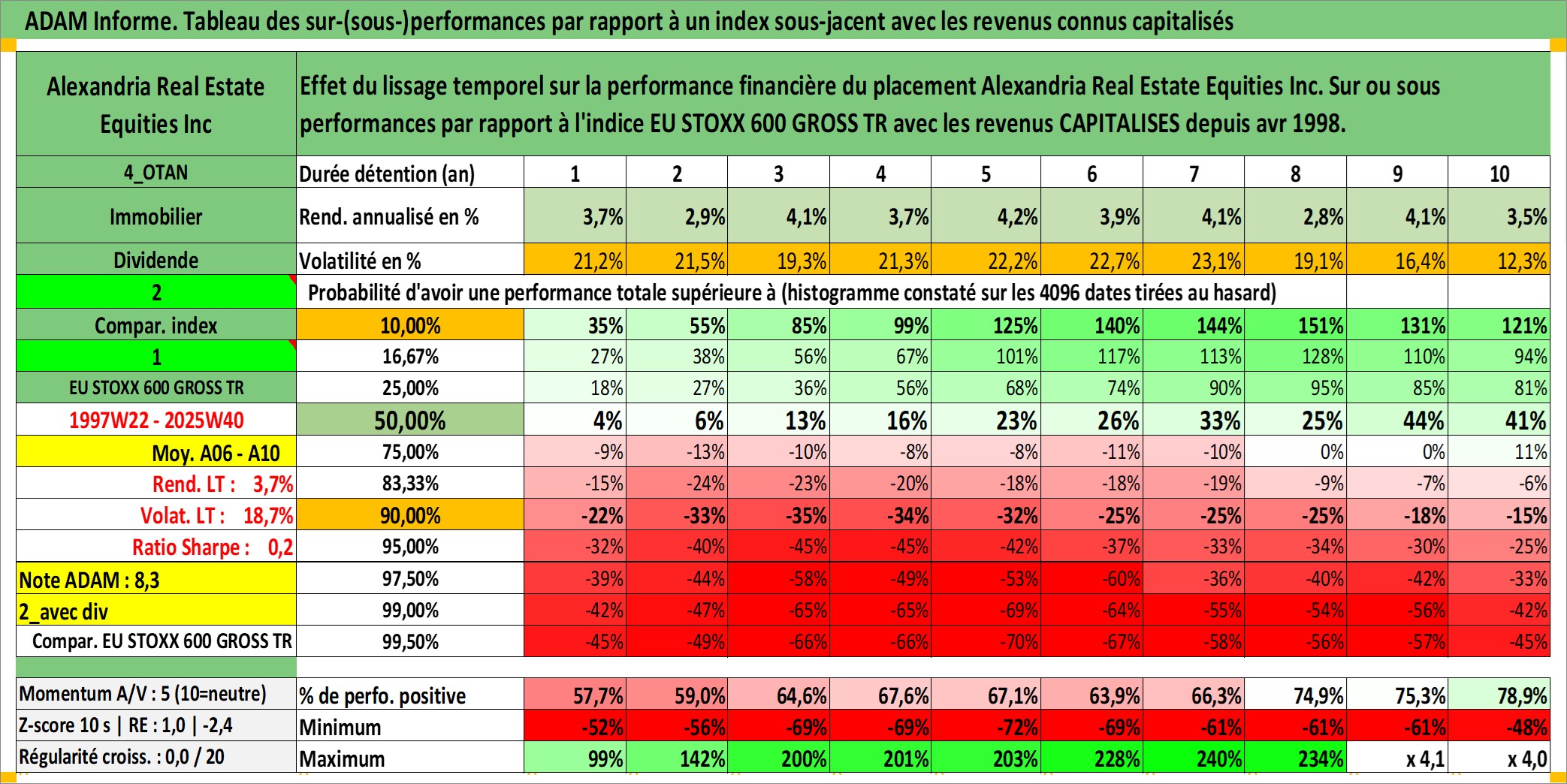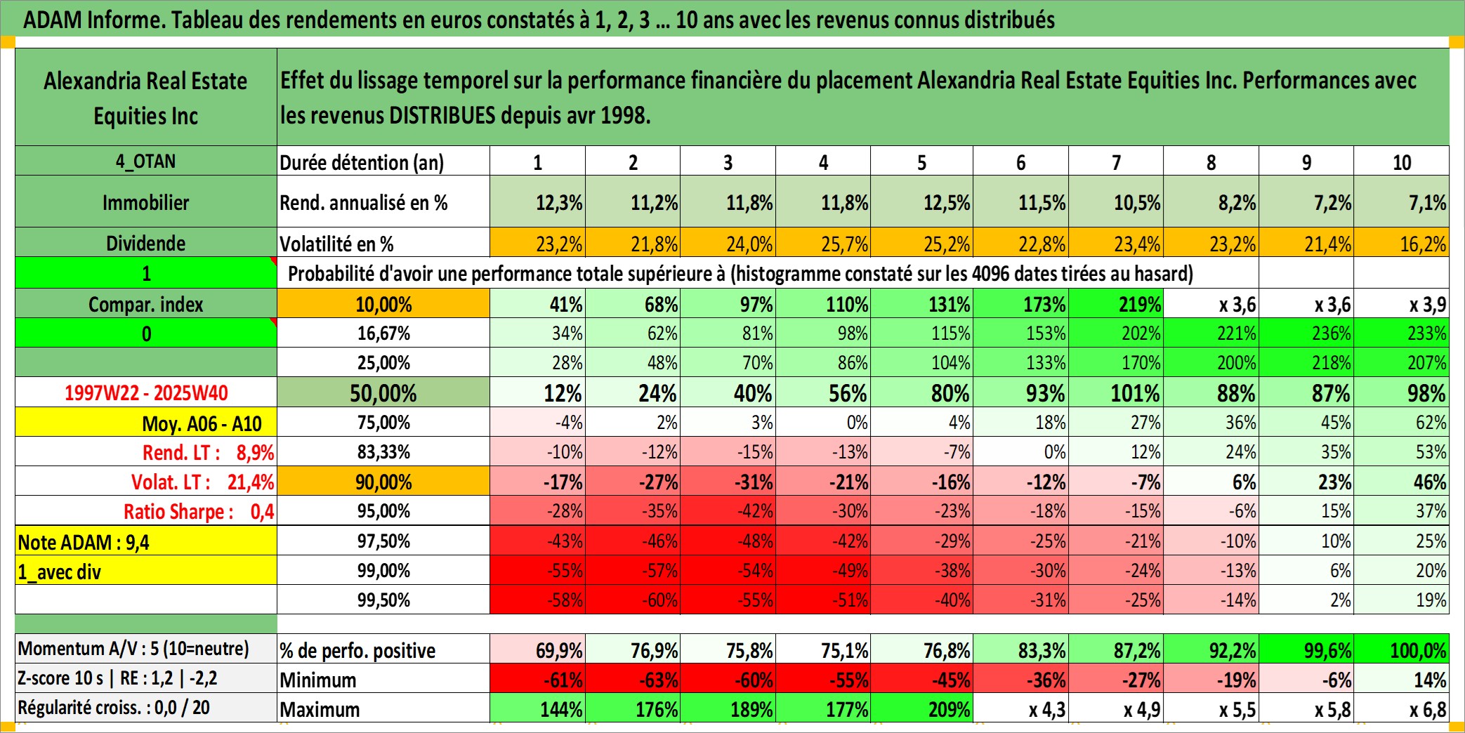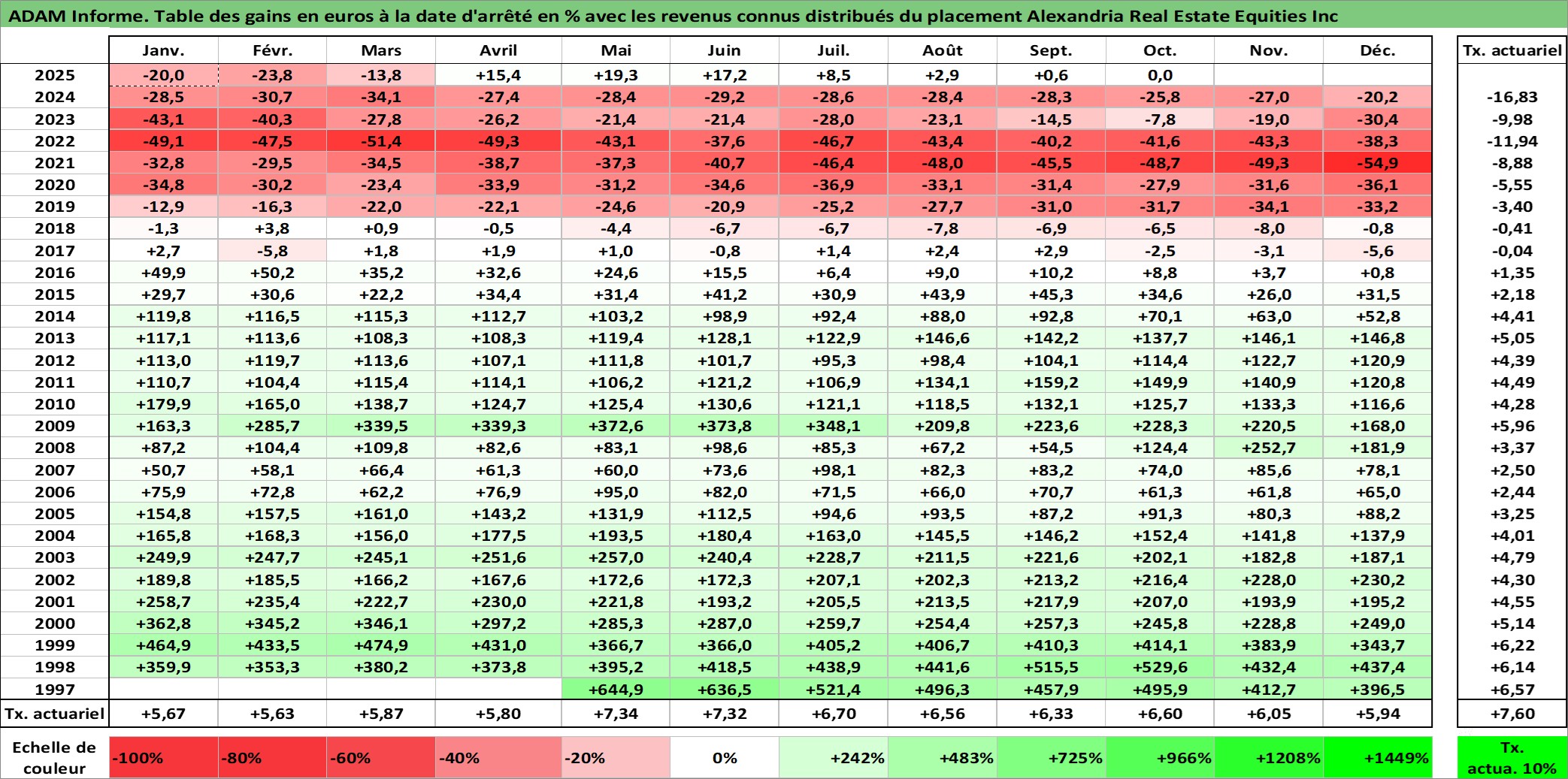 Site dédié aux investisseursPage dédiée sur site financeAnalyse des valorisations hebdomadaires de l'action Alexandria Real Estate Equities Inc. Cet actif est cote en USD. Les valorisations sont en contrevaleur EURO et couvrent les semaines 1997W22 a 2025W40. Les revenus de cet actif financier sont pris en compte depuis la semaine 1998W14. La note globale ESG de cet actif est estimee a 14.0 (apres rebasage entre 0 et 20).