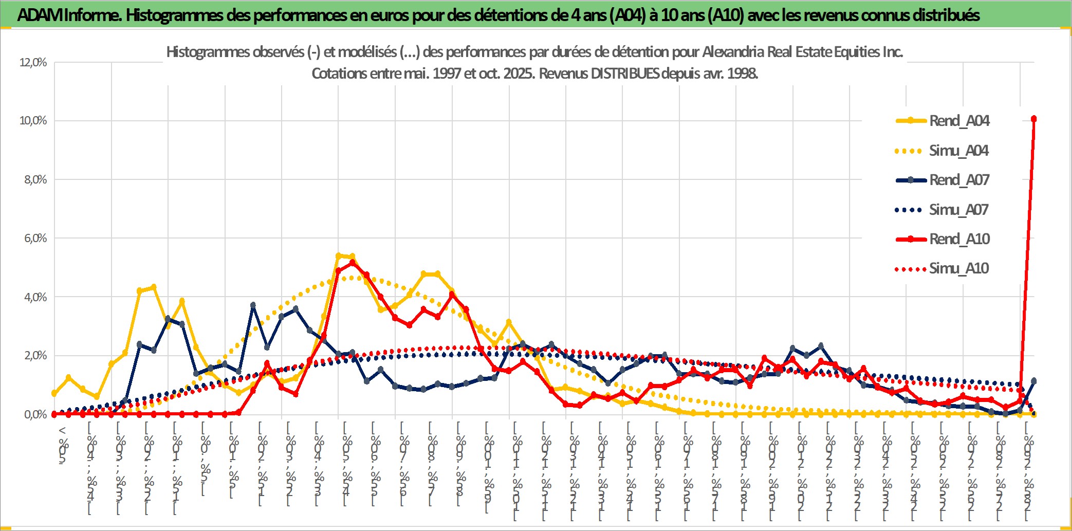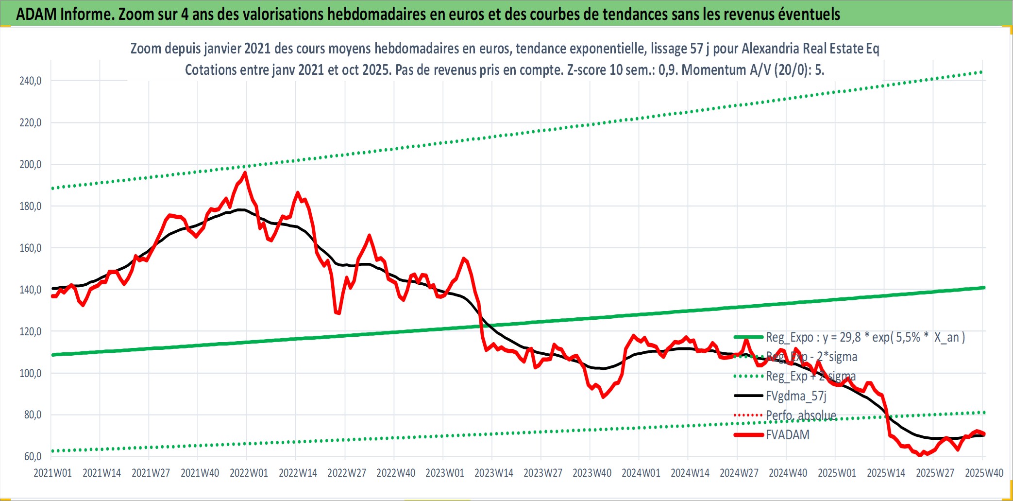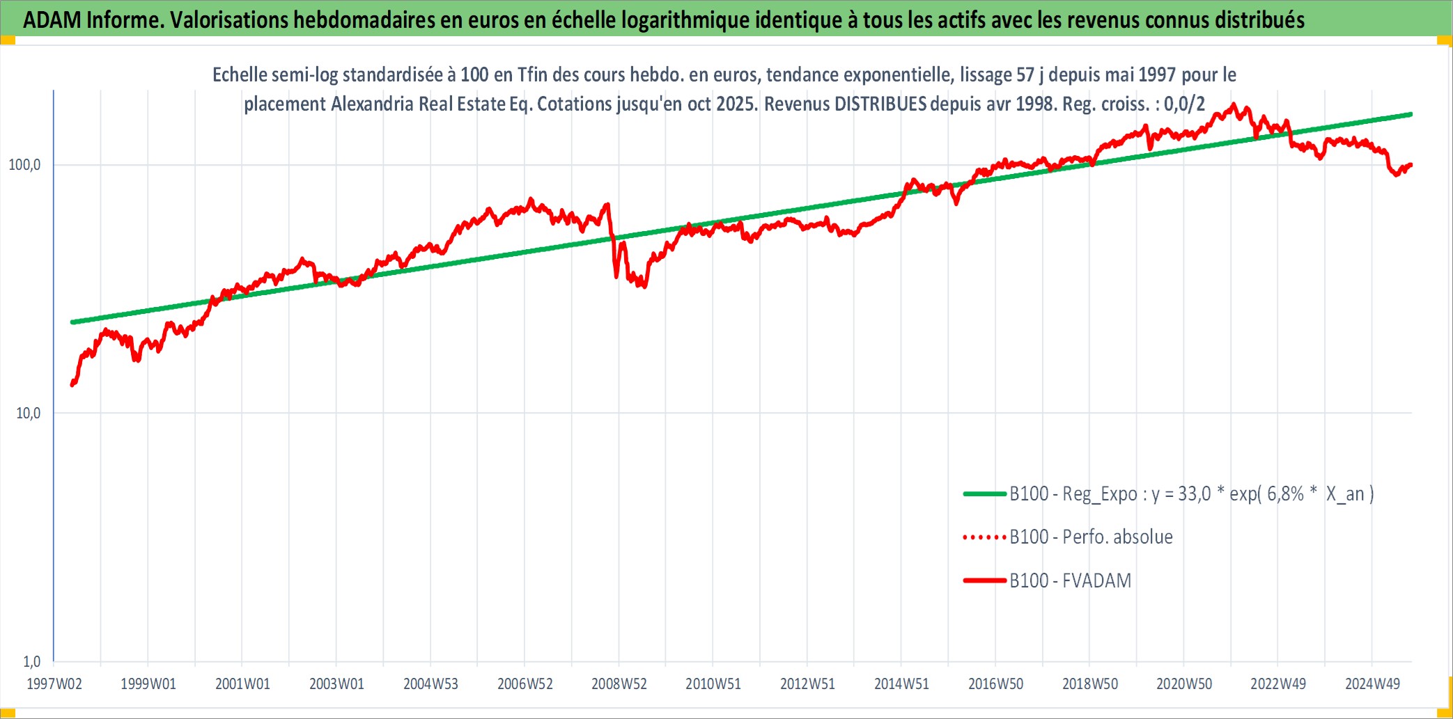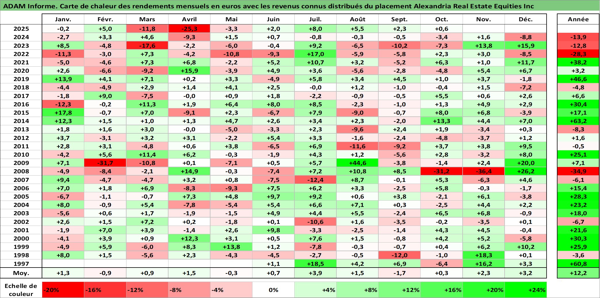 Site dédié aux investisseursPage dédiée sur site financeAnalyse des valorisations hebdomadaires de l'action Alexandria Real Estate Equities Inc. Cet actif est cote en USD. Les valorisations sont en contrevaleur EURO et couvrent les semaines 1997W22 a 2025W40. Les revenus de cet actif financier sont pris en compte depuis la semaine 1998W14. La note globale ESG de cet actif est estimee a 14.0 (apres rebasage entre 0 et 20).