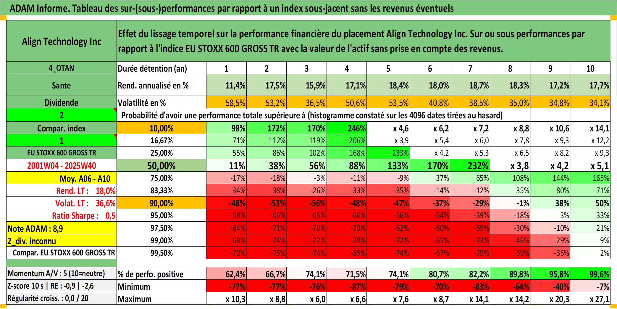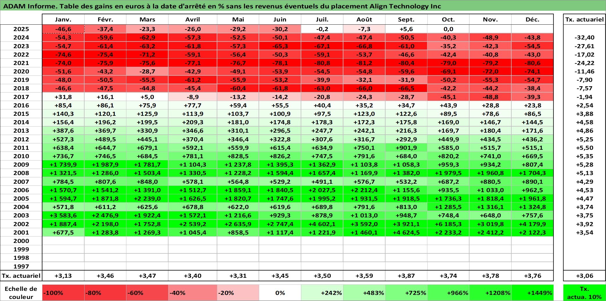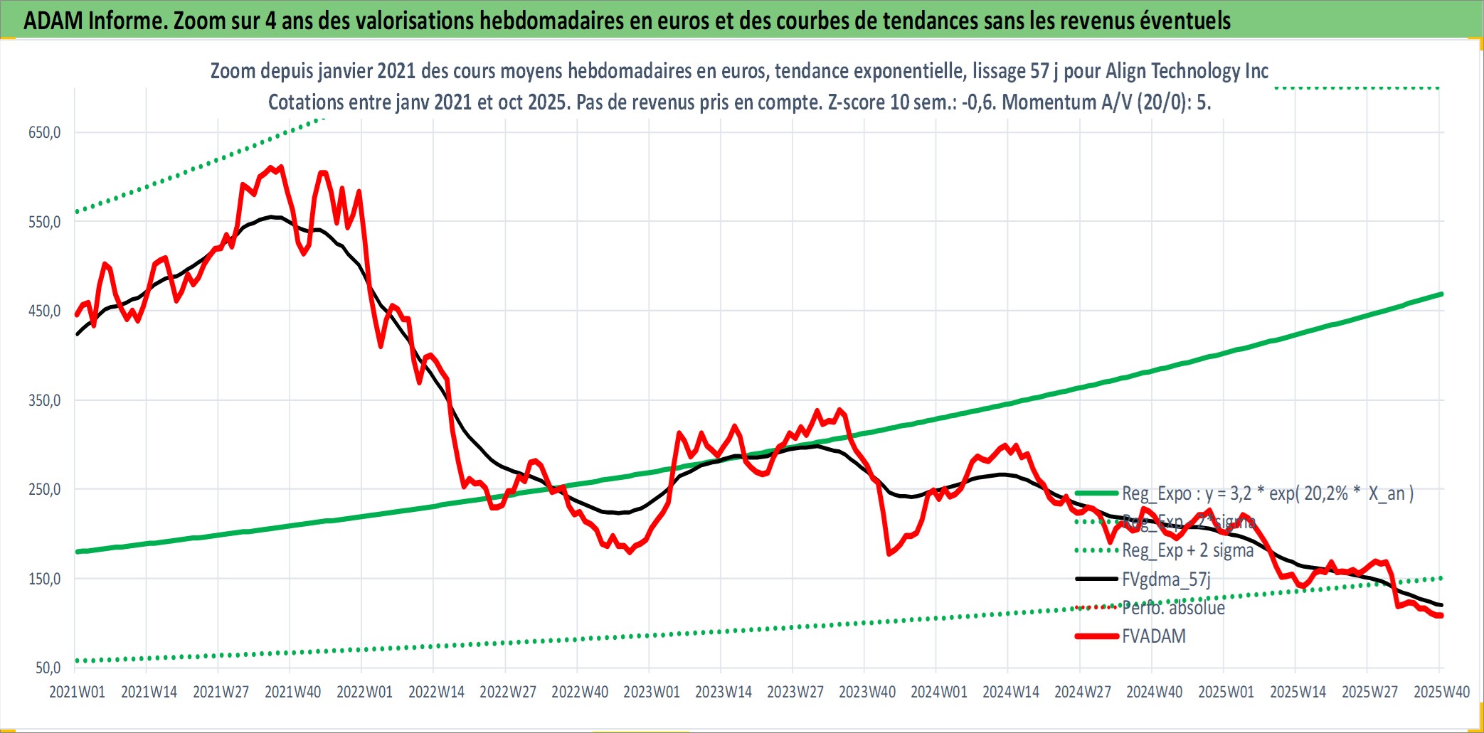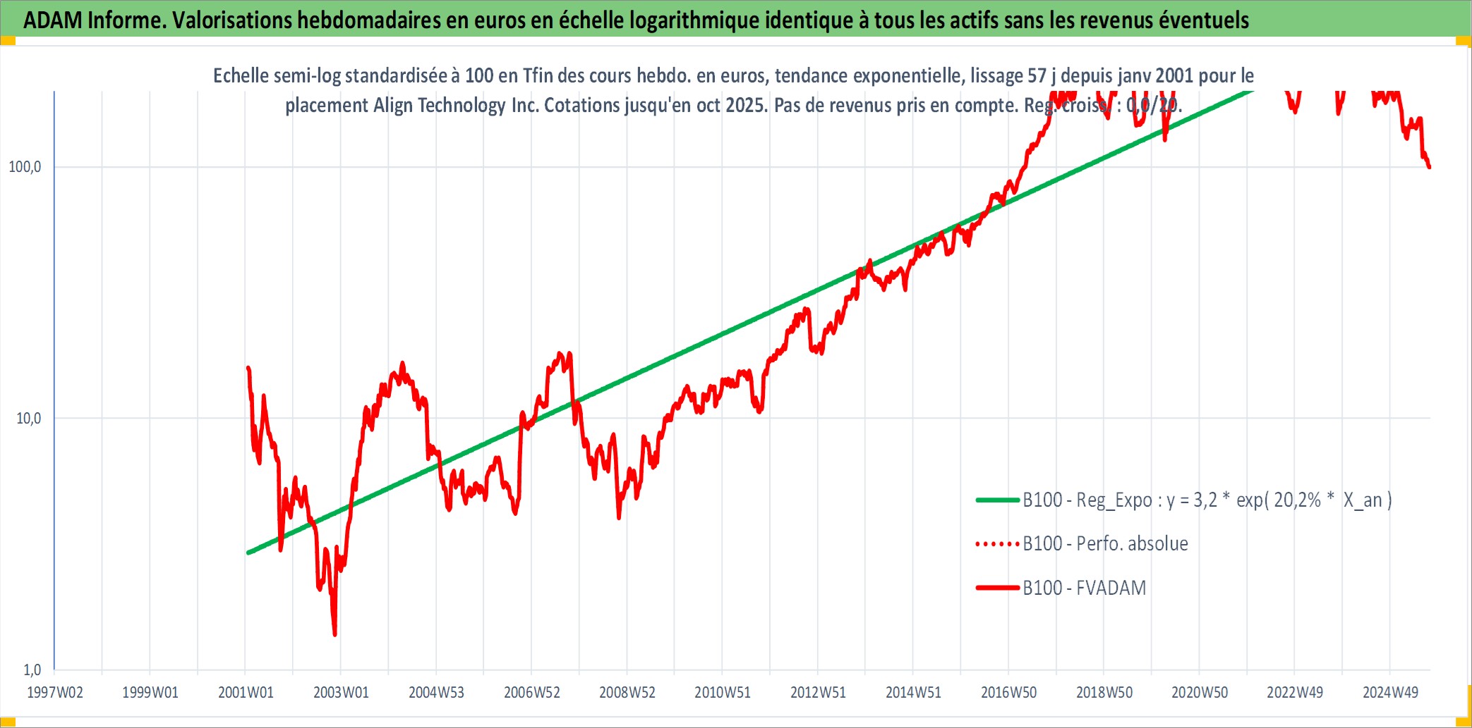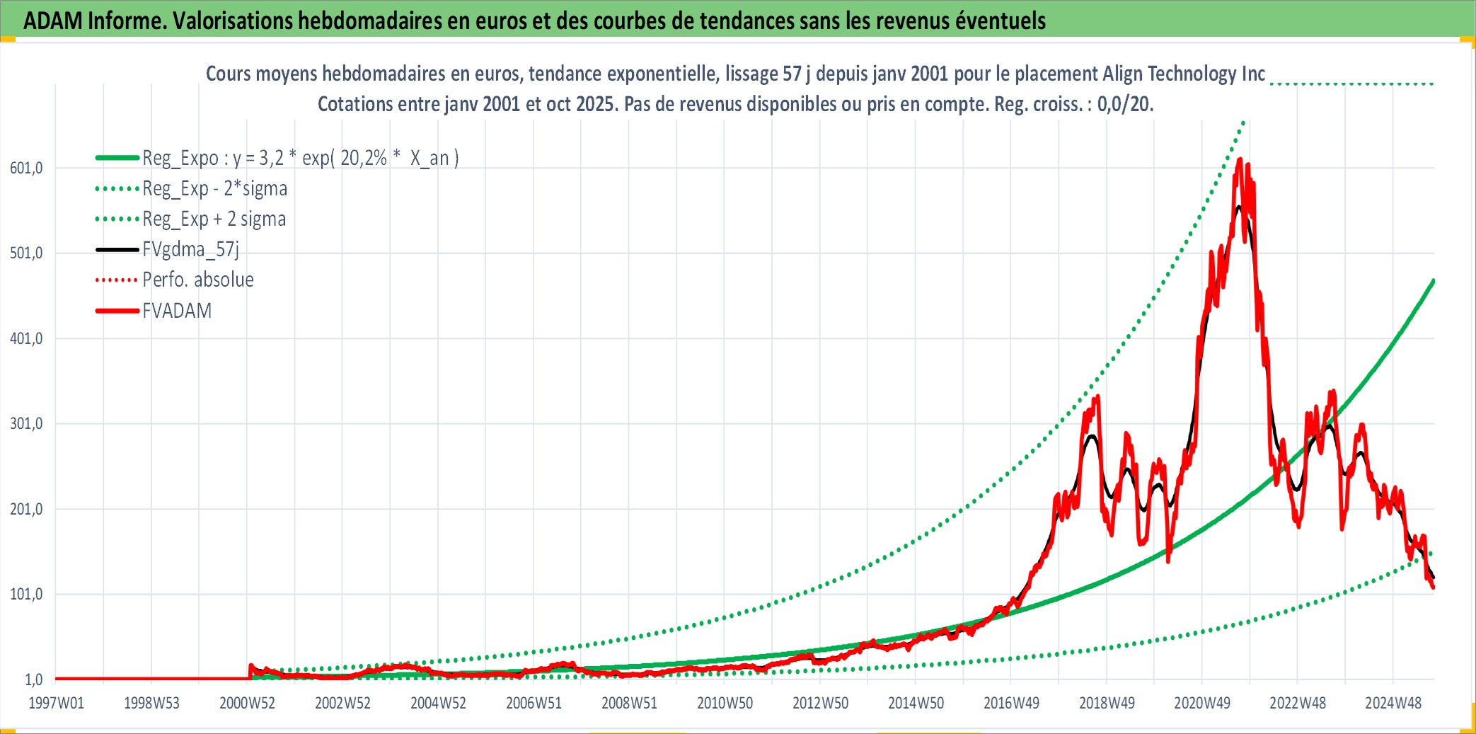 Site dédié aux investisseursPage dédiée sur site financeAnalyse des valorisations hebdomadaires de l'action Align Technology Inc. Cet actif est cote en USD. Les valorisations sont en contrevaleur EURO et couvrent les semaines 2001W04 a 2025W40. Les revenus de cet actif financier ne sont pas connus car non existants ou non disponibles sur le site Yahoo Finance. La note ESG de cet actif n'est pas connue.
