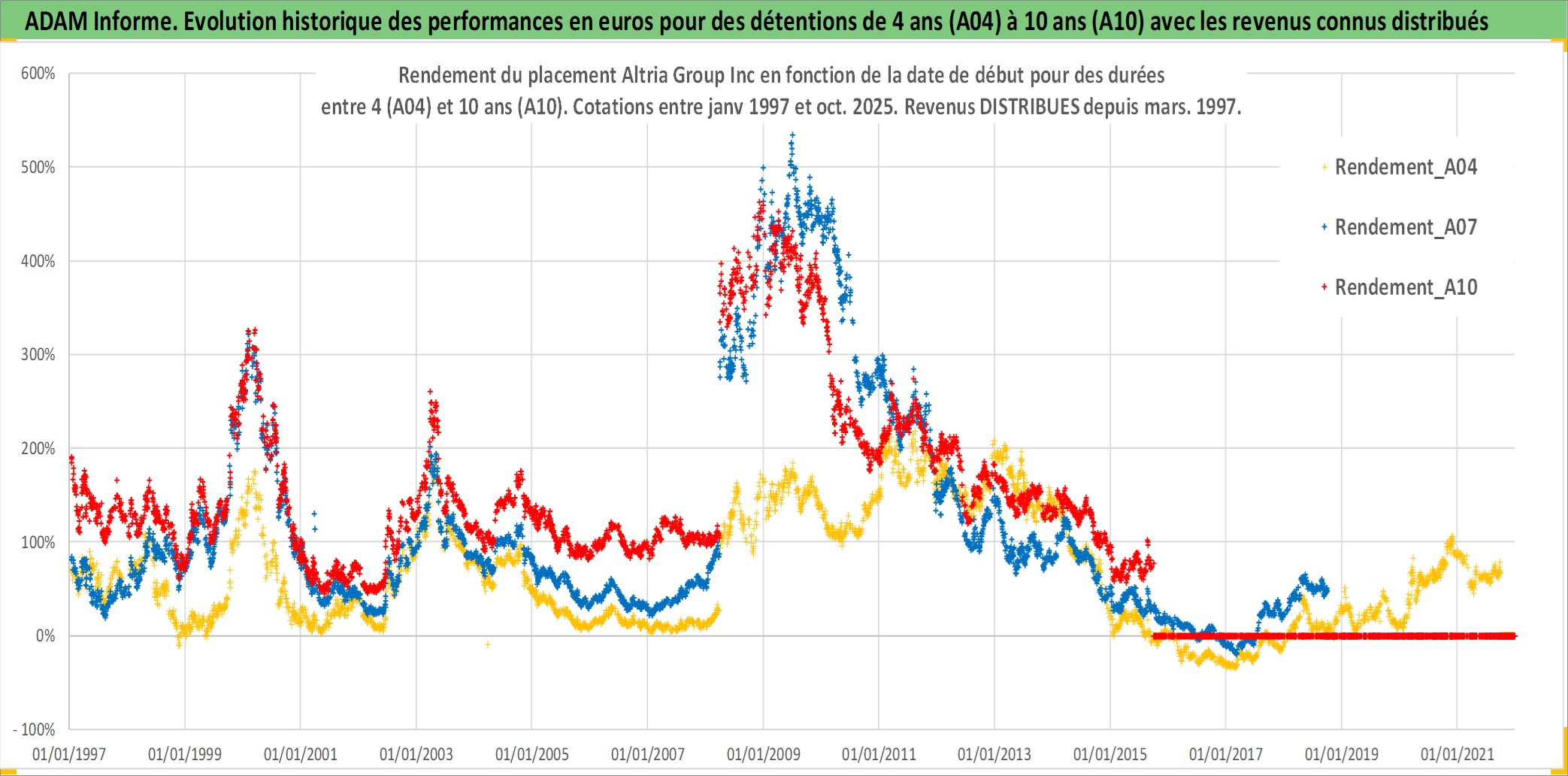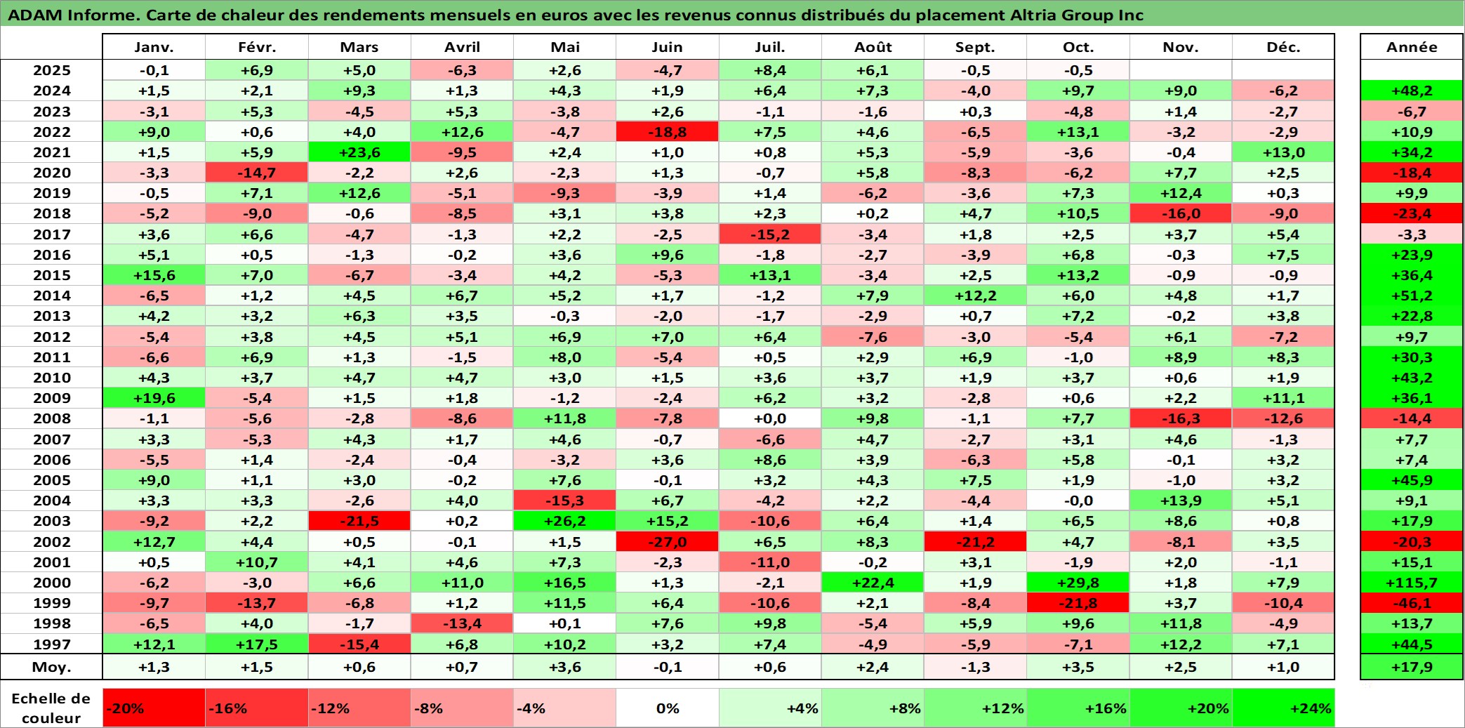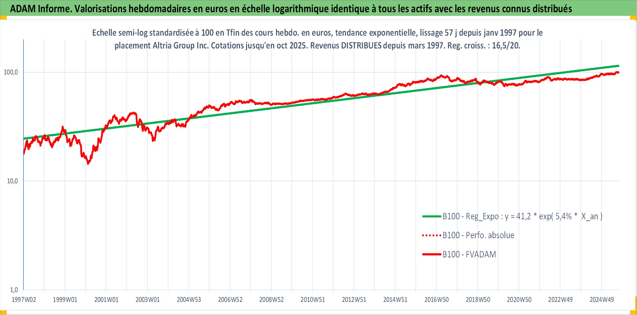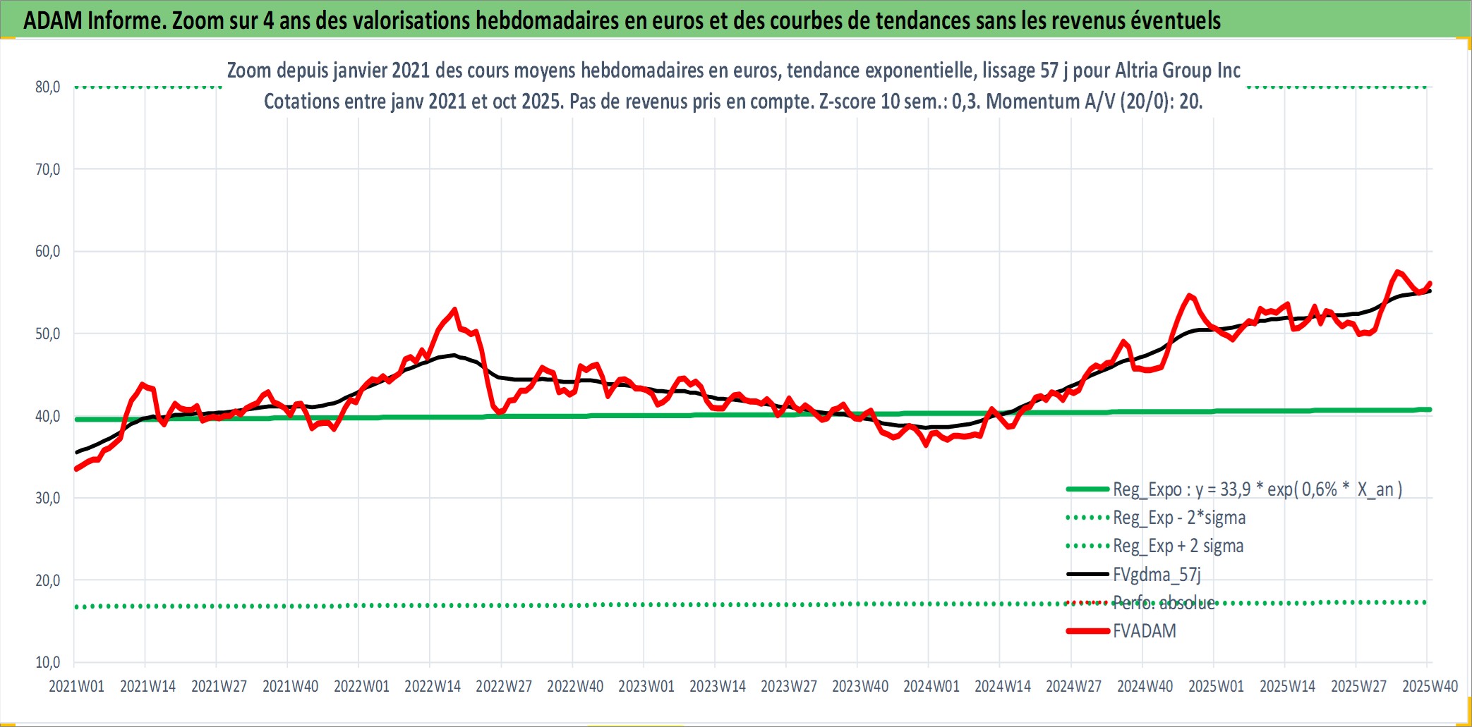 Site dédié aux investisseursPage dédiée sur site financeAnalyse des valorisations hebdomadaires de l'action Altria Group Inc. Cet actif est cote en USD. Les valorisations sont en contrevaleur EURO et couvrent les semaines 1997W01 a 2025W40. Les revenus de cet actif financier sont pris en compte depuis la semaine 1997W11. La note globale ESG de cet actif est estimee a 8.0 (apres rebasage entre 0 et 20).