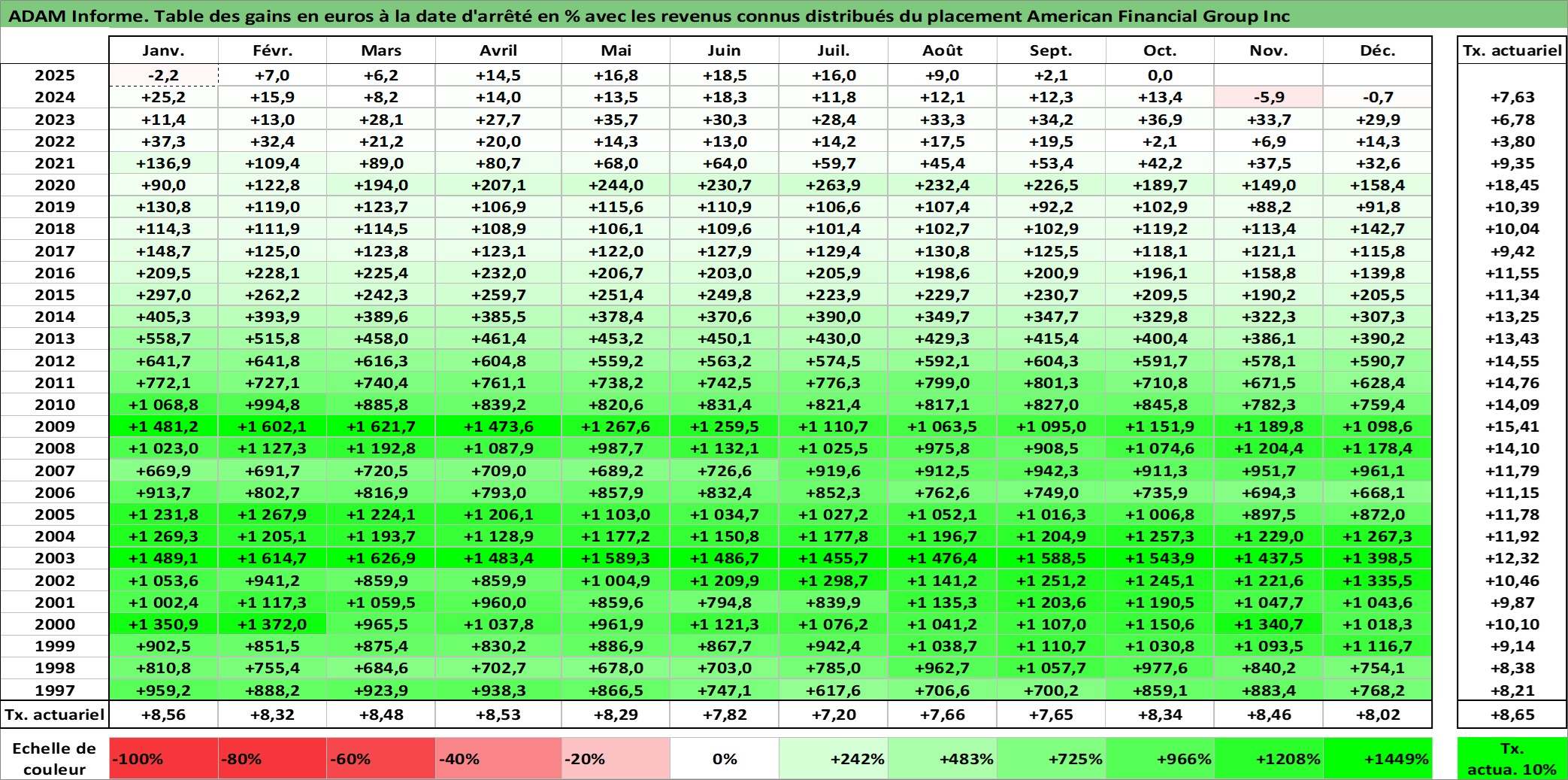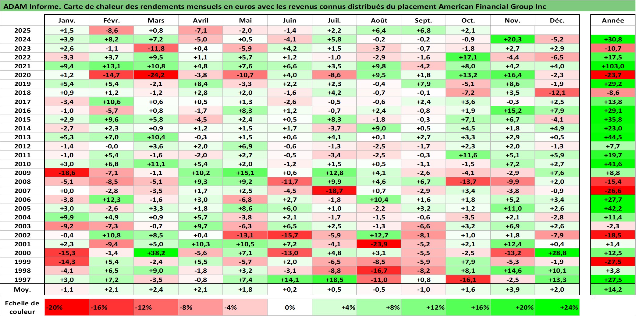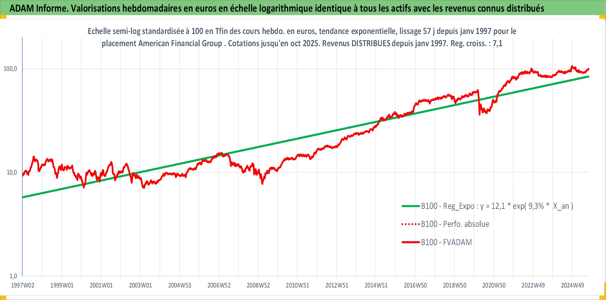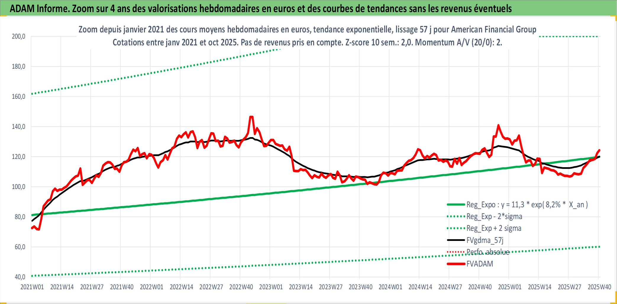Site dédié aux investisseursPage dédiée sur site financeAnalyse des valorisations hebdomadaires de l'action American Financial Group Inc. Cet actif est cote en USD. Les valorisations sont en contrevaleur EURO et couvrent les semaines 1997W01 a 2025W40. Les revenus de cet actif financier sont pris en compte depuis la semaine 1997W03. La note globale ESG de cet actif est estimee a 6.0 (apres rebasage entre 0 et 20).