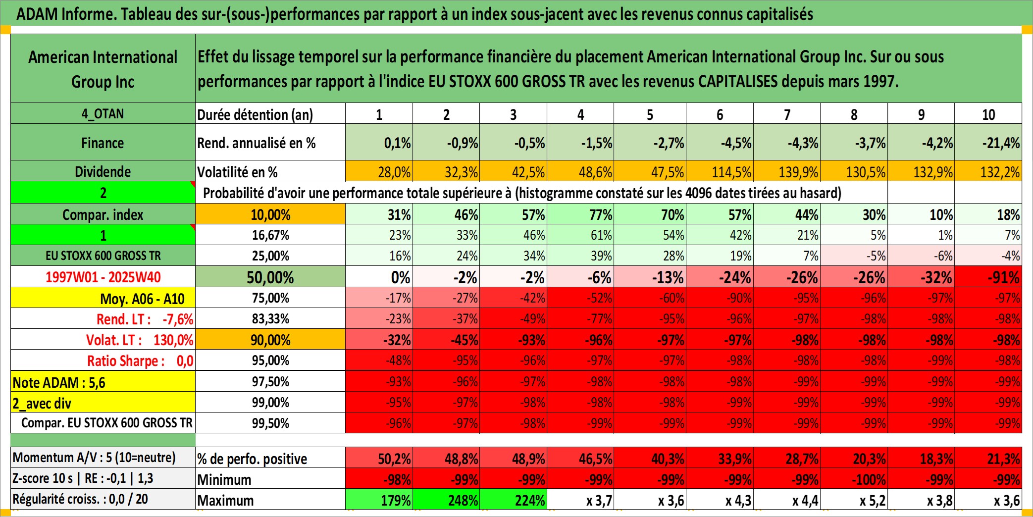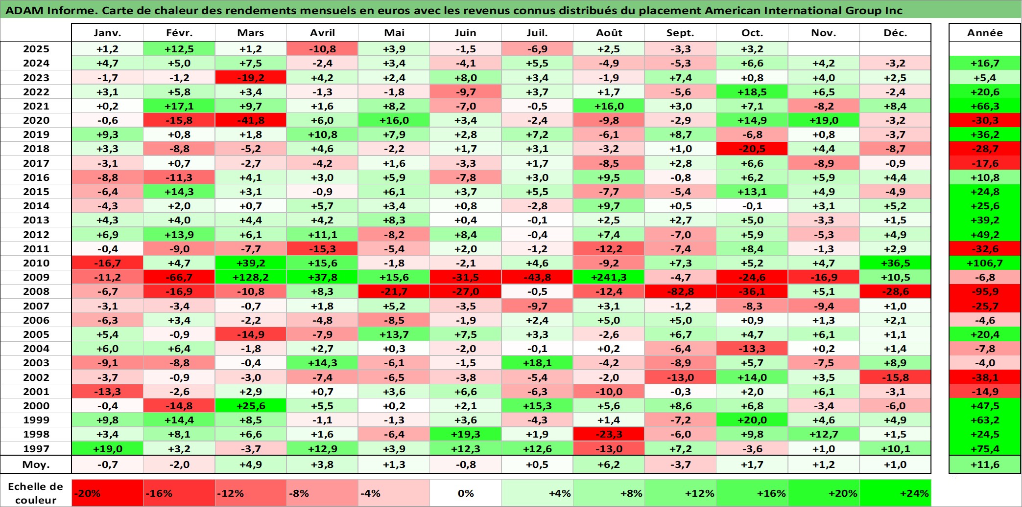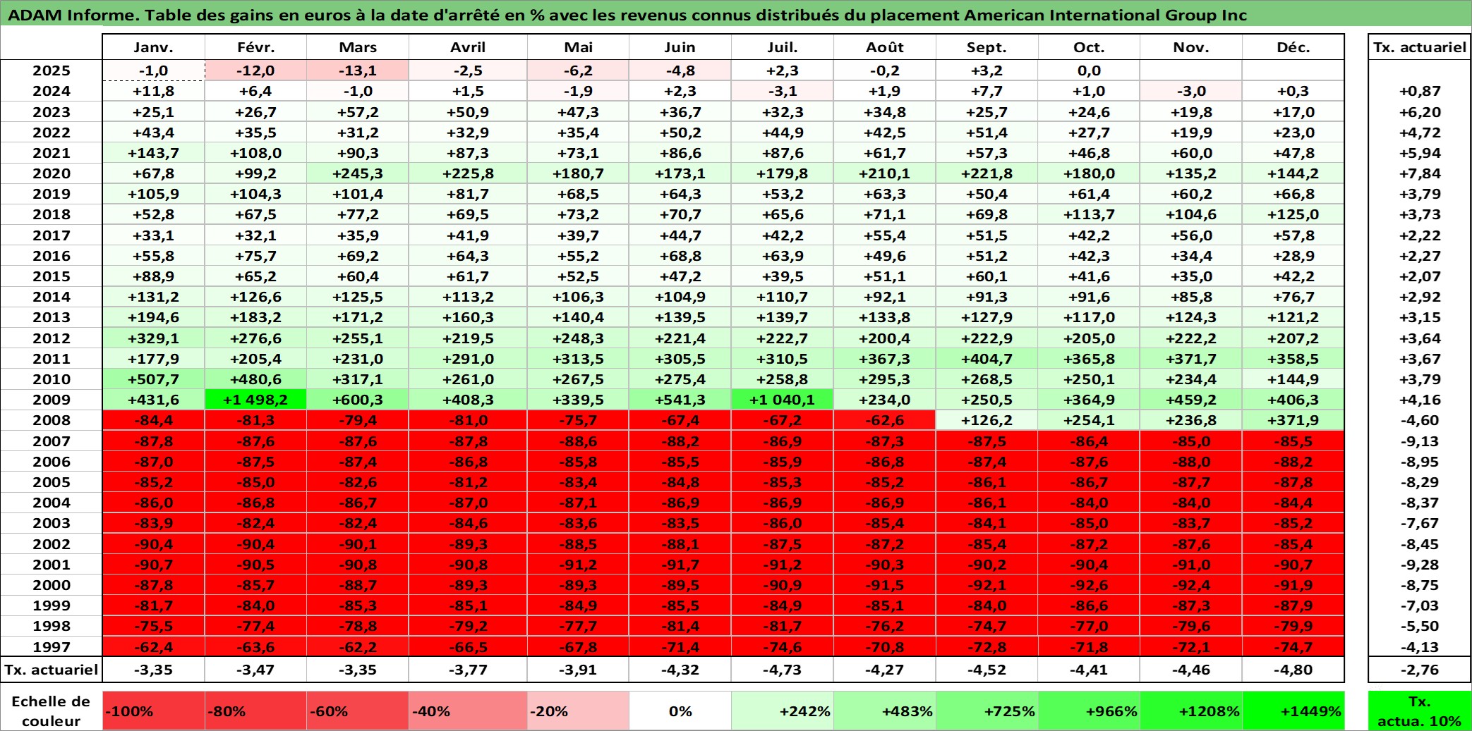 Site dédié aux investisseursPage dédiée sur site financeAnalyse des valorisations hebdomadaires de l'action American International Group Inc. Cet actif est cote en USD. Les valorisations sont en contrevaleur EURO et couvrent les semaines 1997W01 a 2025W40. Les revenus de cet actif financier sont pris en compte depuis la semaine 1997W10. La note globale ESG de cet actif est estimee a 7.0 (apres rebasage entre 0 et 20).