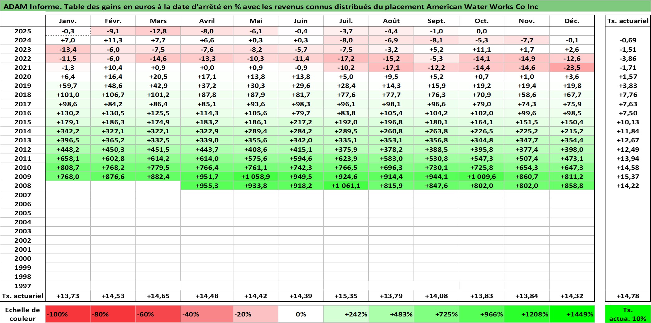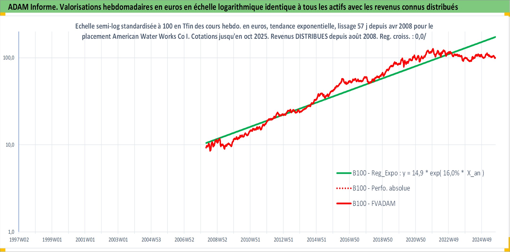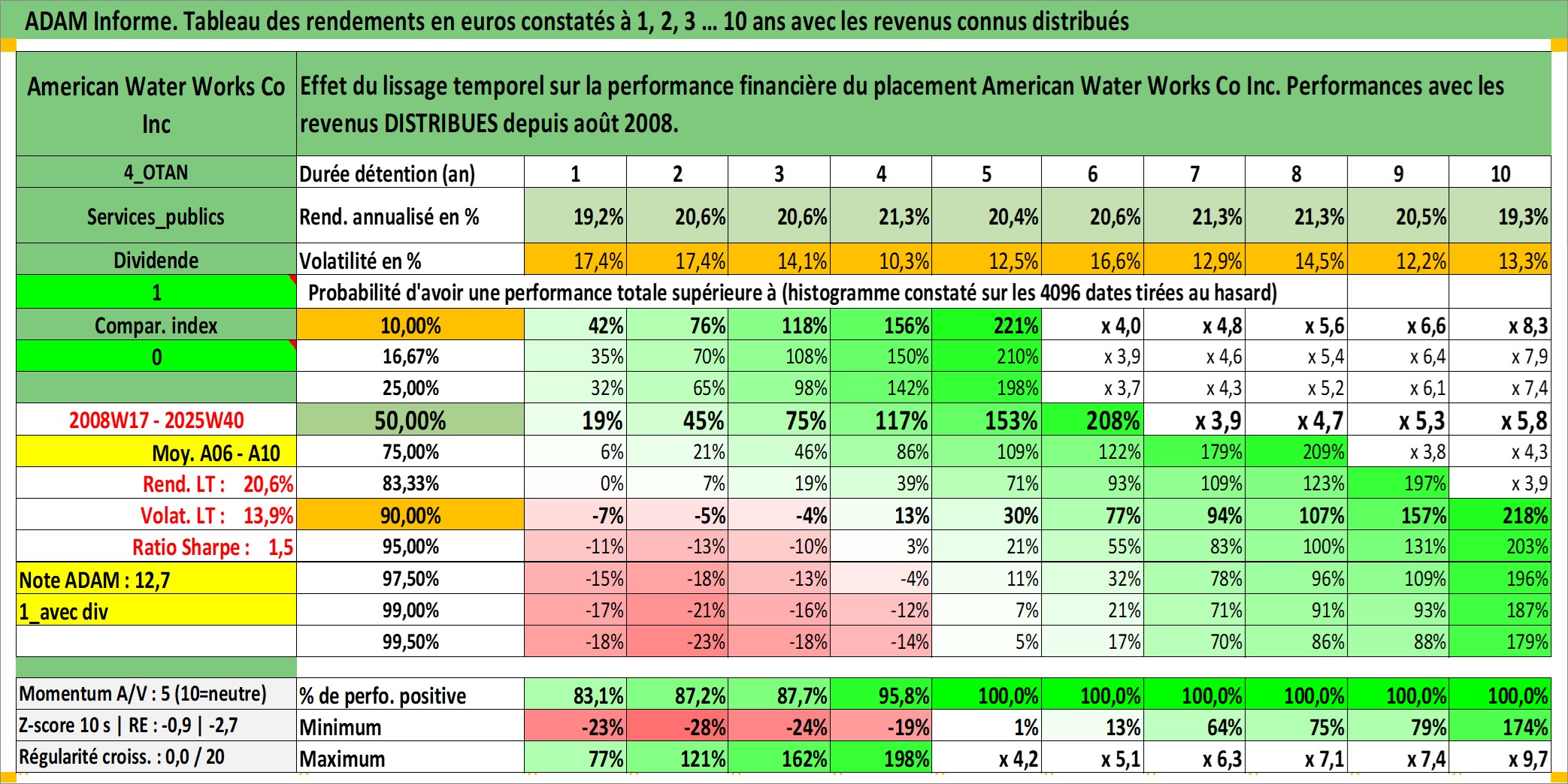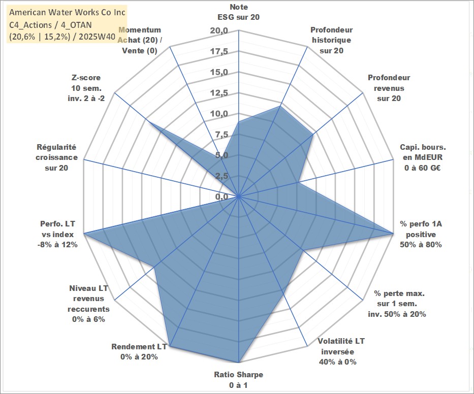 Site dédié aux investisseursPage dédiée sur site financeAnalyse des valorisations hebdomadaires de l'action American Water Works Co Inc. Cet actif est cote en USD. Les valorisations sont en contrevaleur EURO et couvrent les semaines 2008W17 a 2025W40. Les revenus de cet actif financier sont pris en compte depuis la semaine 2008W33. La note globale ESG de cet actif est estimee a 9.0 (apres rebasage entre 0 et 20).