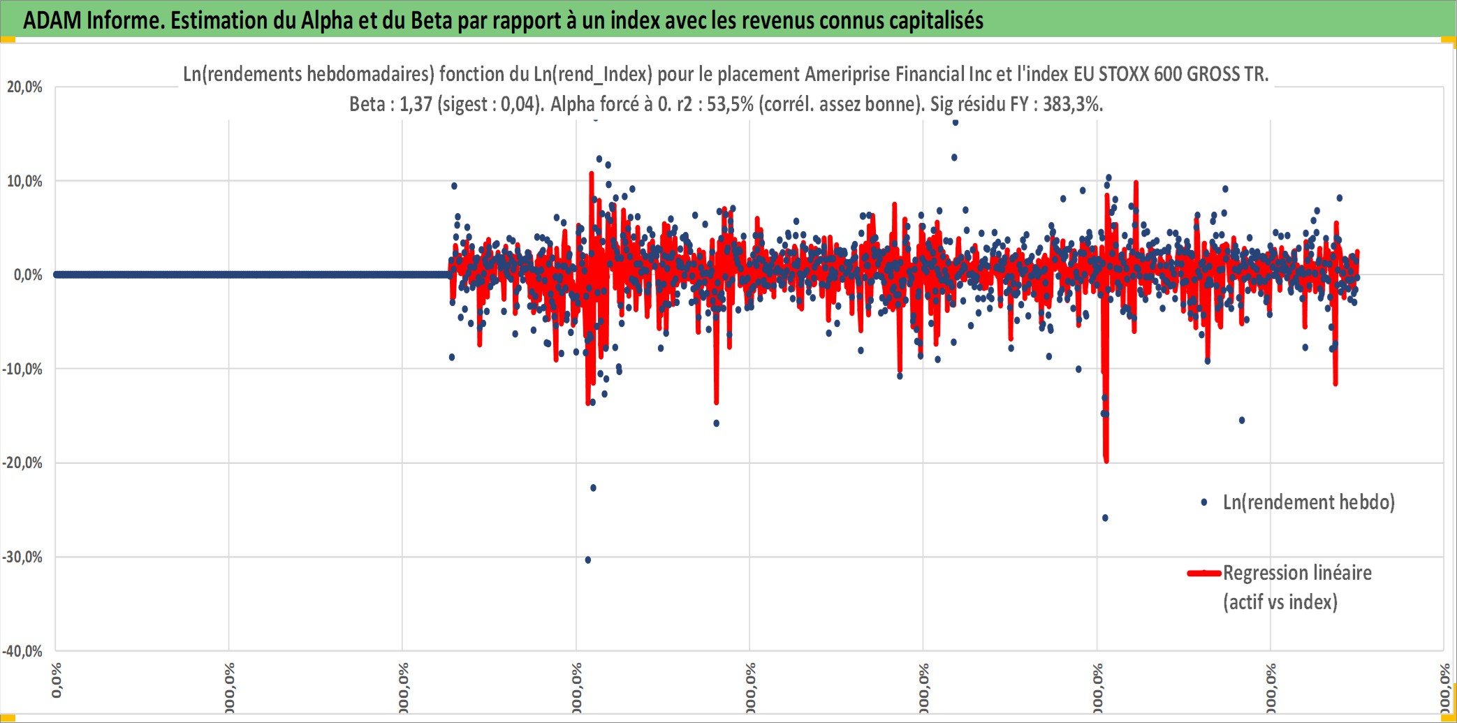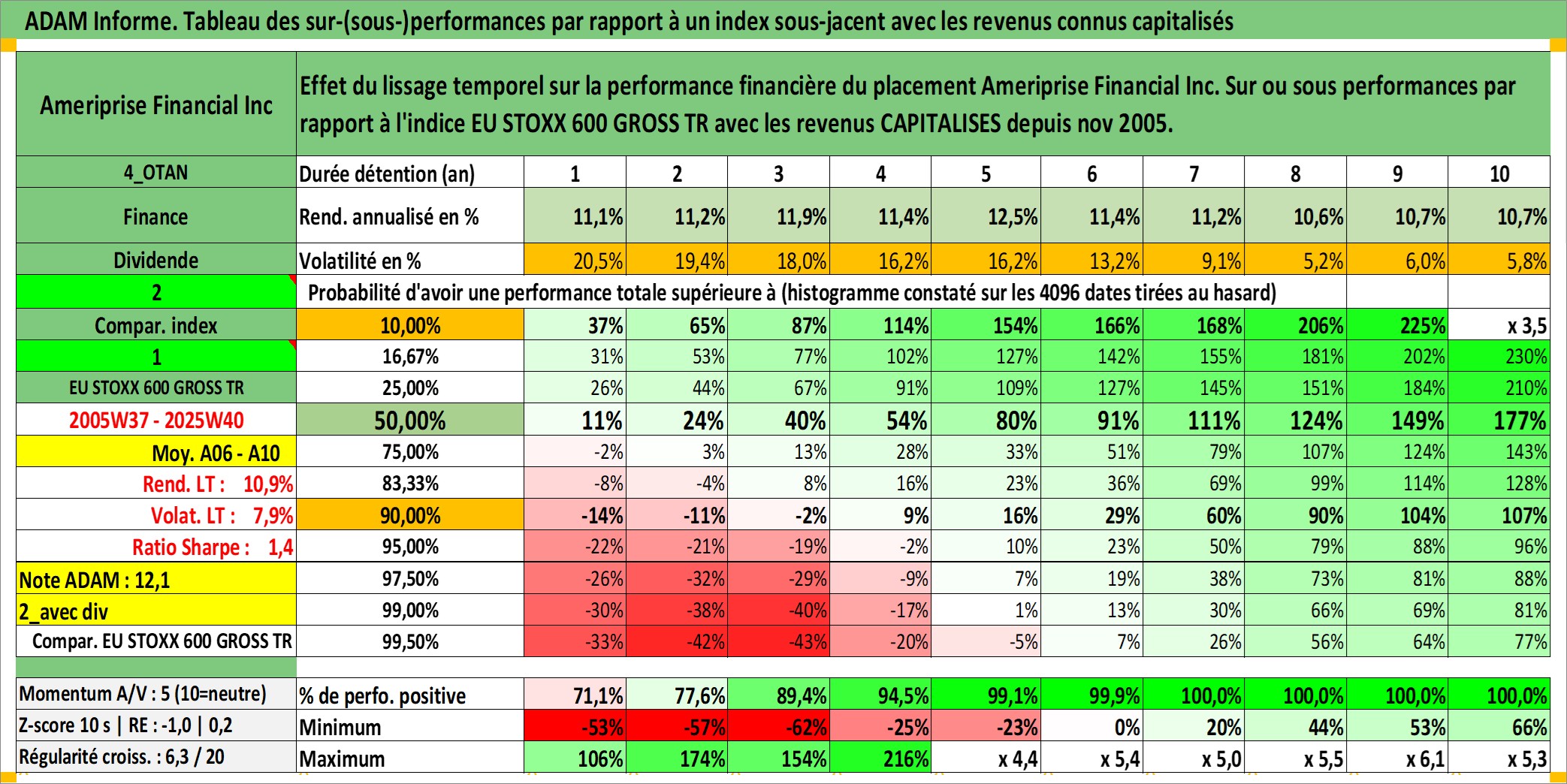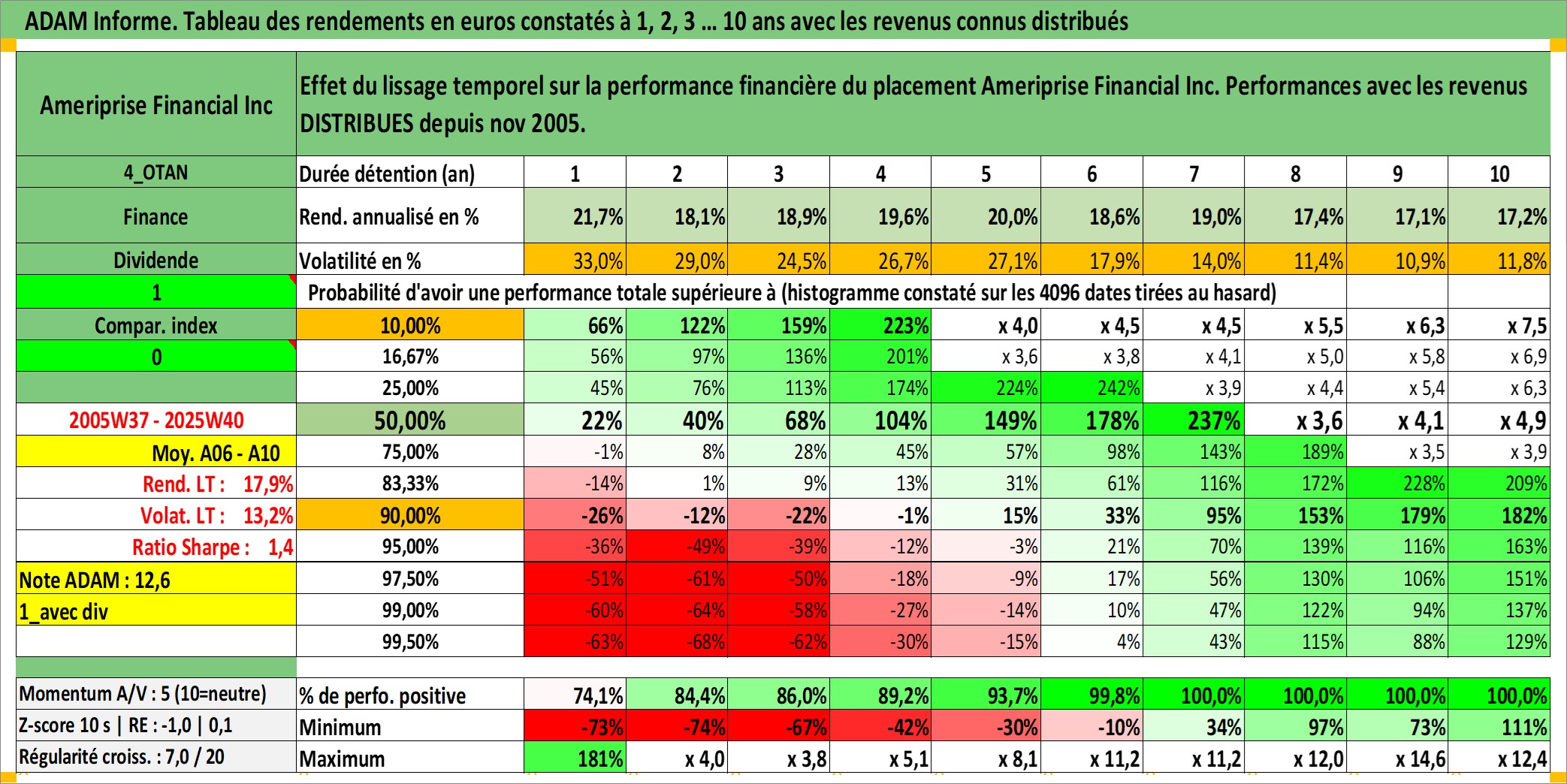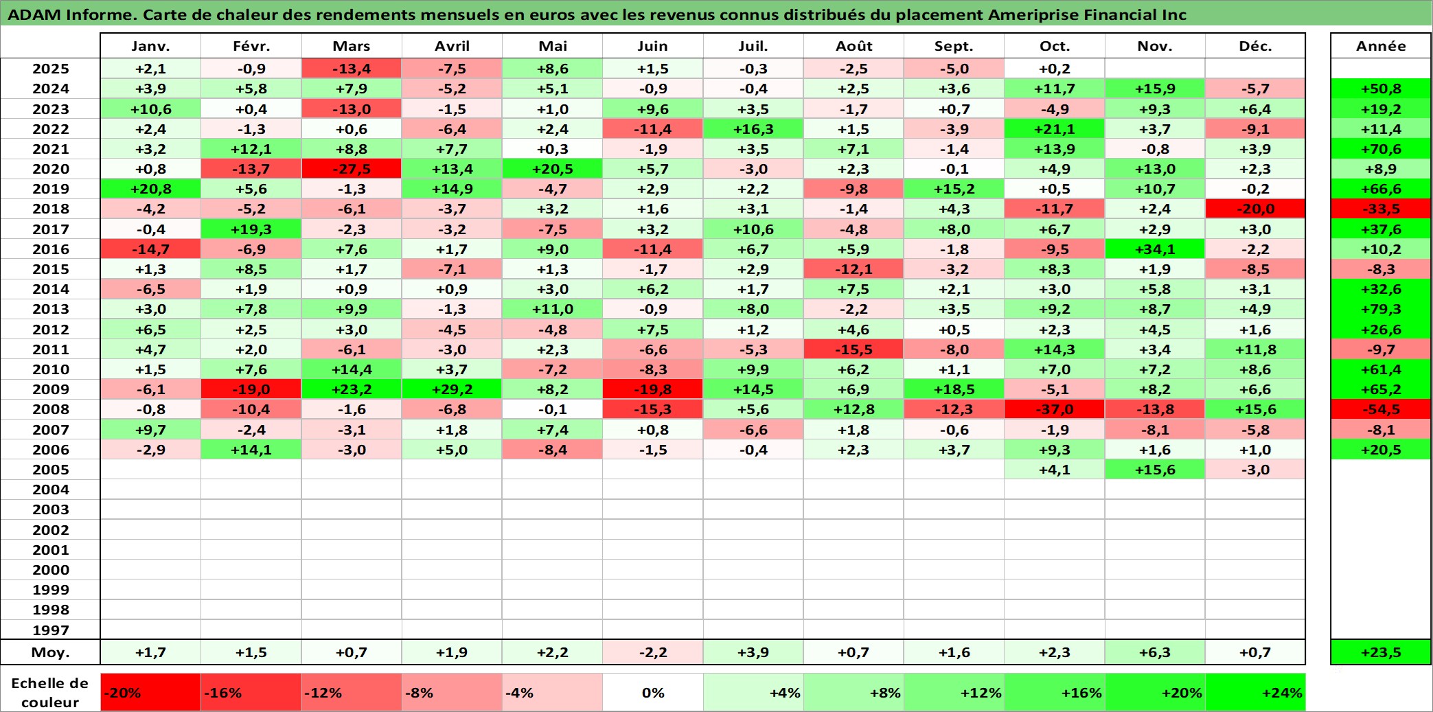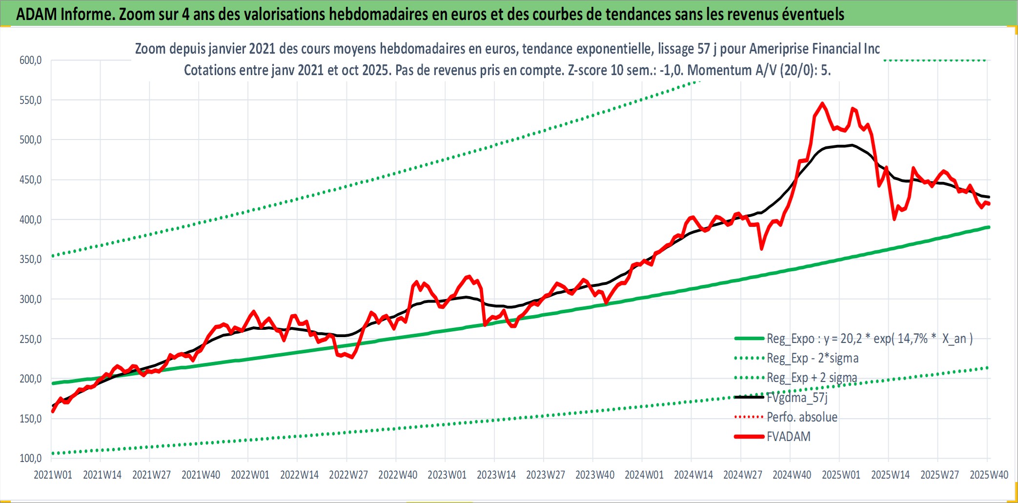 Site dédié aux investisseursPage dédiée sur site financeAnalyse des valorisations hebdomadaires de l'action Ameriprise Financial Inc. Cet actif est cote en USD. Les valorisations sont en contrevaleur EURO et couvrent les semaines 2005W37 a 2025W40. Les revenus de cet actif financier sont pris en compte depuis la semaine 2005W44. La note globale ESG de cet actif est estimee a 9.0 (apres rebasage entre 0 et 20).