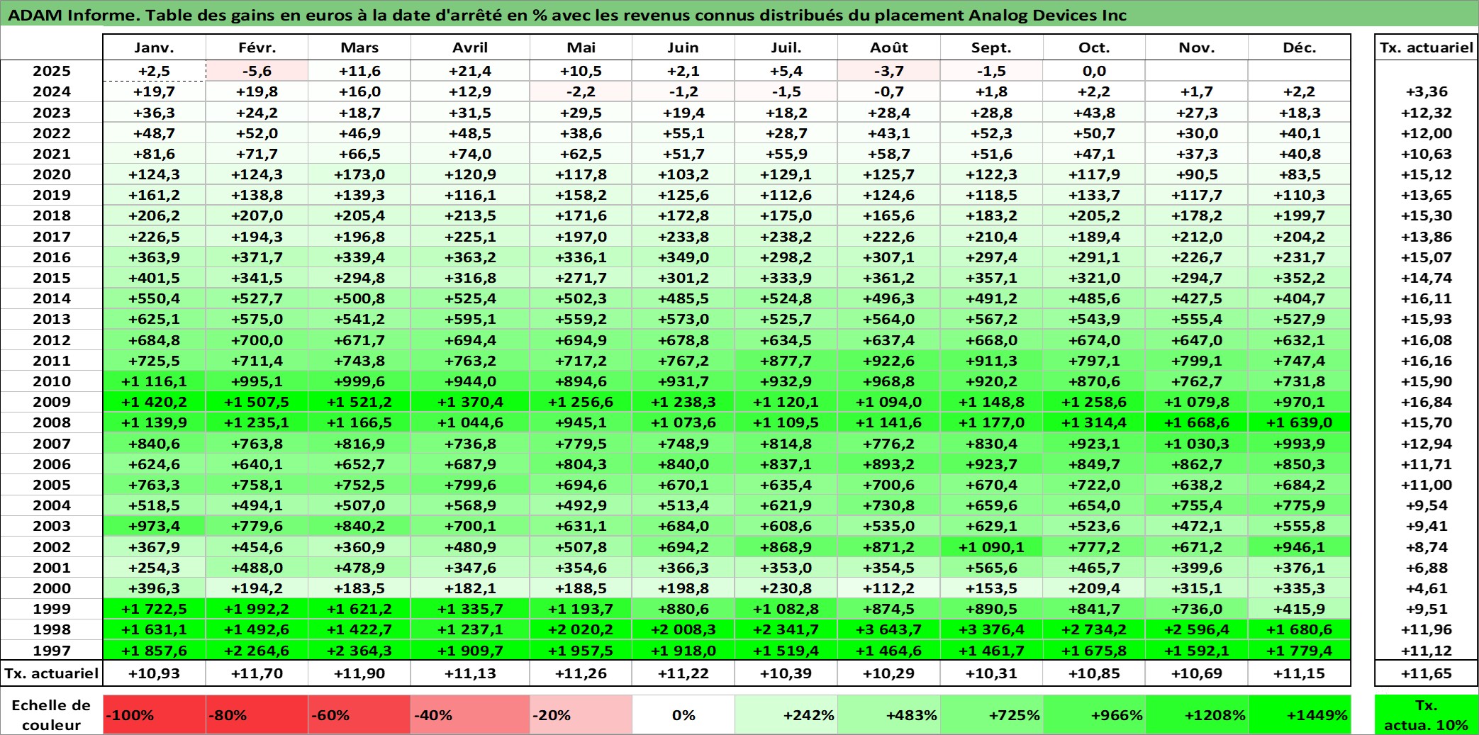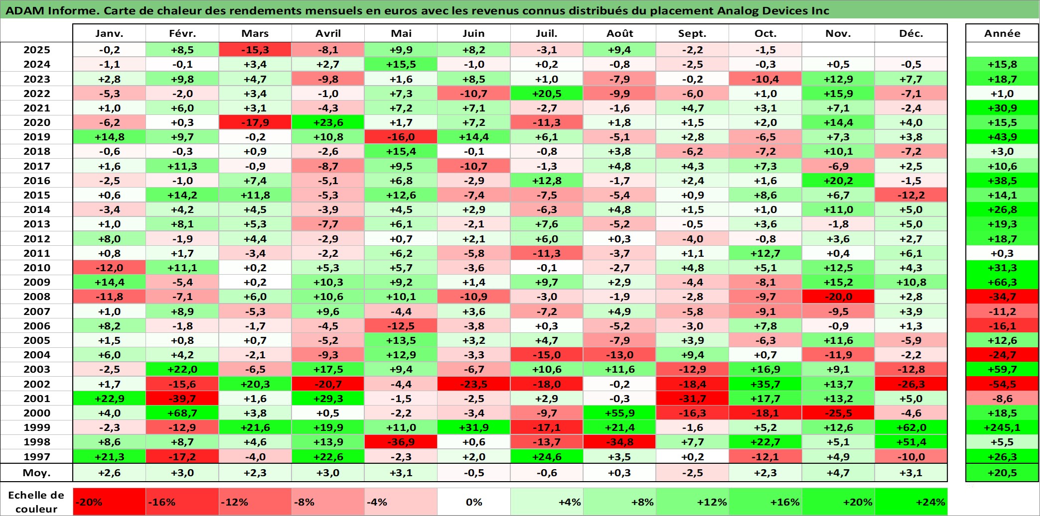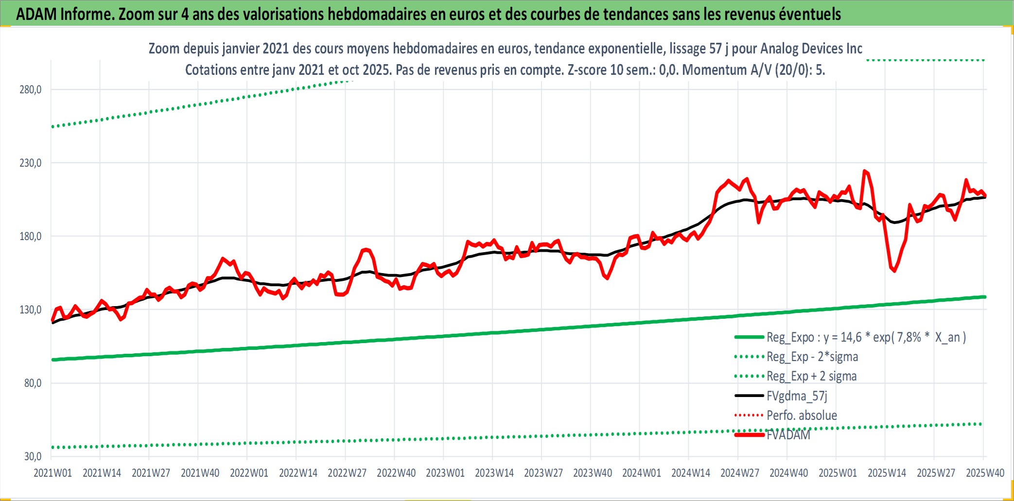 Site dédié aux investisseursPage dédiée sur site financeAnalyse des valorisations hebdomadaires de l'action Analog Devices Inc. Cet actif est cote en USD. Les valorisations sont en contrevaleur EURO et couvrent les semaines 1997W01 a 2025W40. Les revenus de cet actif financier sont pris en compte depuis la semaine 2003W48. La note globale ESG de cet actif est estimee a 8.0 (apres rebasage entre 0 et 20).
