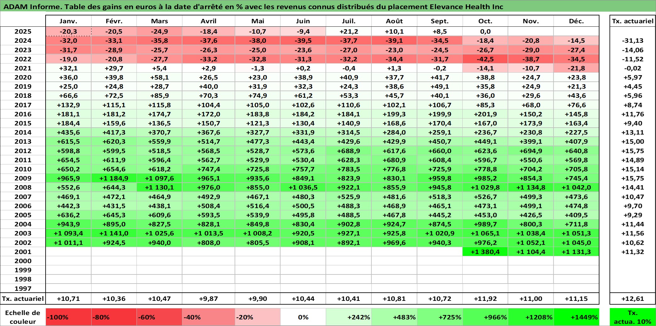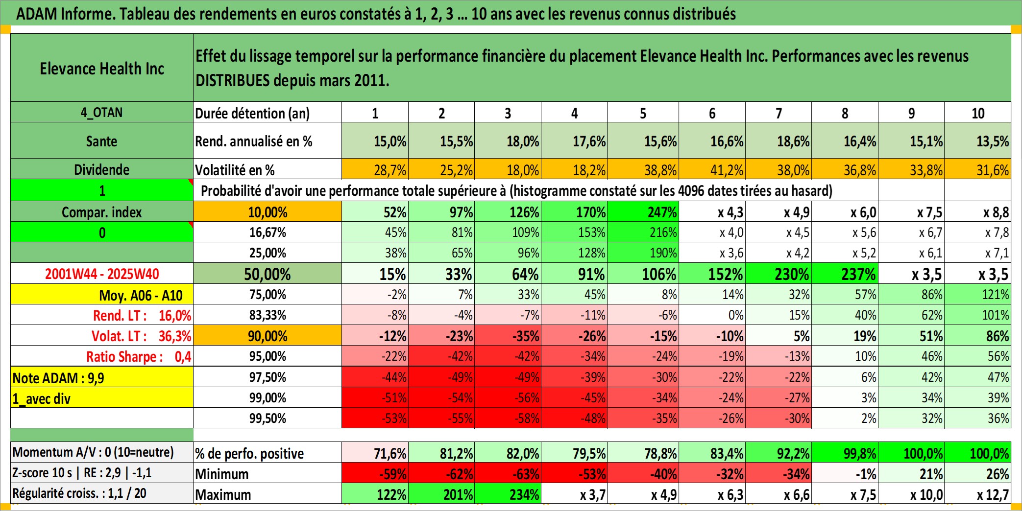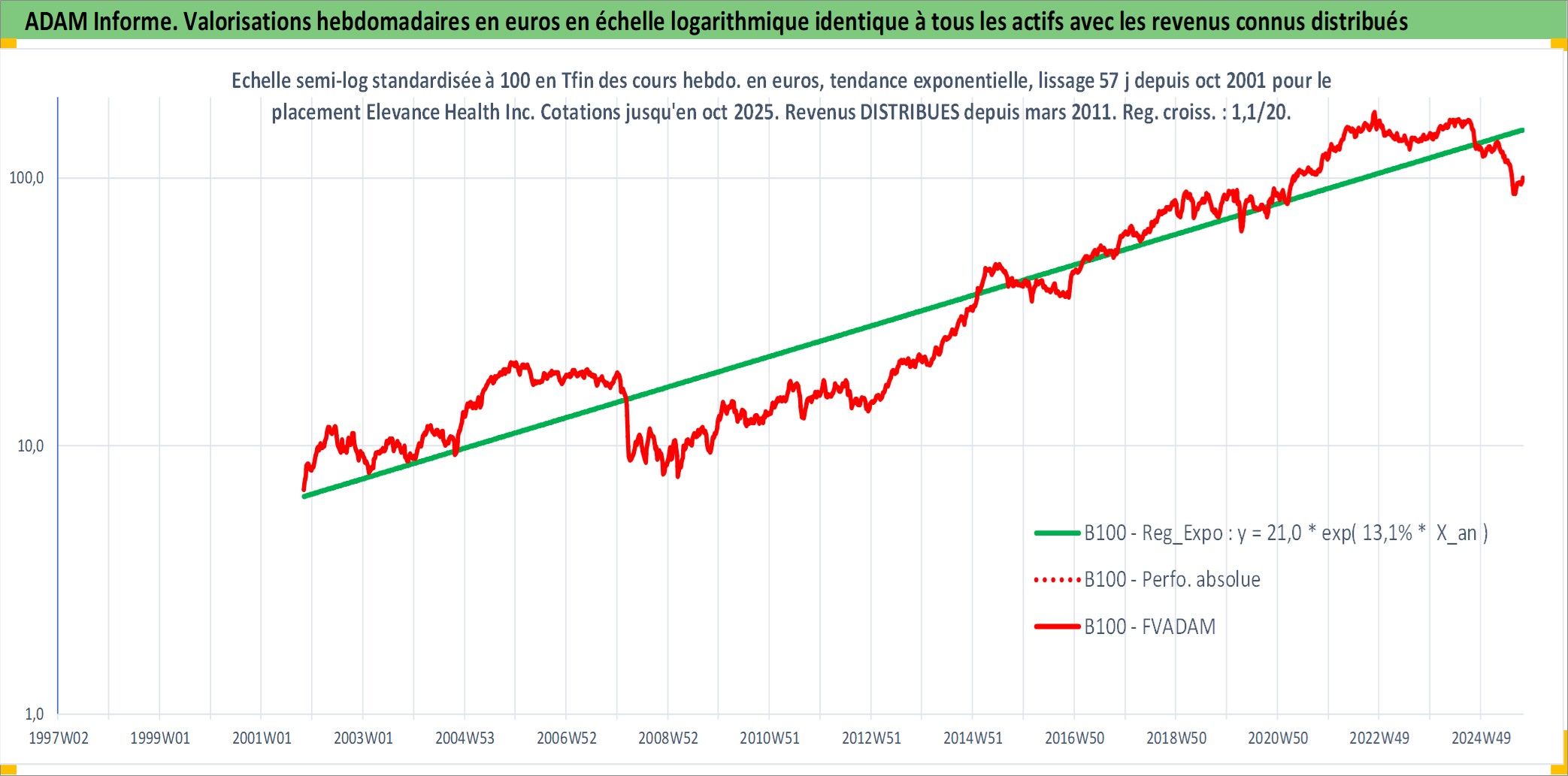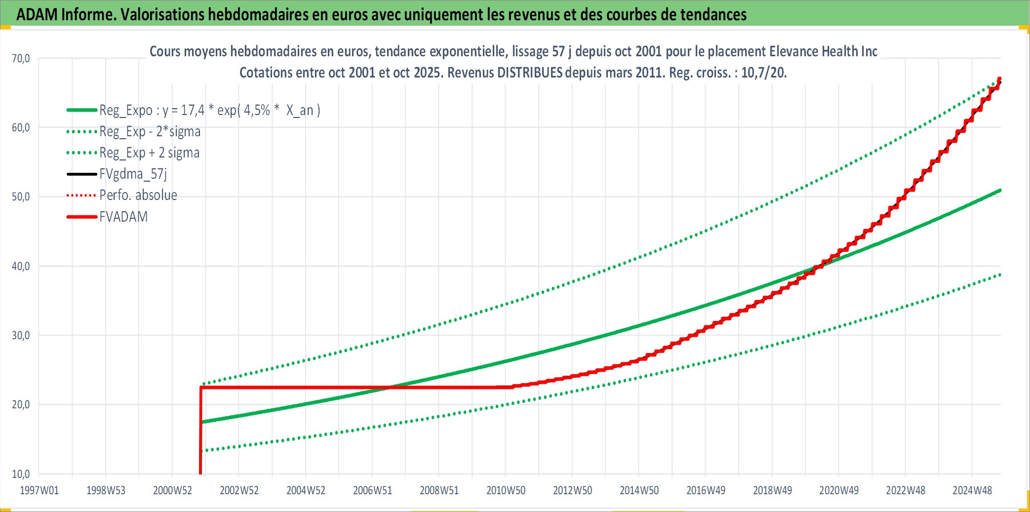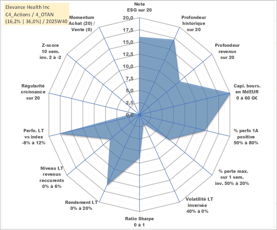 Site dédié aux investisseursPage dédiée sur site financeAnalyse des valorisations hebdomadaires de l'action Elevance Health Inc. Cet actif est cote en USD. Les valorisations sont en contrevaleur EURO et couvrent les semaines 2001W44 a 2025W40. Les revenus de cet actif financier sont pris en compte depuis la semaine 2011W10. La note globale ESG de cet actif est estimee a 16.0 (apres rebasage entre 0 et 20).