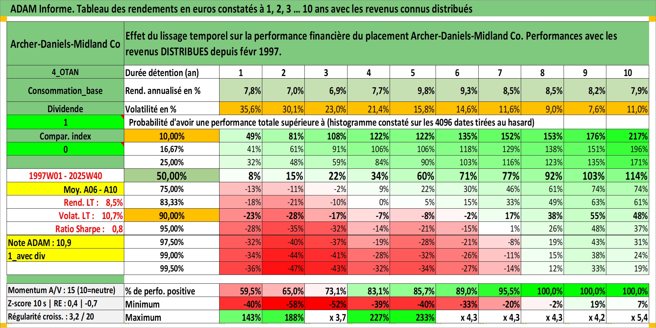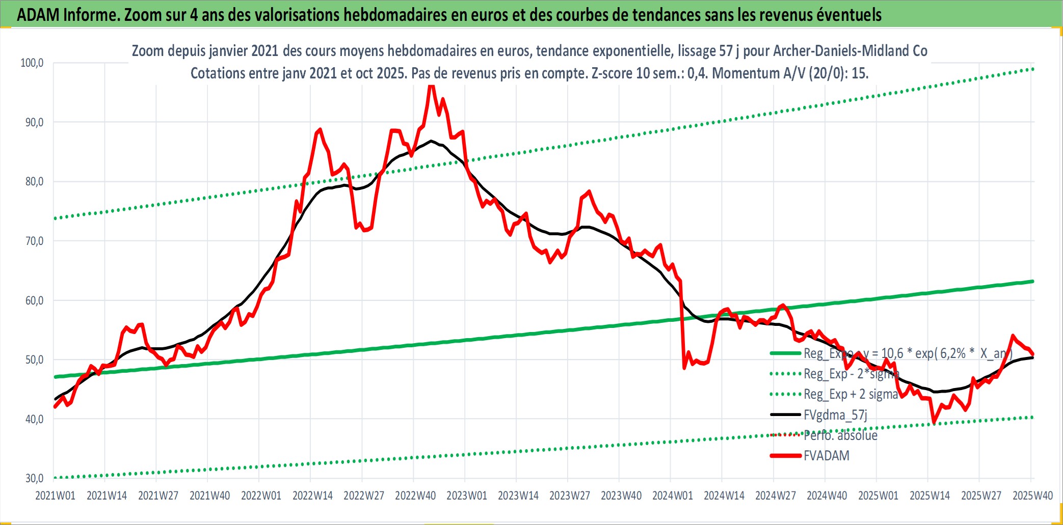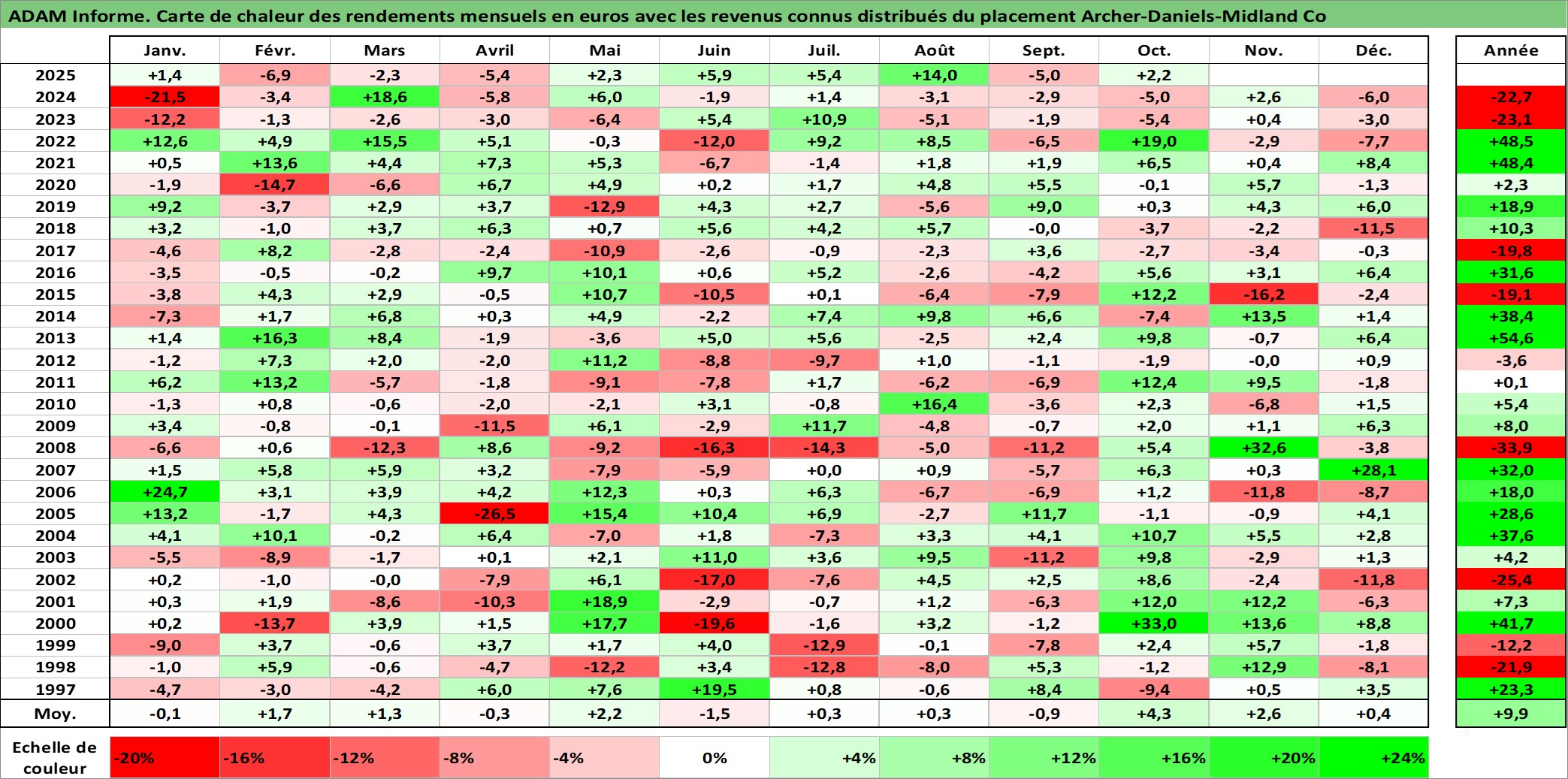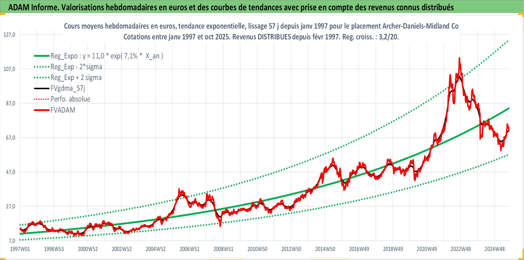 Site dédié aux investisseursPage dédiée sur site financeAnalyse des valorisations hebdomadaires de l'action Archer-Daniels-Midland Co. Cet actif est cote en USD. Les valorisations sont en contrevaleur EURO et couvrent les semaines 1997W01 a 2025W40. Les revenus de cet actif financier sont pris en compte depuis la semaine 1997W06. La note globale ESG de cet actif est estimee a 3.0 (apres rebasage entre 0 et 20).