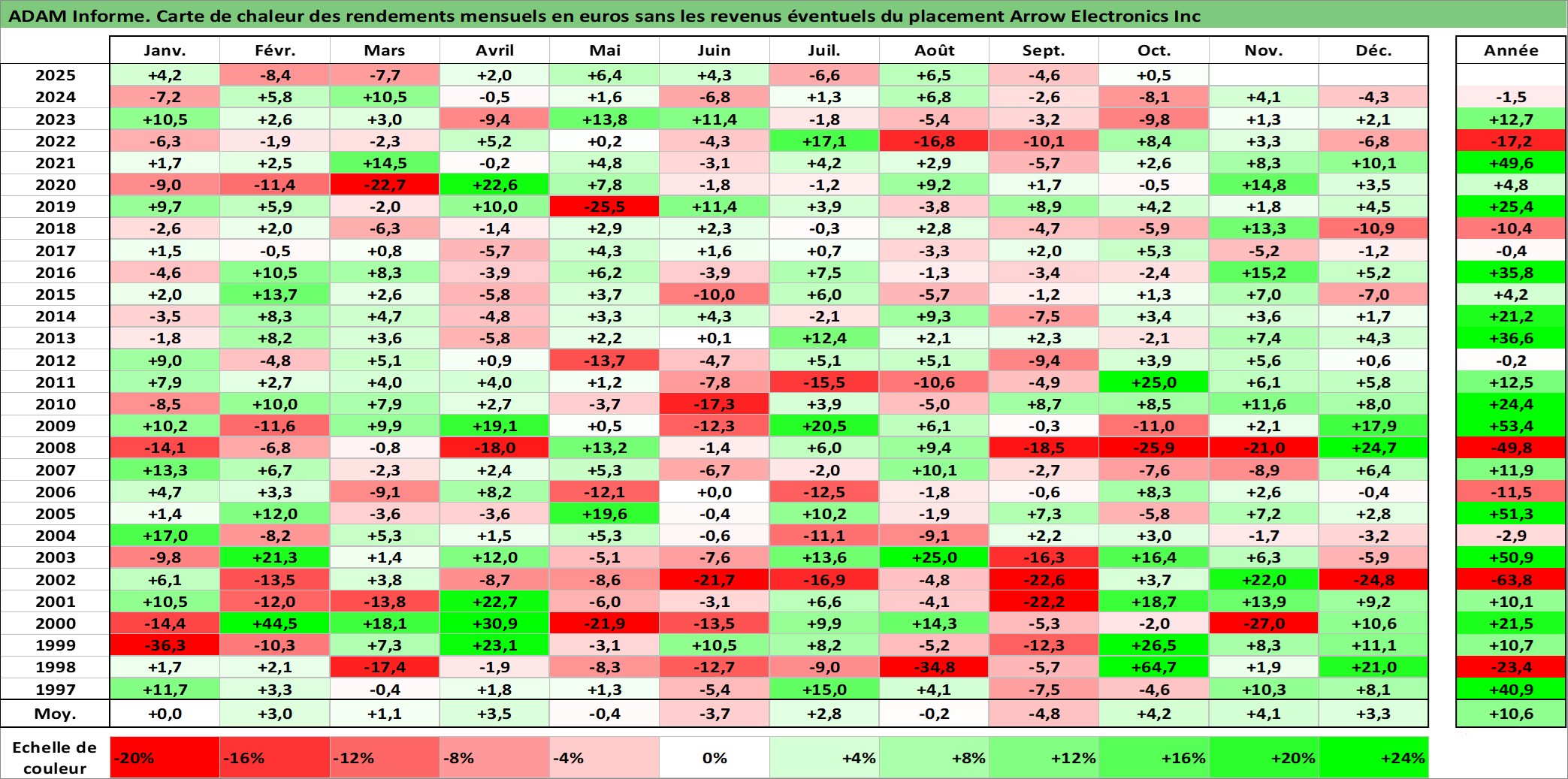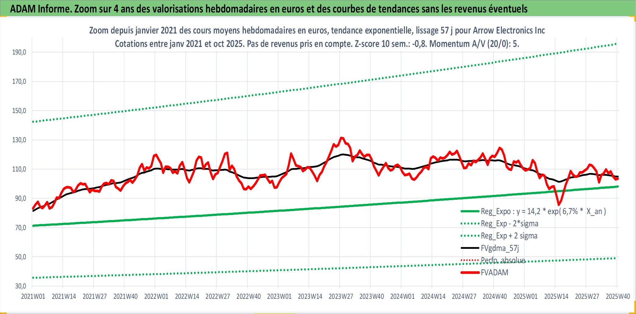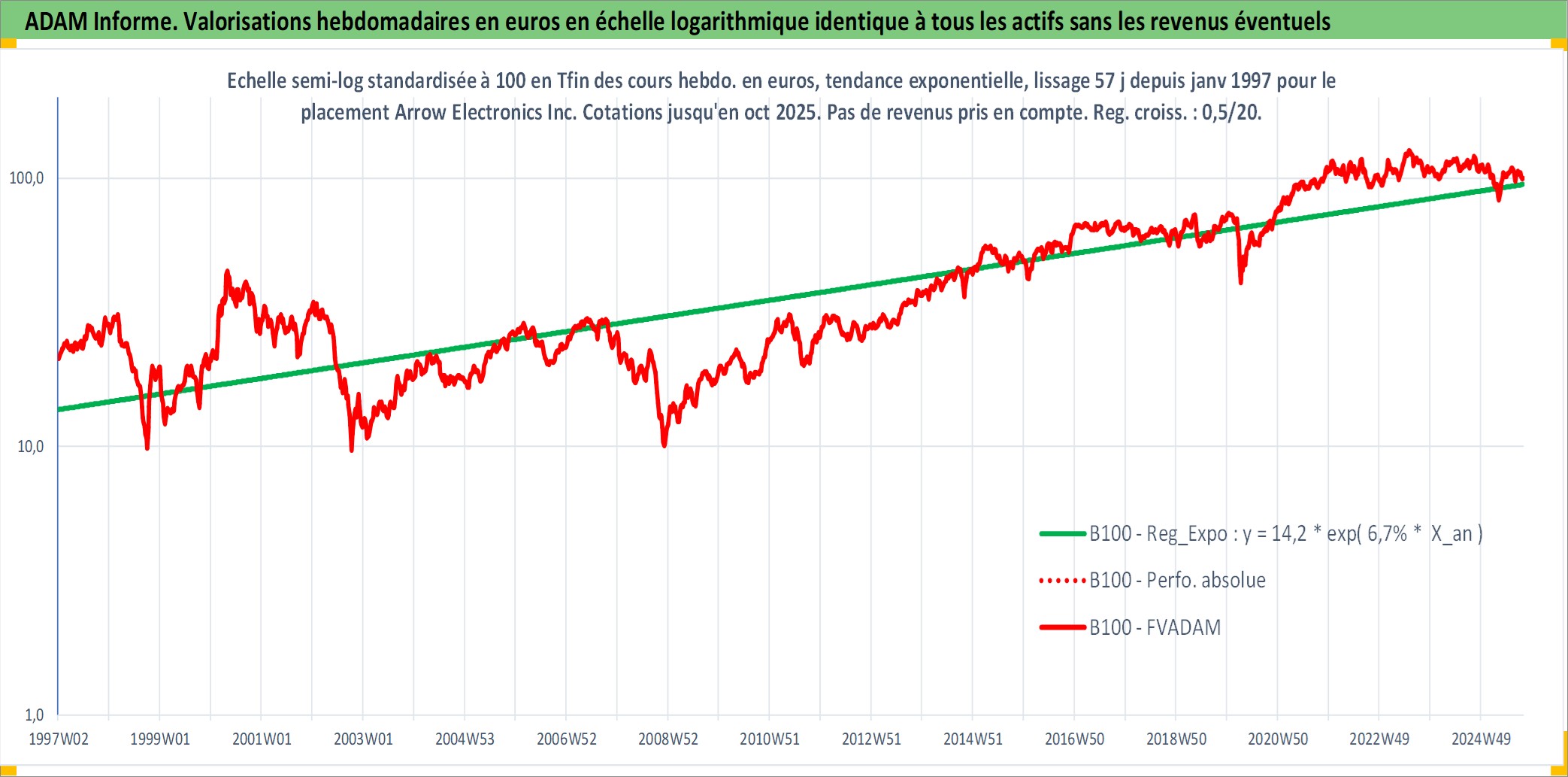 Site dédié aux investisseursPage dédiée sur site financeAnalyse des valorisations hebdomadaires de l'action Arrow Electronics Inc. Cet actif est cote en USD. Les valorisations sont en contrevaleur EURO et couvrent les semaines 1997W01 a 2025W40. Les revenus de cet actif financier ne sont pas connus car non existants ou non disponibles sur le site Yahoo Finance. La note globale ESG de cet actif est estimee a 17.0 (apres rebasage entre 0 et 20).