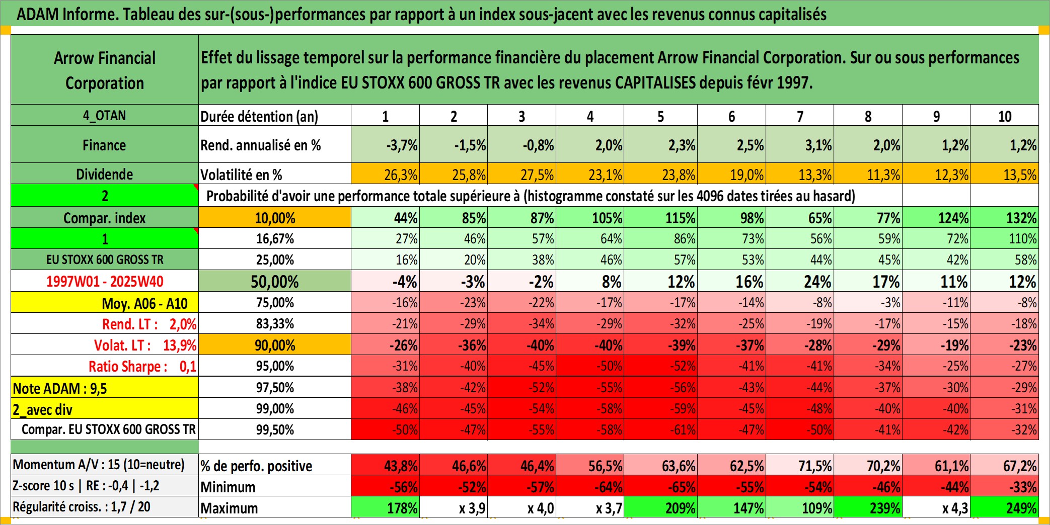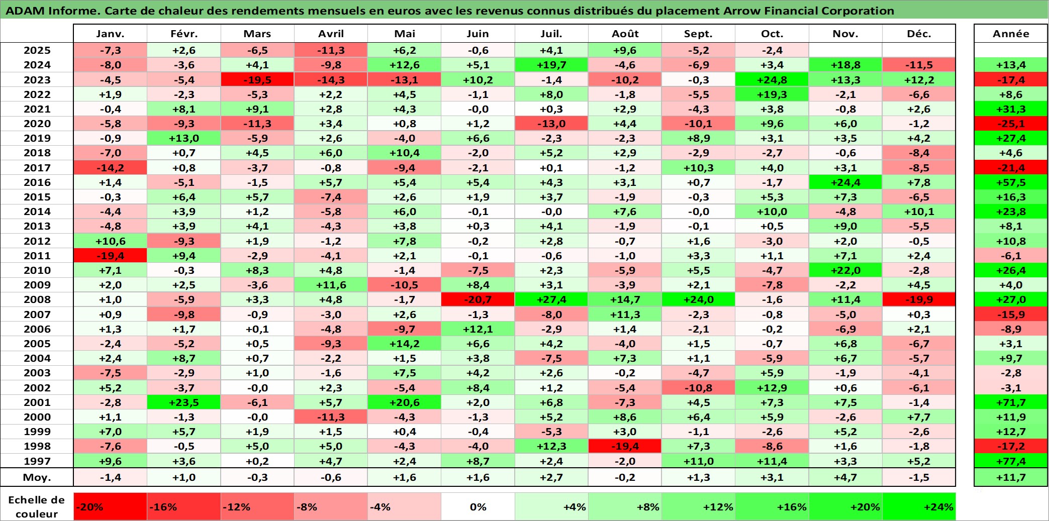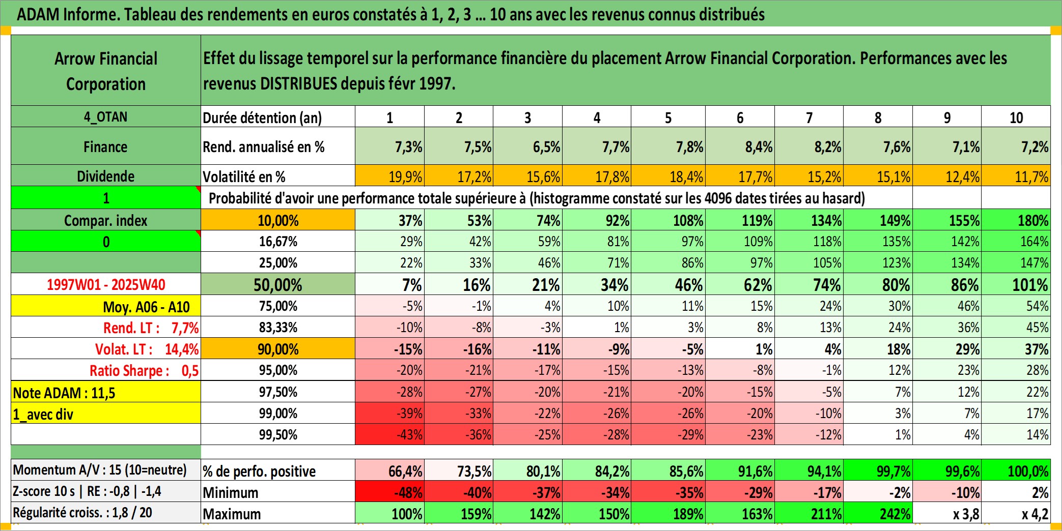Site dédié aux investisseursPage dédiée sur site financeAnalyse des valorisations hebdomadaires de l'action Arrow Financial Corporation. Cet actif est cote en USD. Les valorisations sont en contrevaleur EURO et couvrent les semaines 1997W01 a 2025W40. Les revenus de cet actif financier sont pris en compte depuis la semaine 1997W09. La note ESG de cet actif n'est pas connue.