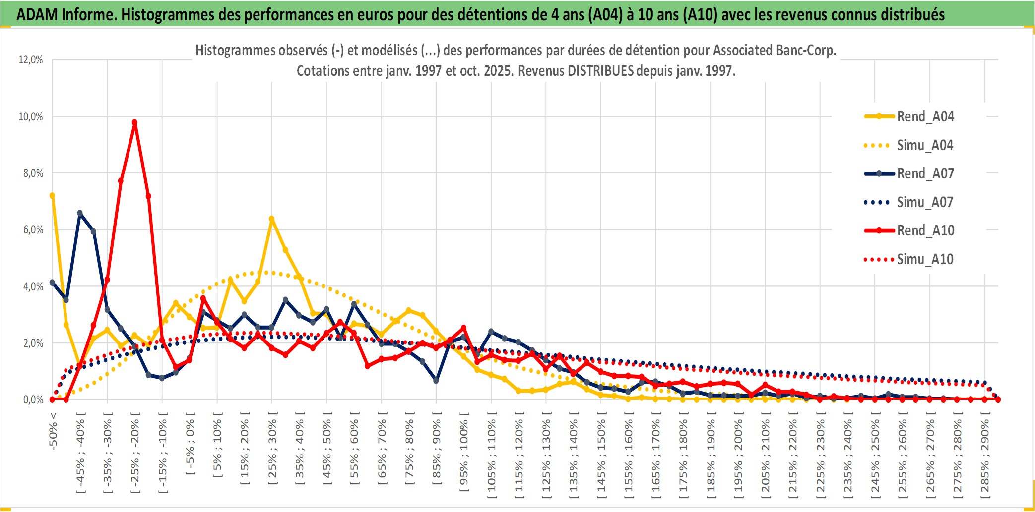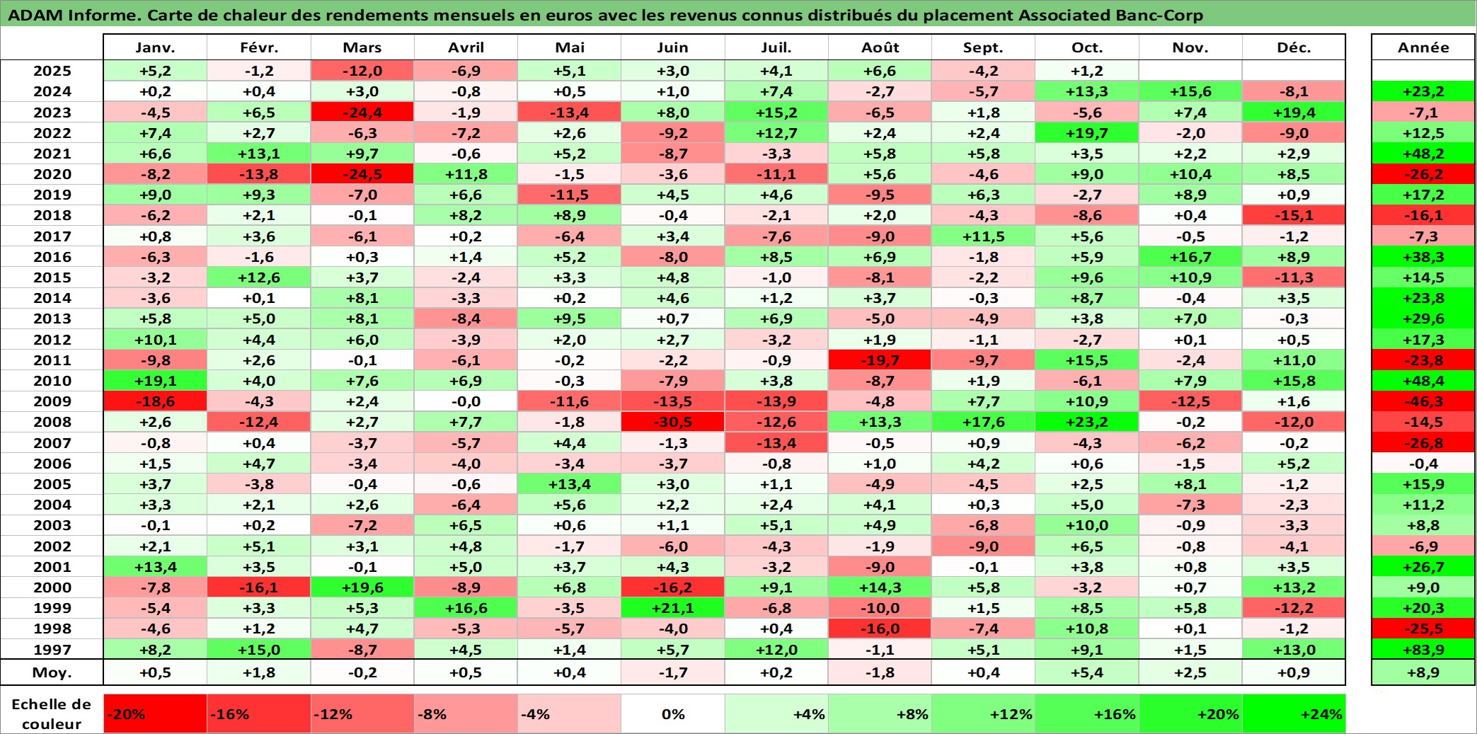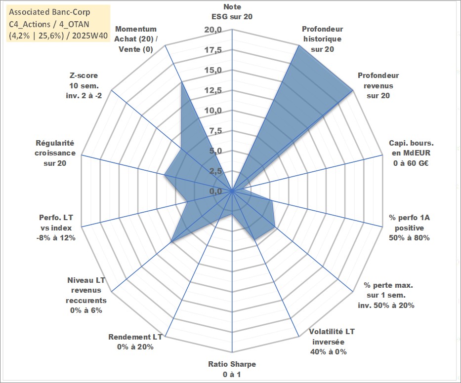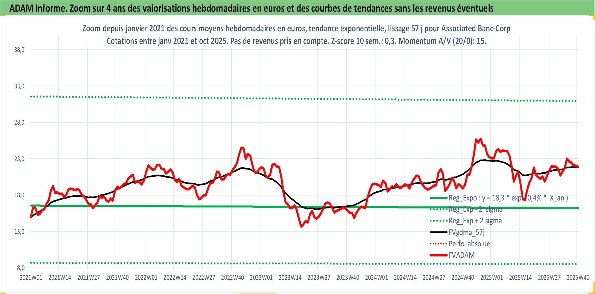 Site dédié aux investisseursPage dédiée sur site financeAnalyse des valorisations hebdomadaires de l'action Associated Banc-Corp. Cet actif est cote en USD. Les valorisations sont en contrevaleur EURO et couvrent les semaines 1997W01 a 2025W40. Les revenus de cet actif financier sont pris en compte depuis la semaine 1997W05. La note ESG de cet actif n'est pas connue.