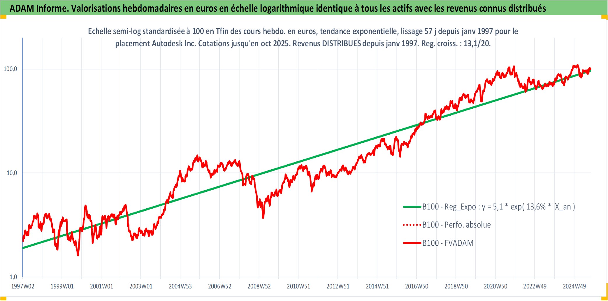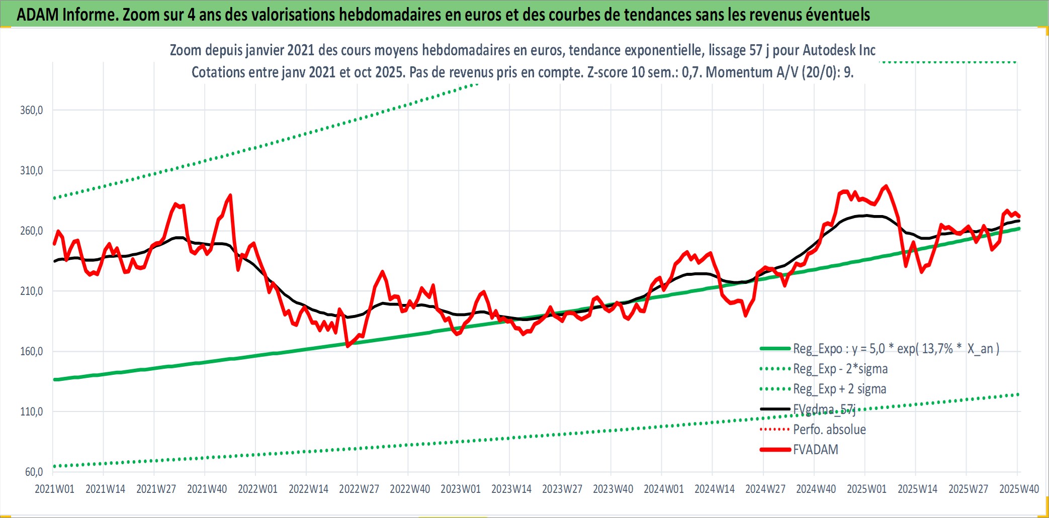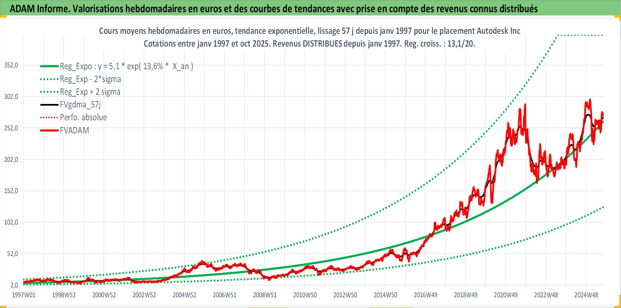 Site dédié aux investisseursPage dédiée sur site financeAnalyse des valorisations hebdomadaires de l'action Autodesk Inc. Cet actif est cote en USD. Les valorisations sont en contrevaleur EURO et couvrent les semaines 1997W01 a 2025W40. Les revenus de cet actif financier sont pris en compte depuis la semaine 1997W02. La note globale ESG de cet actif est estimee a 13.0 (apres rebasage entre 0 et 20).