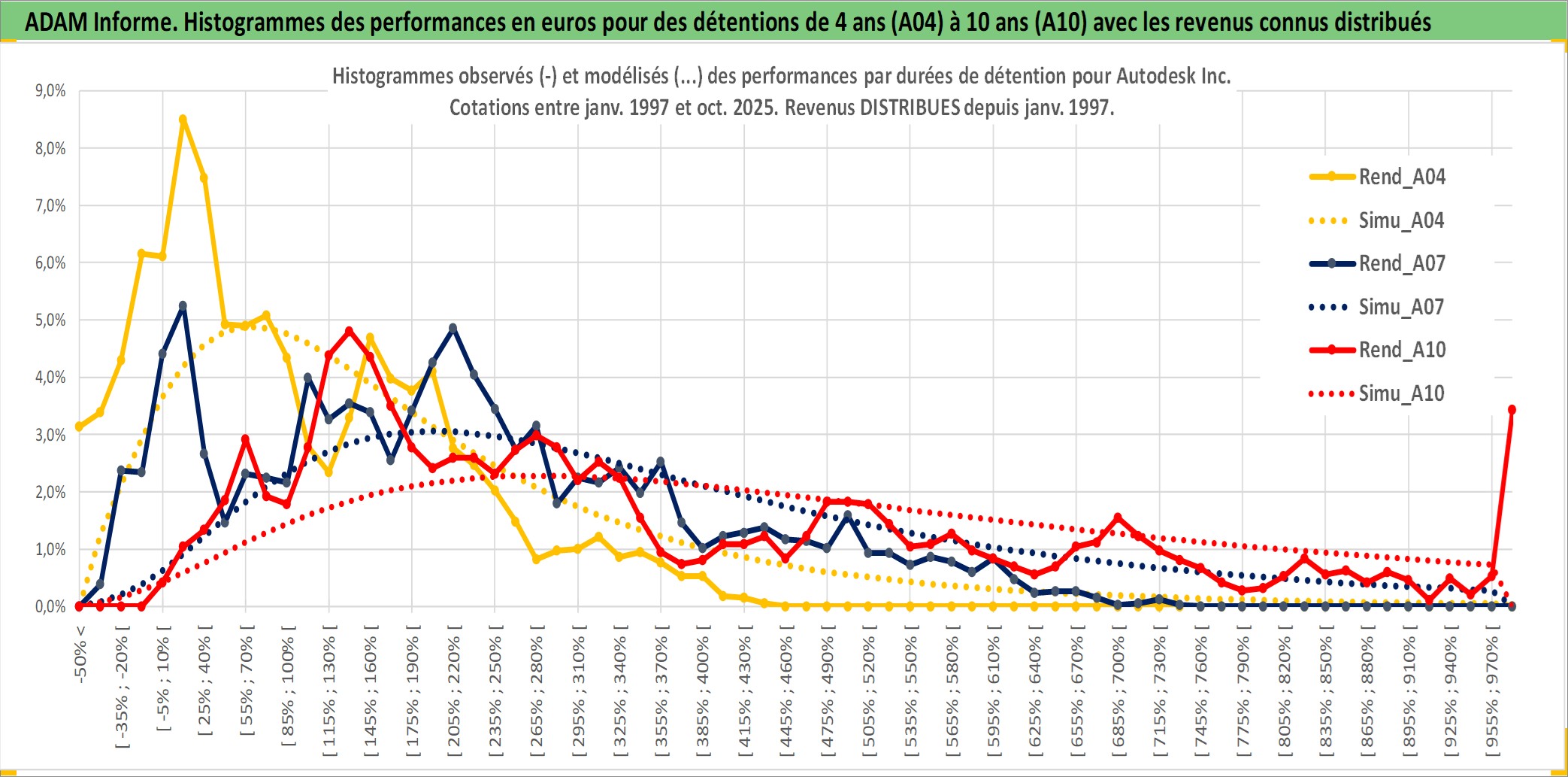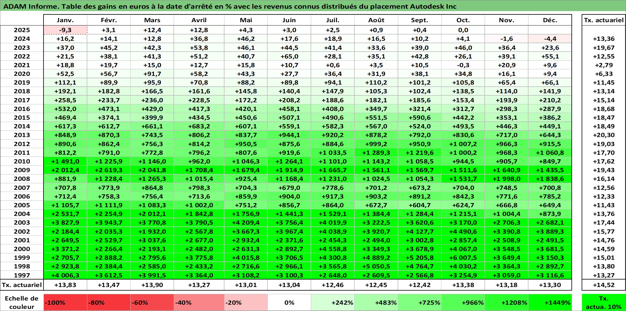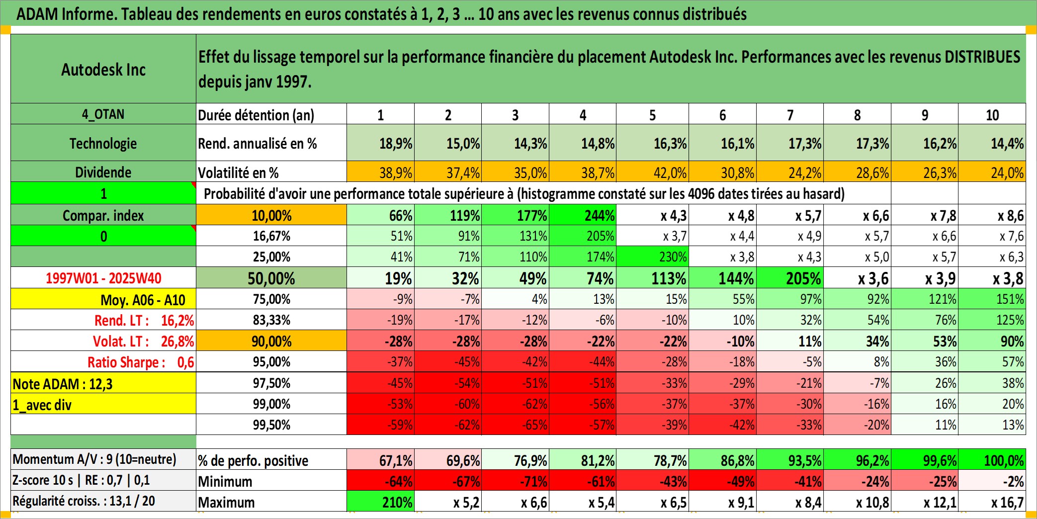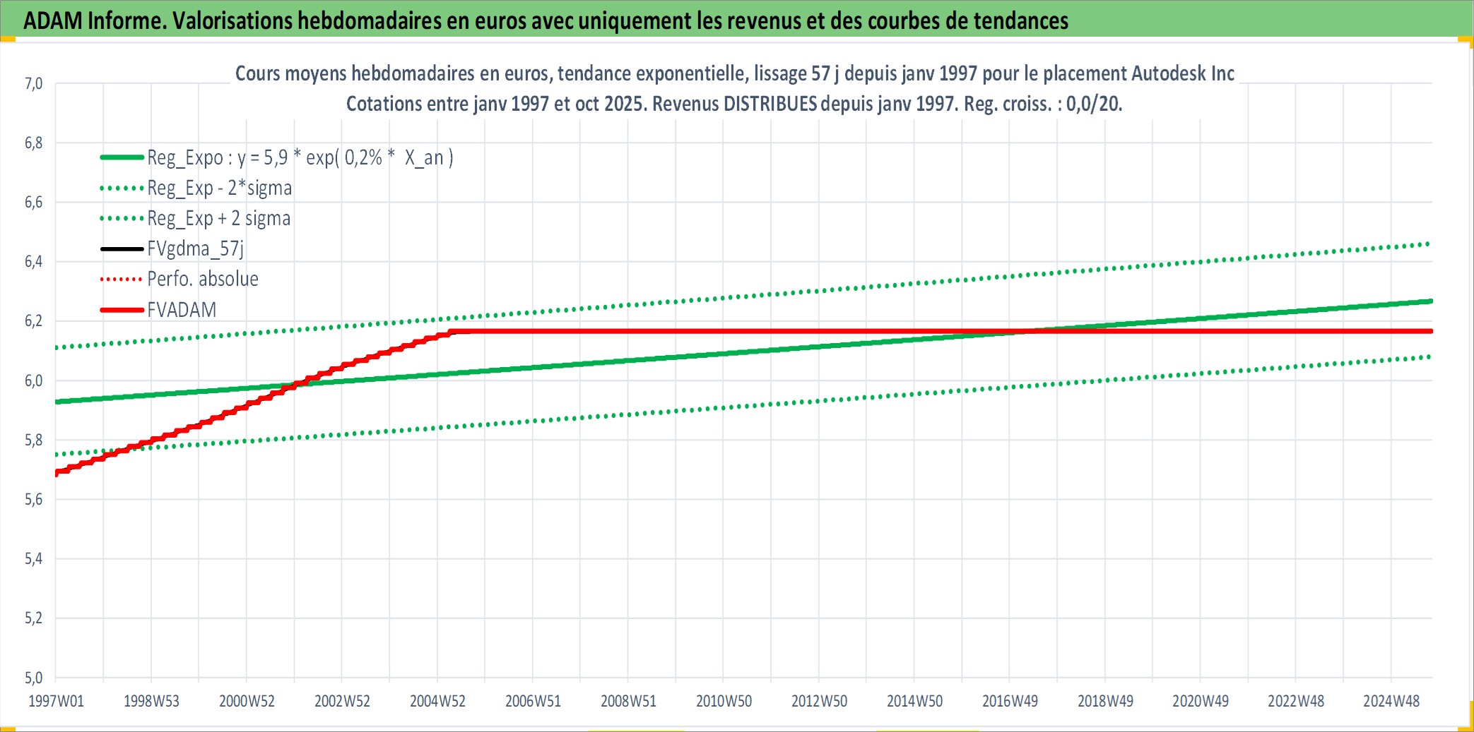 Site dédié aux investisseursPage dédiée sur site financeAnalyse des valorisations hebdomadaires de l'action Autodesk Inc. Cet actif est cote en USD. Les valorisations sont en contrevaleur EURO et couvrent les semaines 1997W01 a 2025W40. Les revenus de cet actif financier sont pris en compte depuis la semaine 1997W02. La note globale ESG de cet actif est estimee a 13.0 (apres rebasage entre 0 et 20).