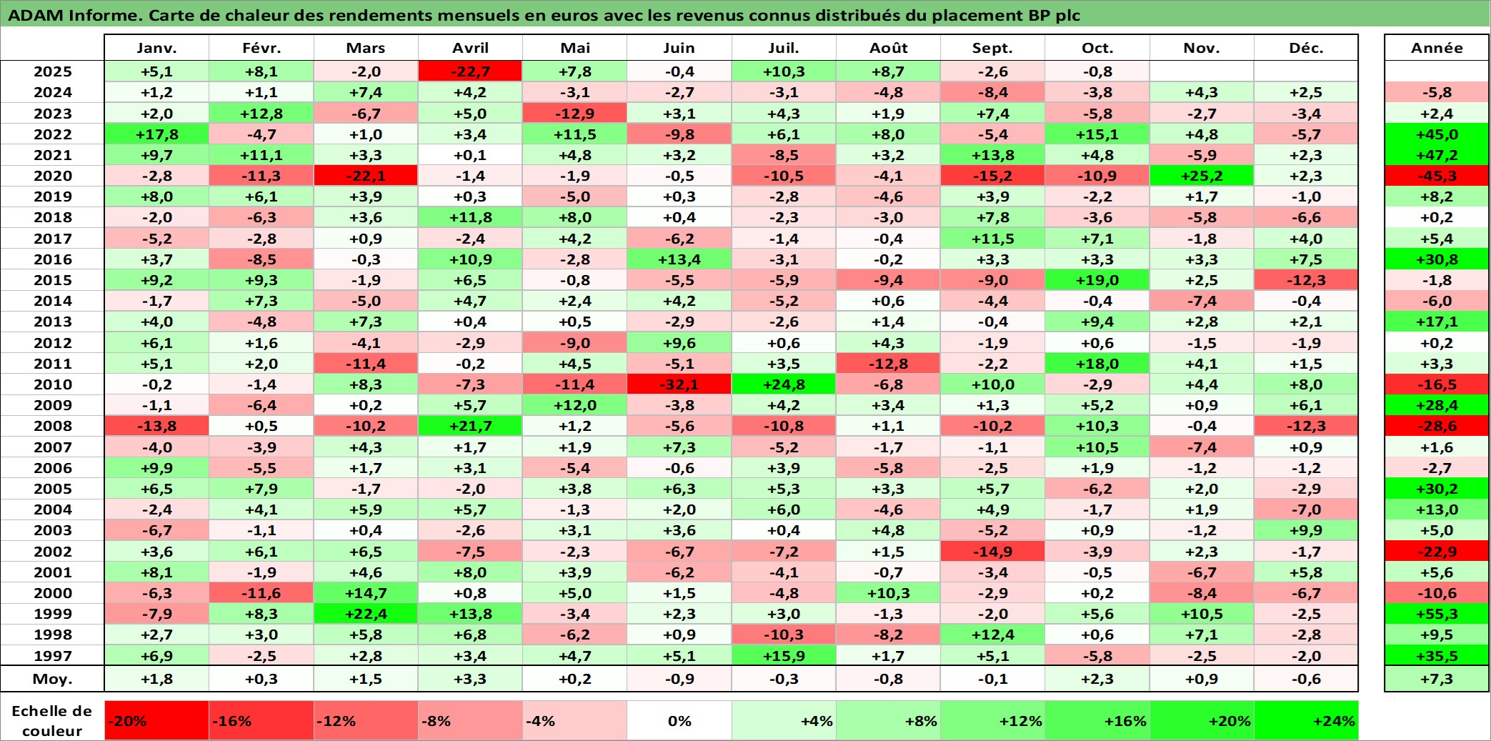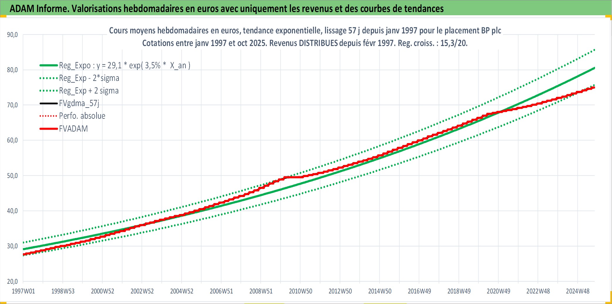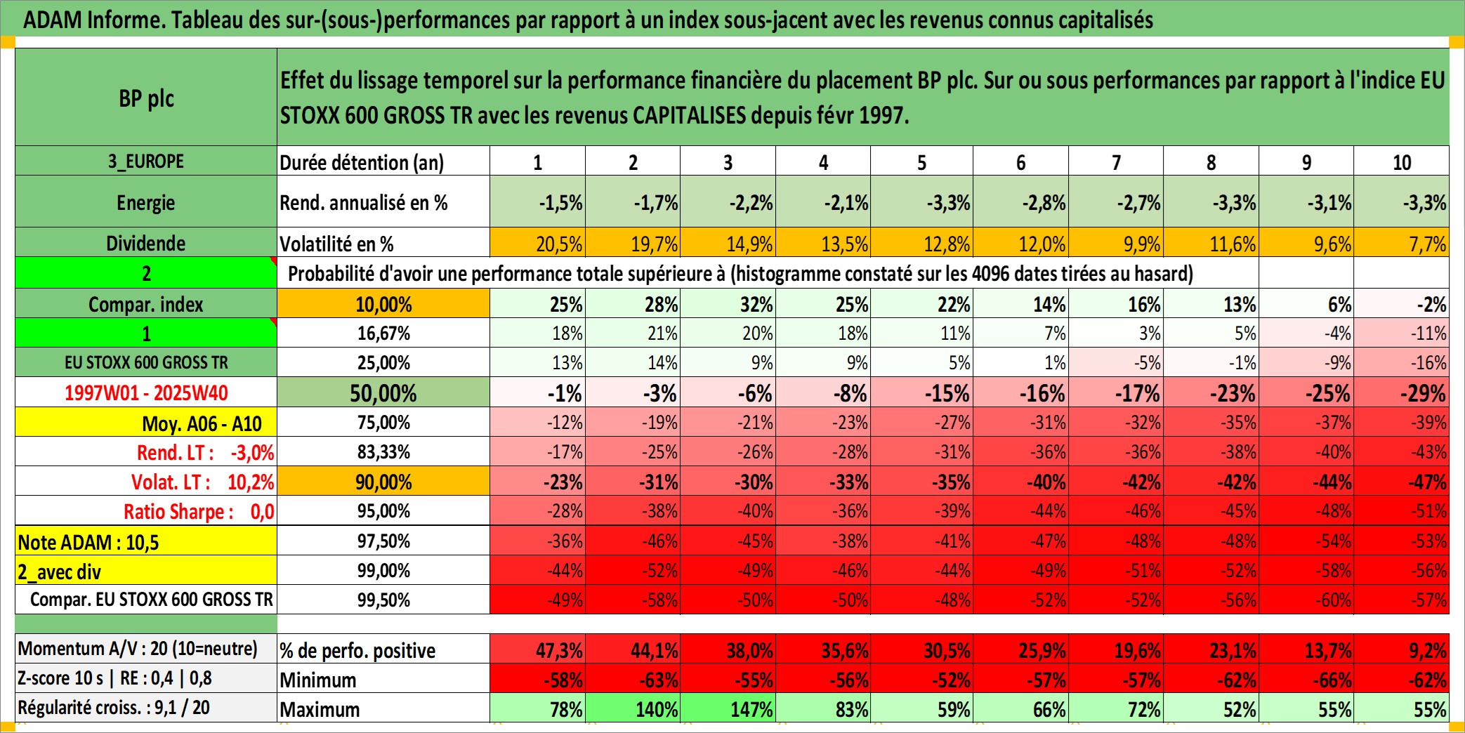 Site dédié aux investisseursPage dédiée sur site financeAnalyse des valorisations hebdomadaires de l'action BP plc. Cet actif est cote en USD. Les valorisations sont en contrevaleur EURO et couvrent les semaines 1997W01 a 2025W40. Les revenus de cet actif financier sont pris en compte depuis la semaine 1997W08. La note ESG de cet actif n'est pas connue.