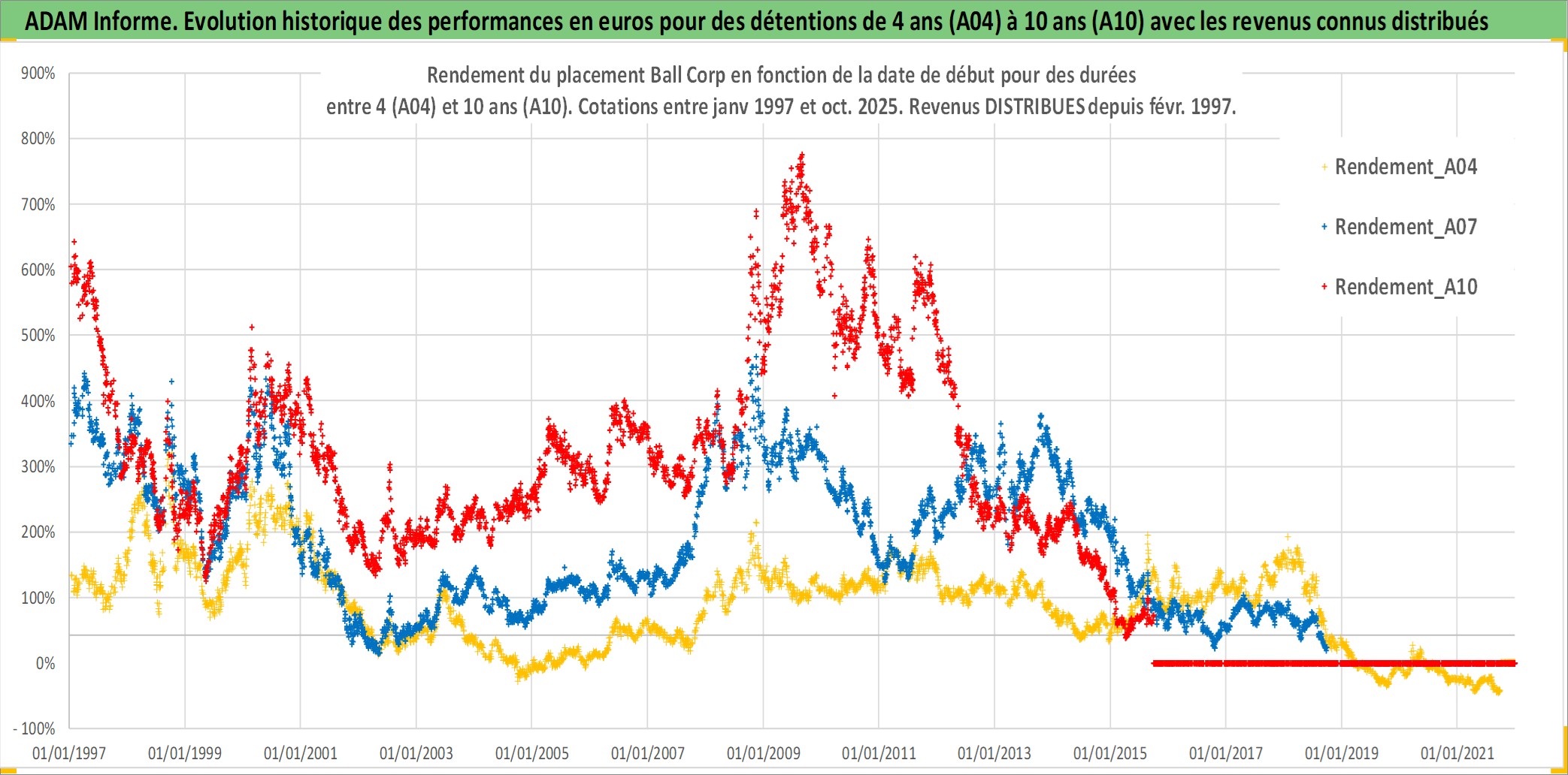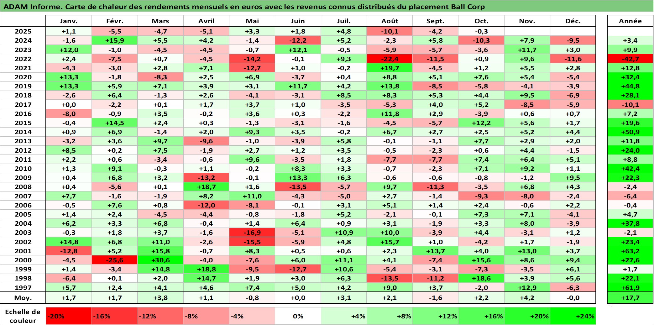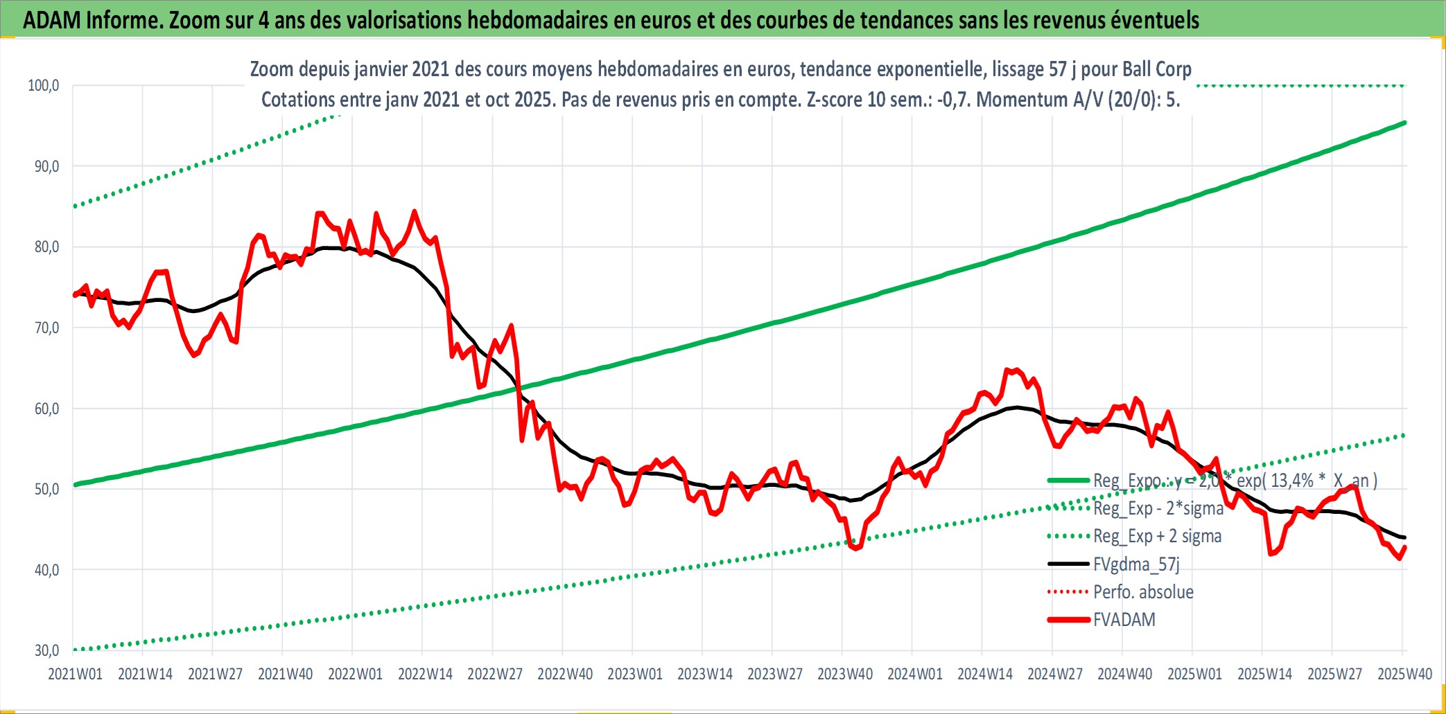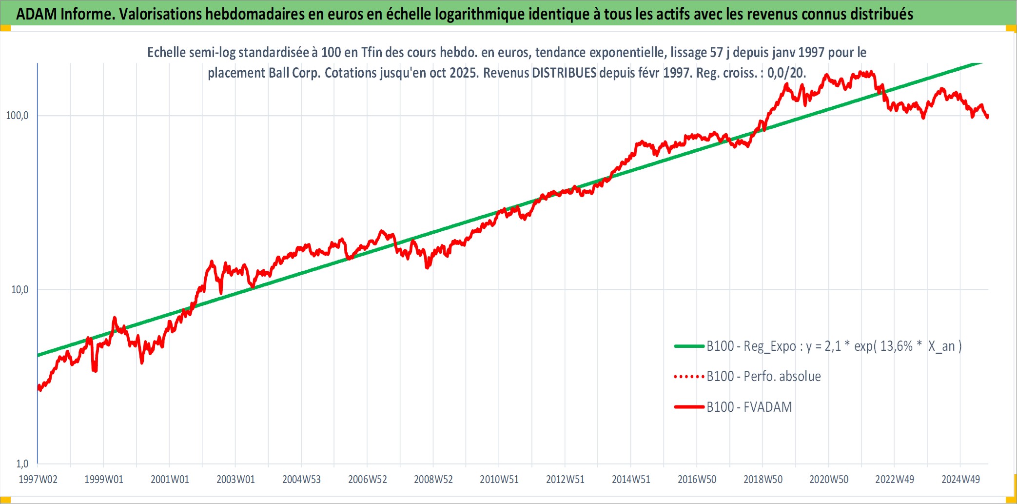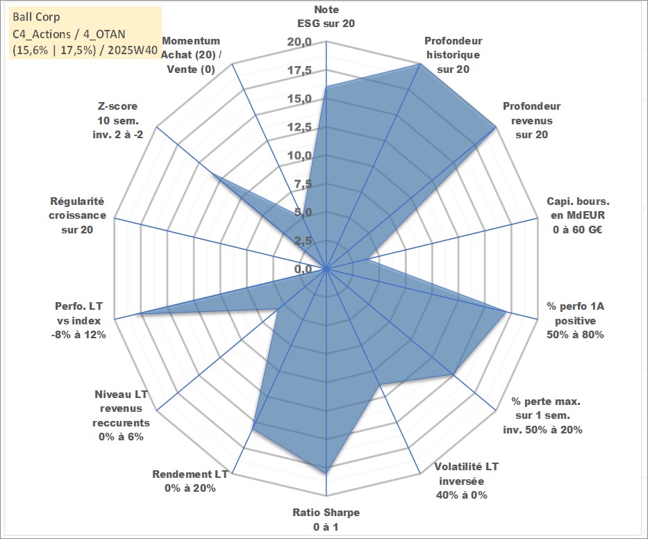 Site dédié aux investisseursPage dédiée sur site financeAnalyse des valorisations hebdomadaires de l'action Ball Corp. Cet actif est cote en USD. Les valorisations sont en contrevaleur EURO et couvrent les semaines 1997W01 a 2025W40. Les revenus de cet actif financier sont pris en compte depuis la semaine 1997W09. La note globale ESG de cet actif est estimee a 16.0 (apres rebasage entre 0 et 20).