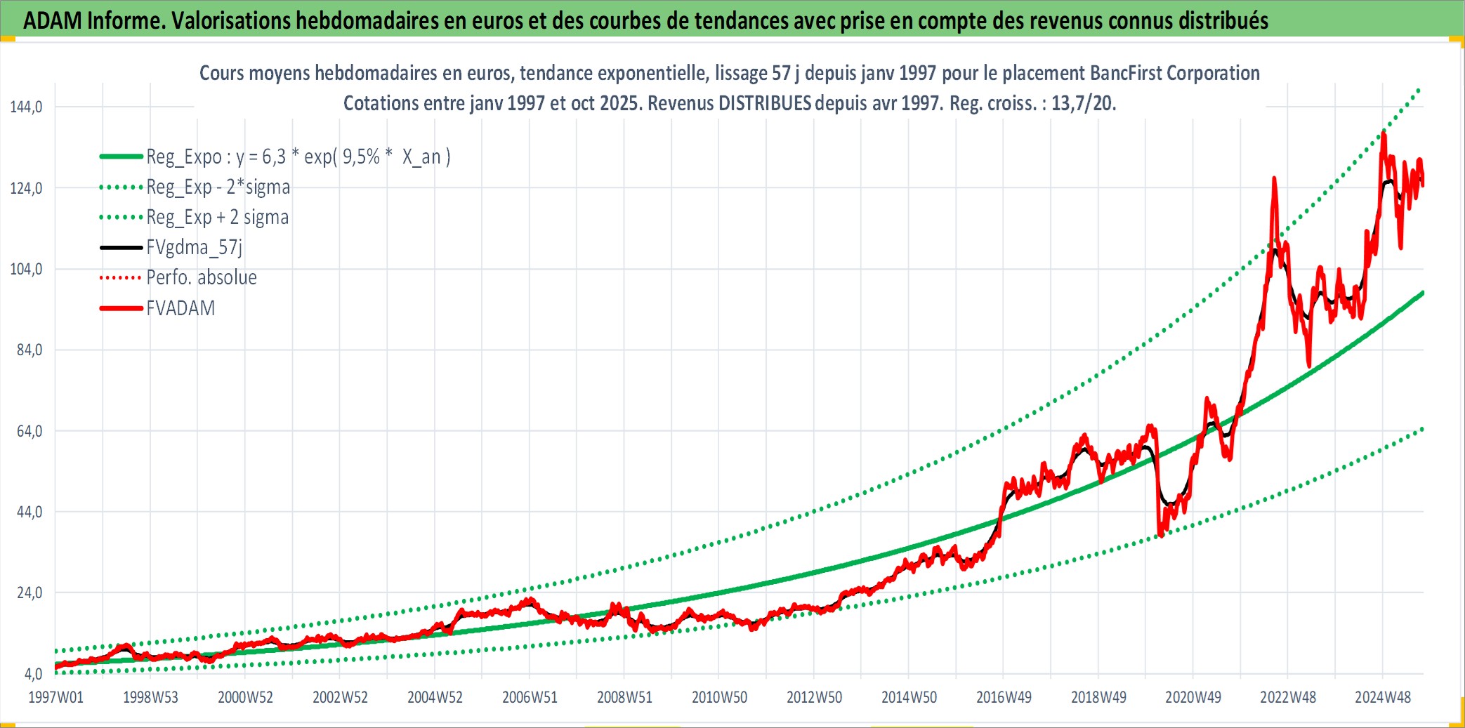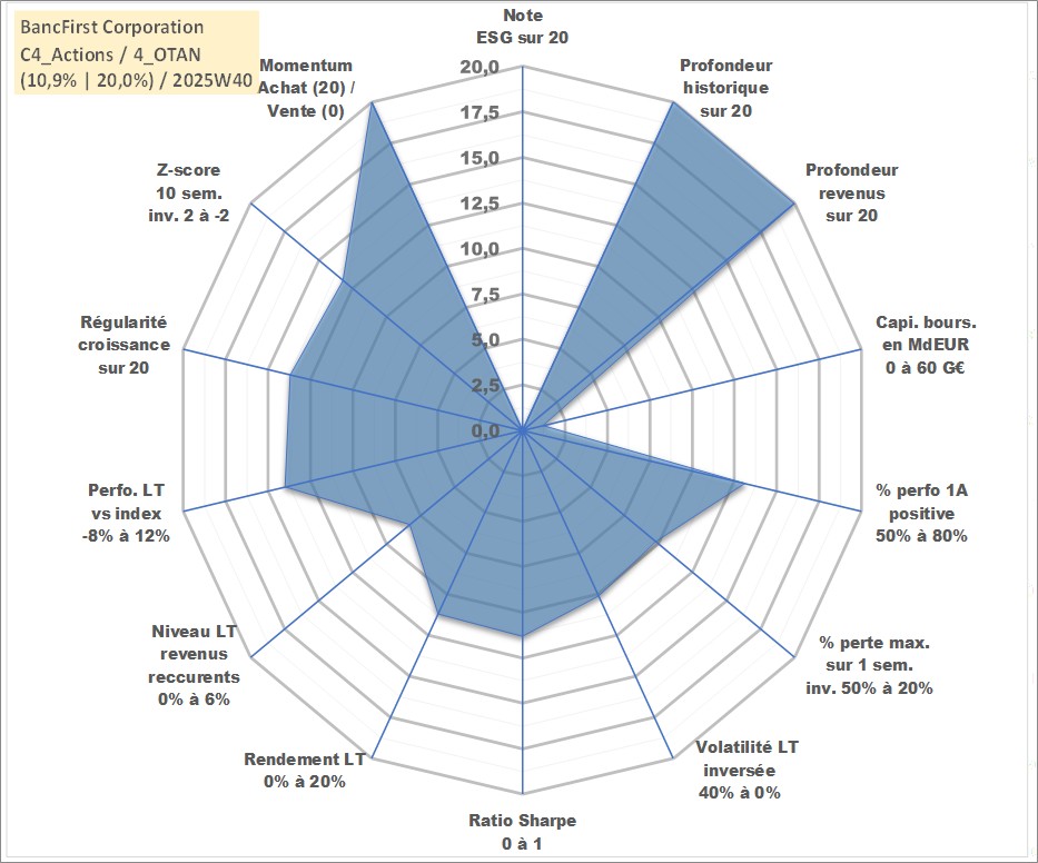 Site dédié aux investisseursPage dédiée sur site financeAnalyse des valorisations hebdomadaires de l'action BancFirst Corporation. Cet actif est cote en USD. Les valorisations sont en contrevaleur EURO et couvrent les semaines 1997W01 a 2025W40. Les revenus de cet actif financier sont pris en compte depuis la semaine 1997W16. La note ESG de cet actif n'est pas connue.