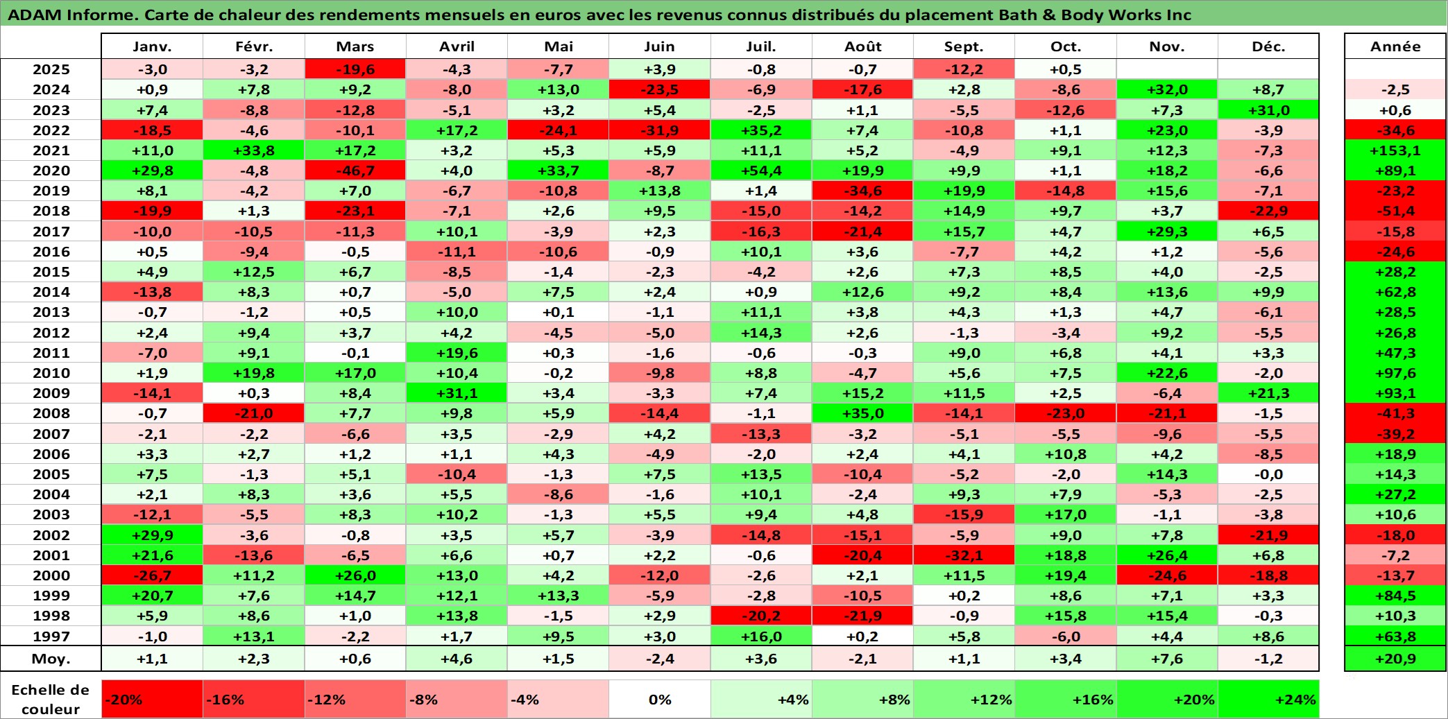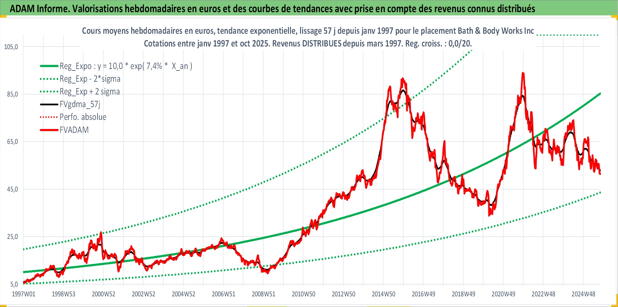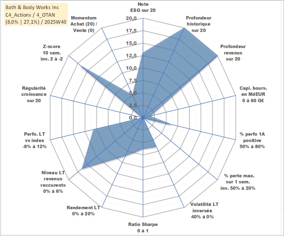 Site dédié aux investisseursPage dédiée sur site financeAnalyse des valorisations hebdomadaires de l'action Bath & Body Works Inc. Cet actif est cote en USD. Les valorisations sont en contrevaleur EURO et couvrent les semaines 1997W01 a 2025W40. Les revenus de cet actif financier sont pris en compte depuis la semaine 1997W10. La note globale ESG de cet actif est estimee a 13.0 (apres rebasage entre 0 et 20).