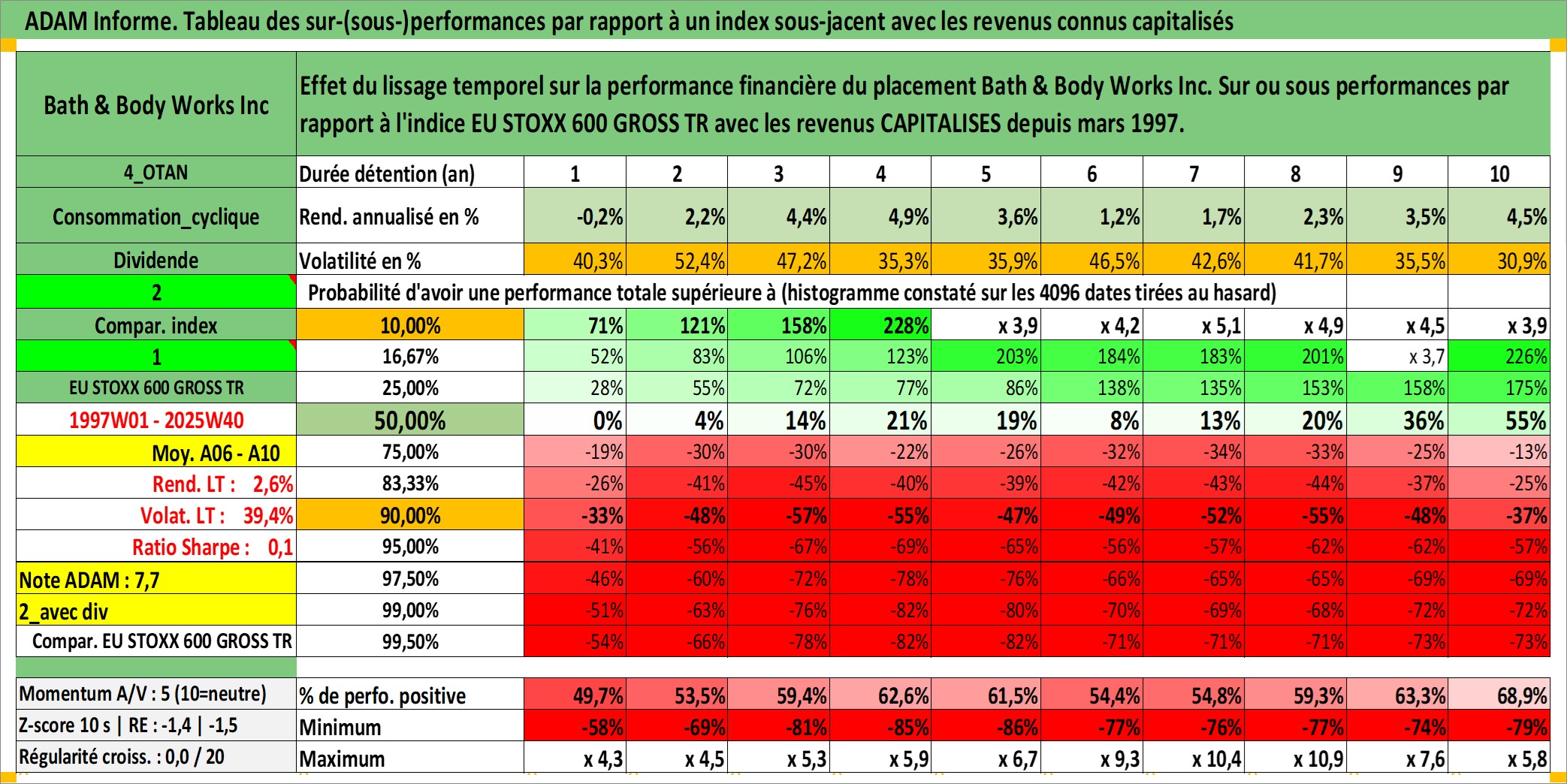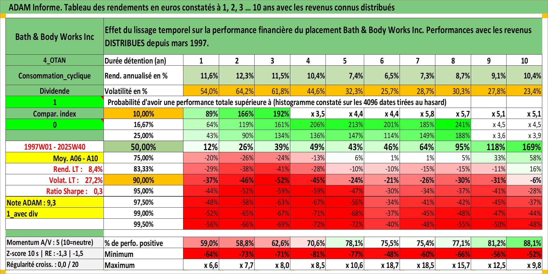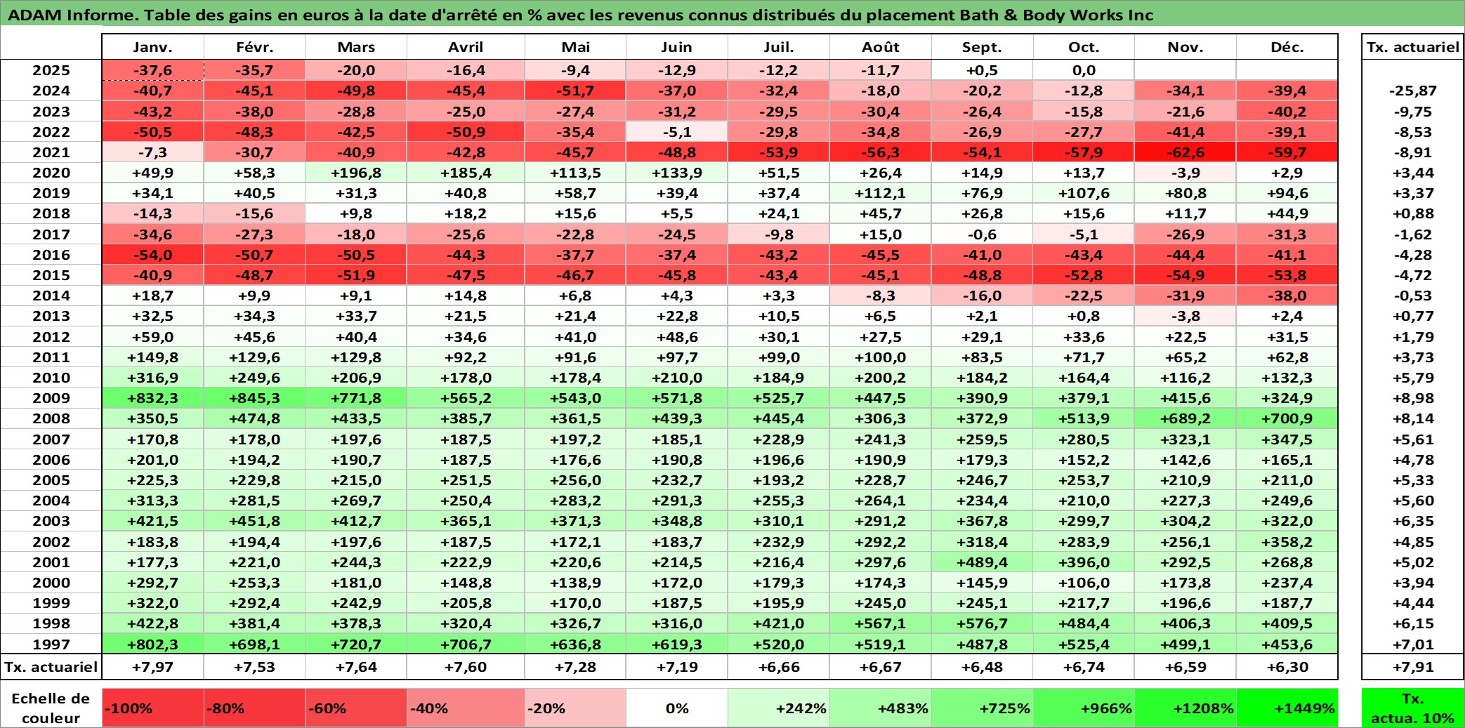 Site dédié aux investisseursPage dédiée sur site financeAnalyse des valorisations hebdomadaires de l'action Bath & Body Works Inc. Cet actif est cote en USD. Les valorisations sont en contrevaleur EURO et couvrent les semaines 1997W01 a 2025W40. Les revenus de cet actif financier sont pris en compte depuis la semaine 1997W10. La note globale ESG de cet actif est estimee a 13.0 (apres rebasage entre 0 et 20).