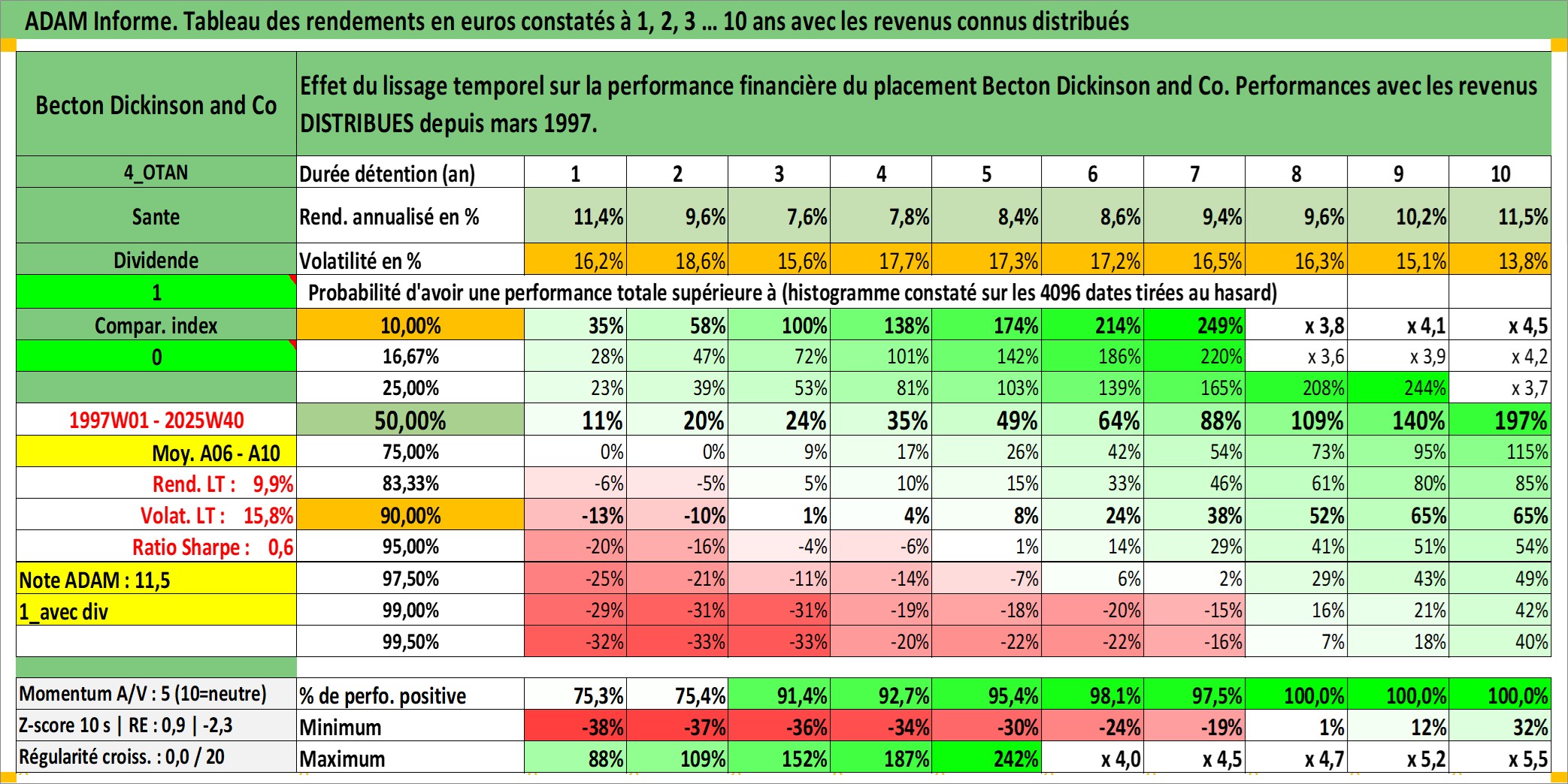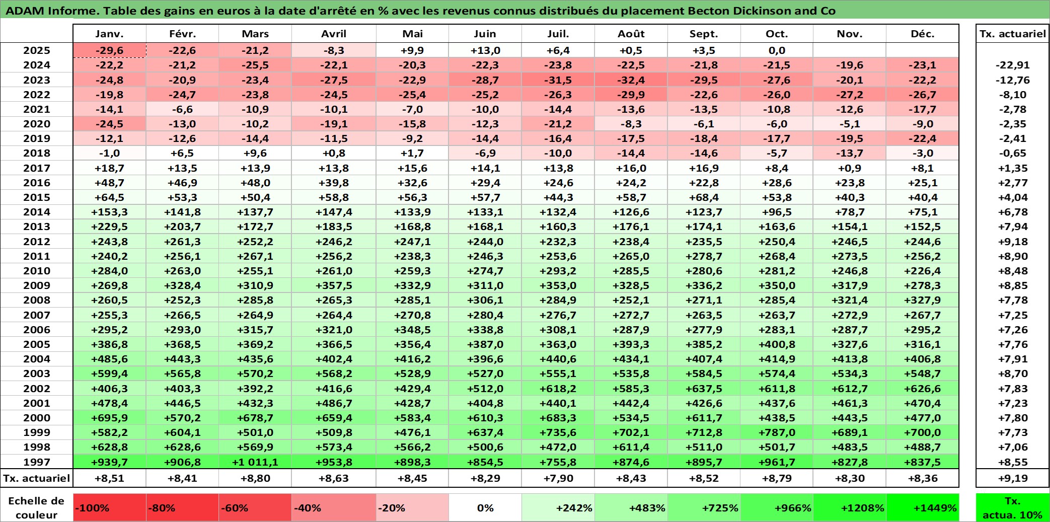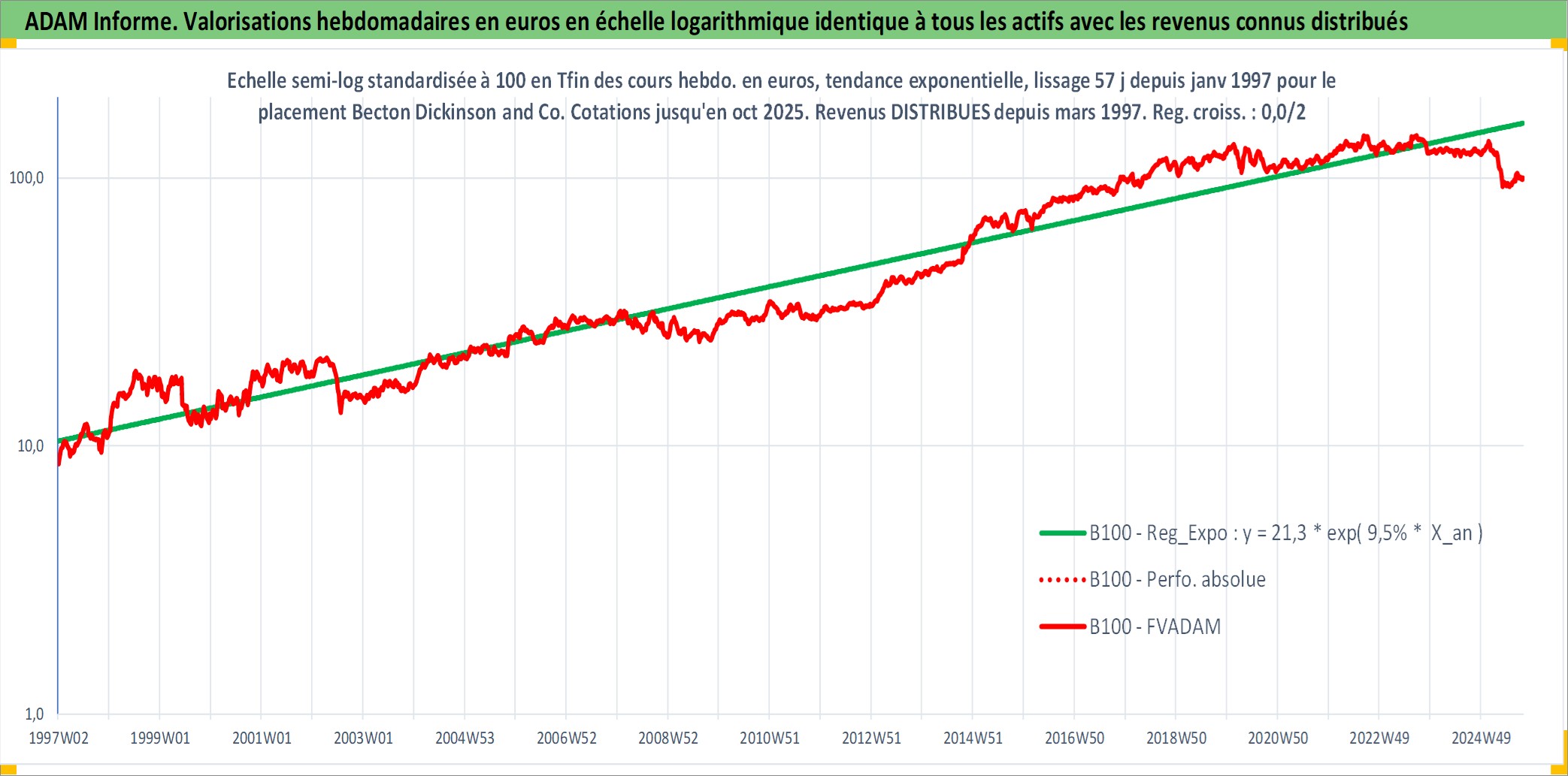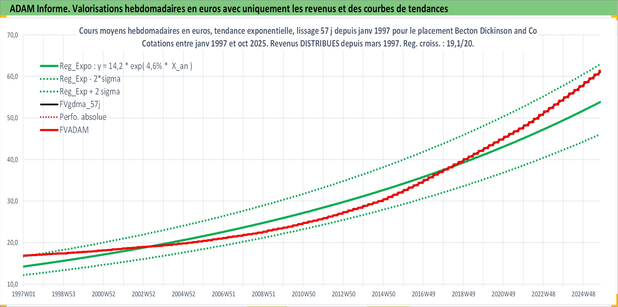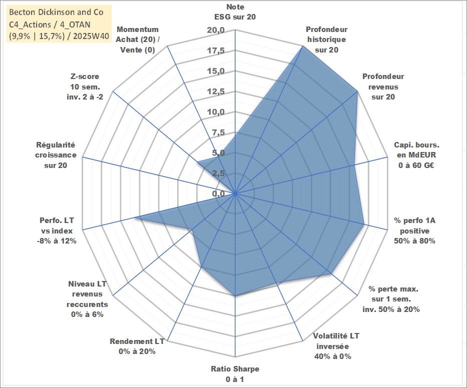 Site dédié aux investisseursPage dédiée sur site financeAnalyse des valorisations hebdomadaires de l'action Becton Dickinson and Co. Cet actif est cote en USD. Les valorisations sont en contrevaleur EURO et couvrent les semaines 1997W01 a 2025W40. Les revenus de cet actif financier sont pris en compte depuis la semaine 1997W10. La note globale ESG de cet actif est estimee a 7.0 (apres rebasage entre 0 et 20).