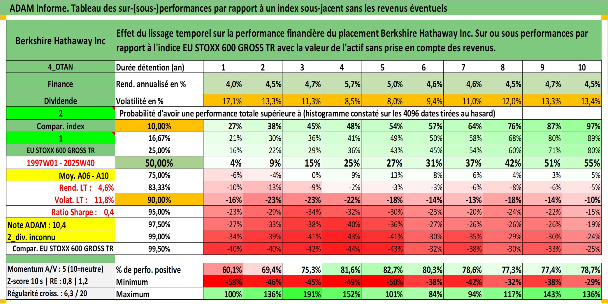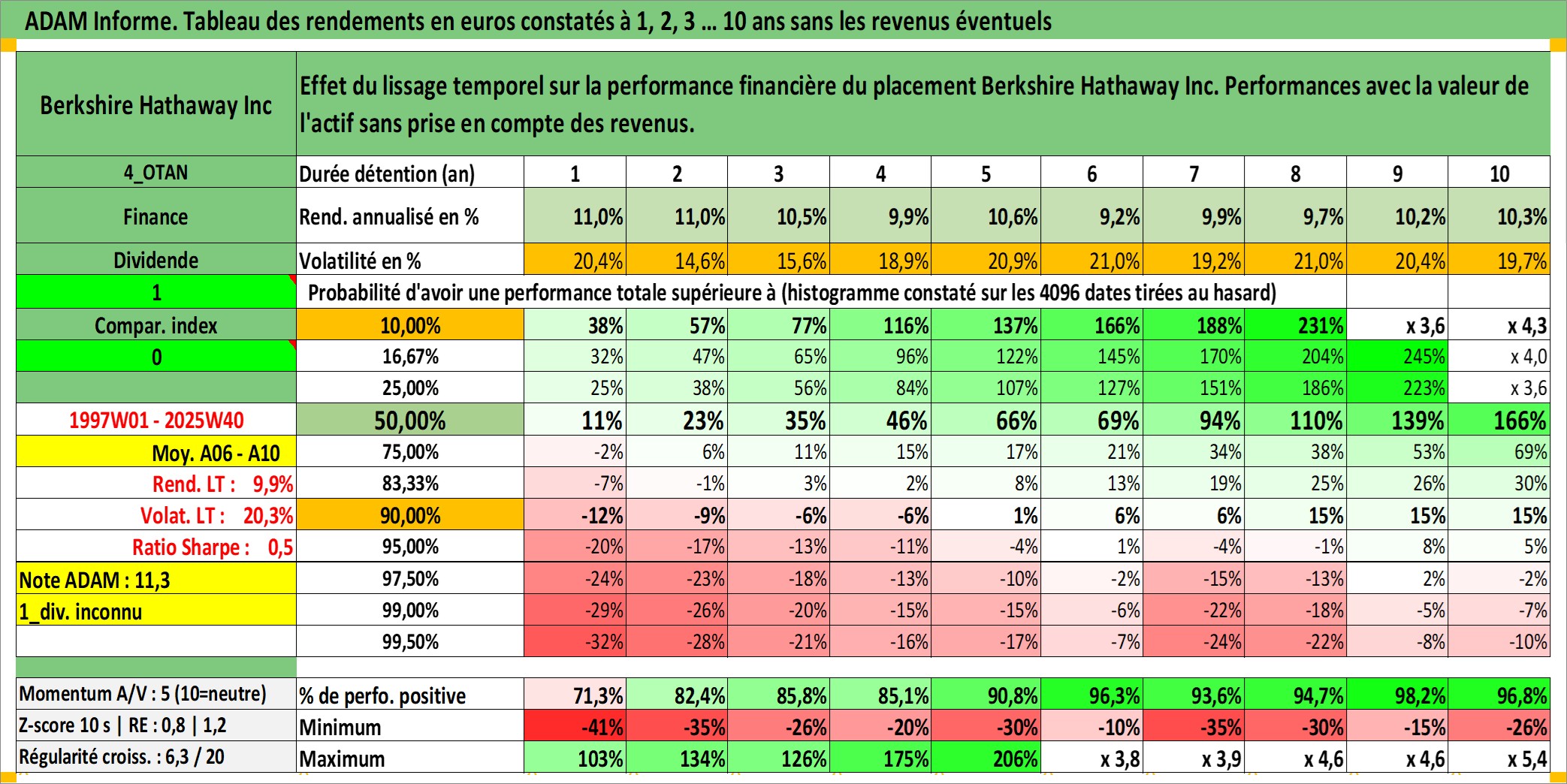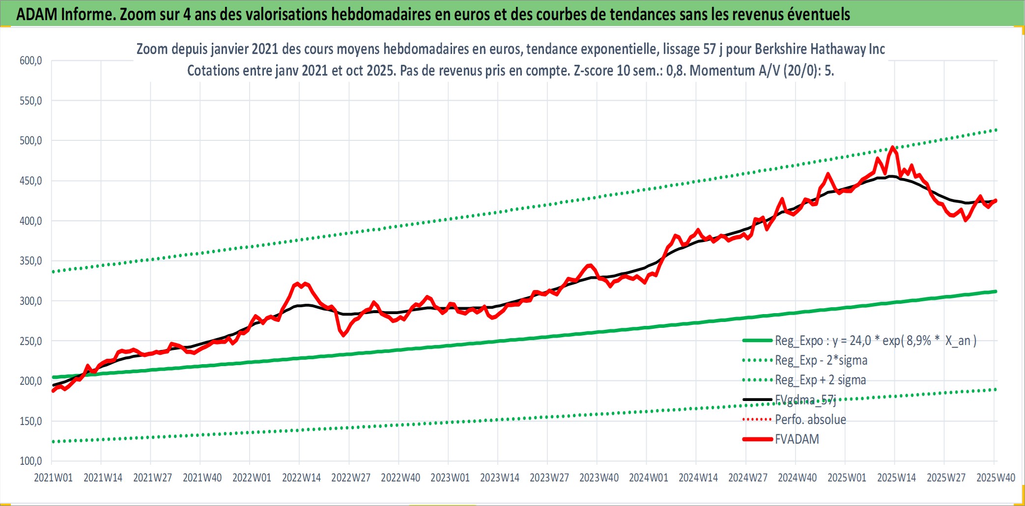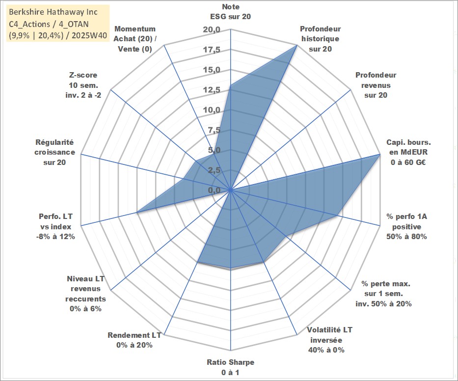 Site dédié aux investisseursPage dédiée sur site financeAnalyse des valorisations hebdomadaires de l'action Berkshire Hathaway Inc. Cet actif est cote en USD. Les valorisations sont en contrevaleur EURO et couvrent les semaines 1997W01 a 2025W40. Les revenus de cet actif financier ne sont pas connus car non existants ou non disponibles sur le site Yahoo Finance. La note globale ESG de cet actif est estimee a 13.0 (apres rebasage entre 0 et 20).