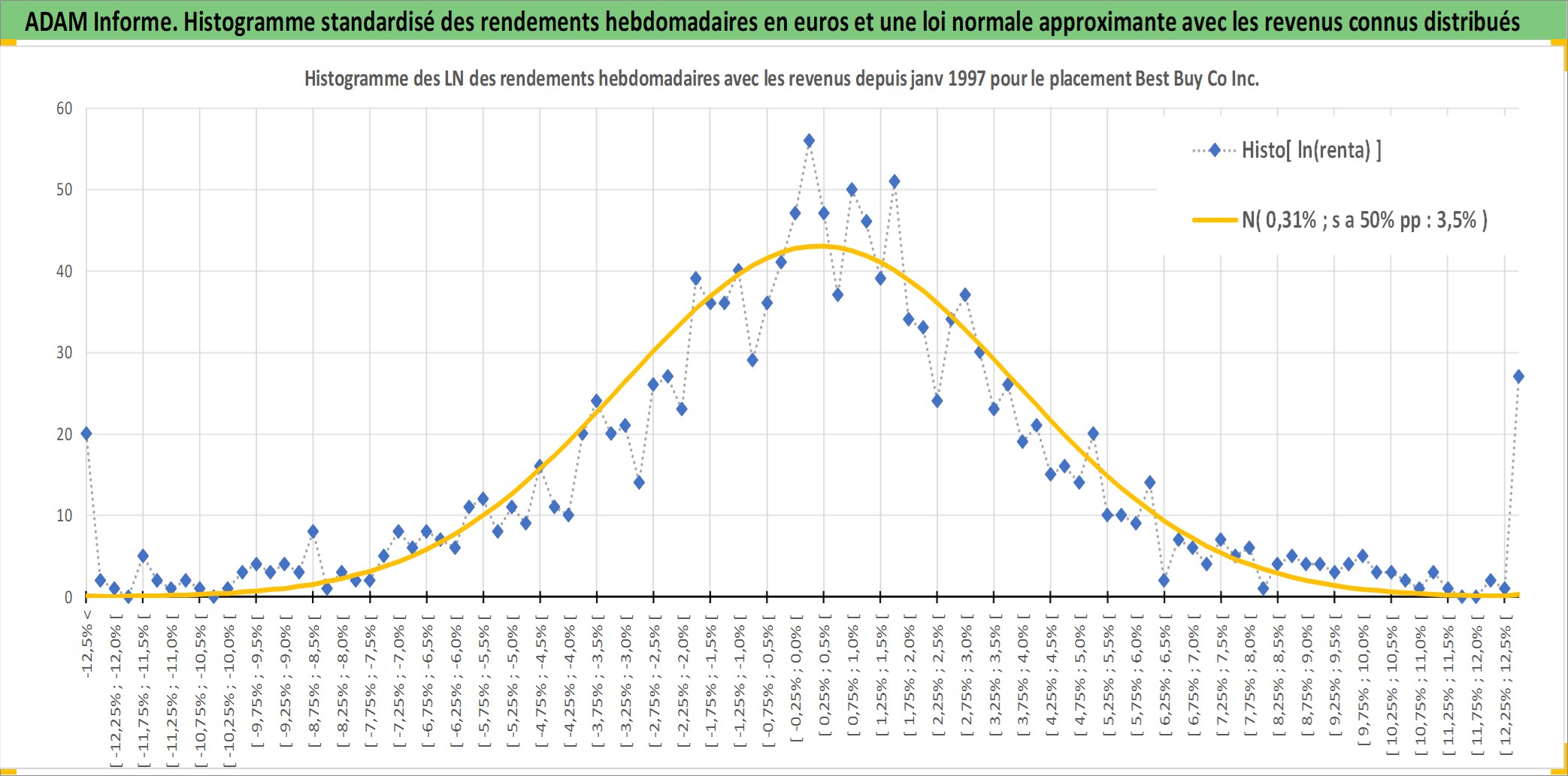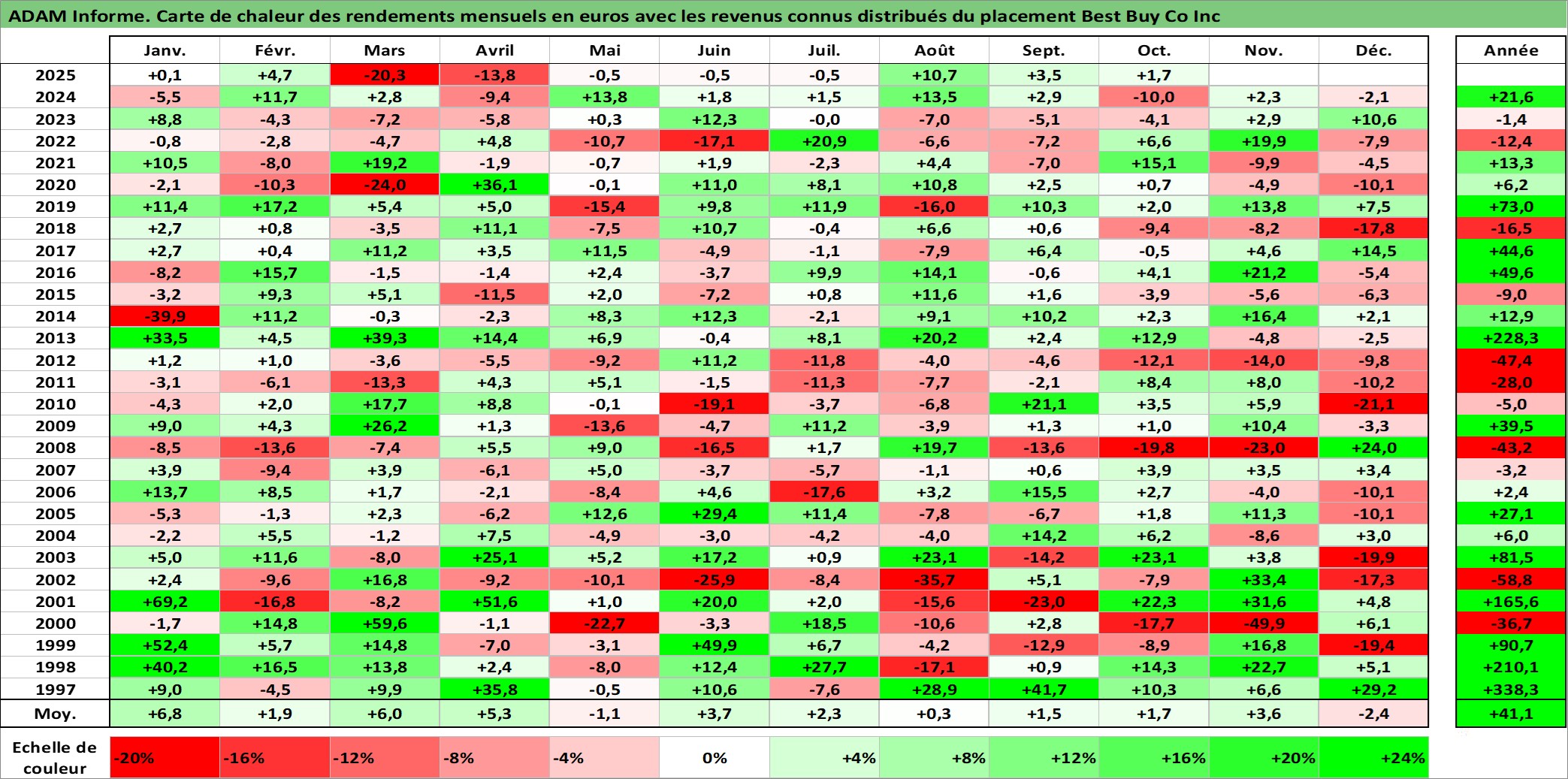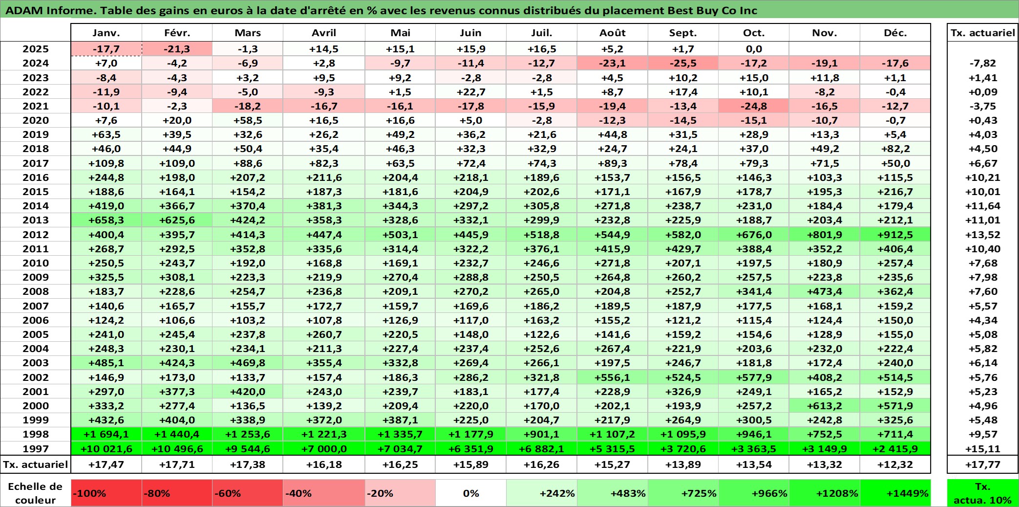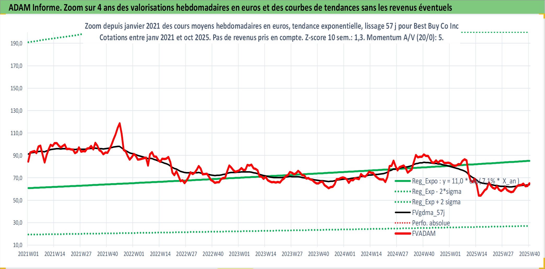 Site dédié aux investisseursPage dédiée sur site financeAnalyse des valorisations hebdomadaires de l'action Best Buy Co Inc. Cet actif est cote en USD. Les valorisations sont en contrevaleur EURO et couvrent les semaines 1997W01 a 2025W40. Les revenus de cet actif financier sont pris en compte depuis la semaine 2003W46. La note globale ESG de cet actif est estimee a 14.0 (apres rebasage entre 0 et 20).