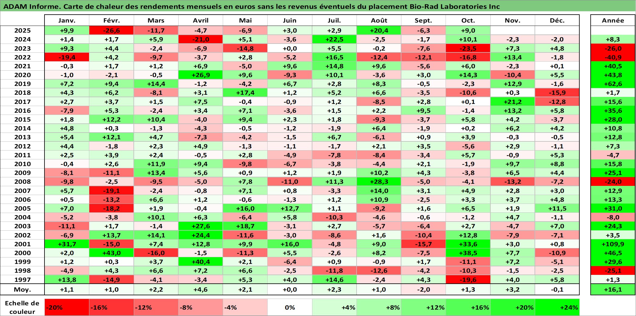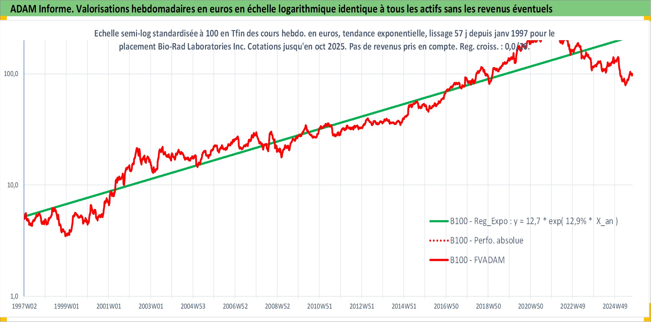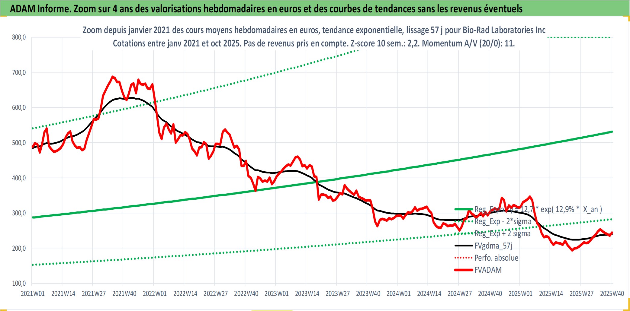 Site dédié aux investisseursPage dédiée sur site financeAnalyse des valorisations hebdomadaires de l'action Bio-Rad Laboratories Inc. Cet actif est cote en USD. Les valorisations sont en contrevaleur EURO et couvrent les semaines 1997W01 a 2025W40. Les revenus de cet actif financier ne sont pas connus car non existants ou non disponibles sur le site Yahoo Finance. La note globale ESG de cet actif est estimee a 12.0 (apres rebasage entre 0 et 20).