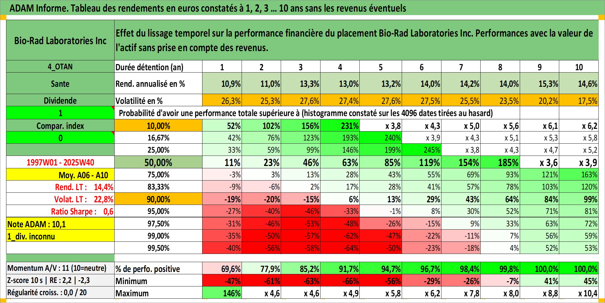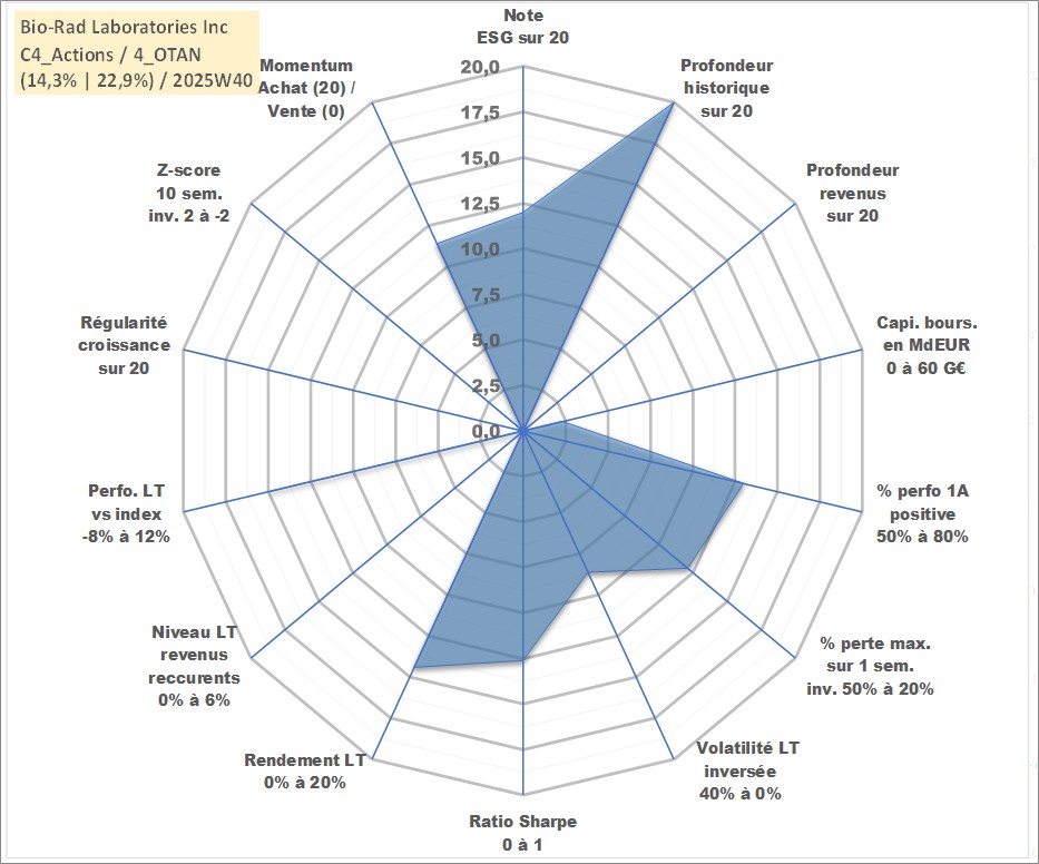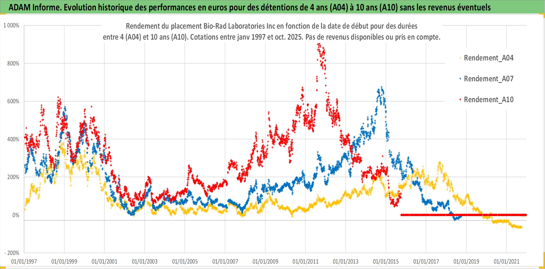 Site dédié aux investisseursPage dédiée sur site financeAnalyse des valorisations hebdomadaires de l'action Bio-Rad Laboratories Inc. Cet actif est cote en USD. Les valorisations sont en contrevaleur EURO et couvrent les semaines 1997W01 a 2025W40. Les revenus de cet actif financier ne sont pas connus car non existants ou non disponibles sur le site Yahoo Finance. La note globale ESG de cet actif est estimee a 12.0 (apres rebasage entre 0 et 20).