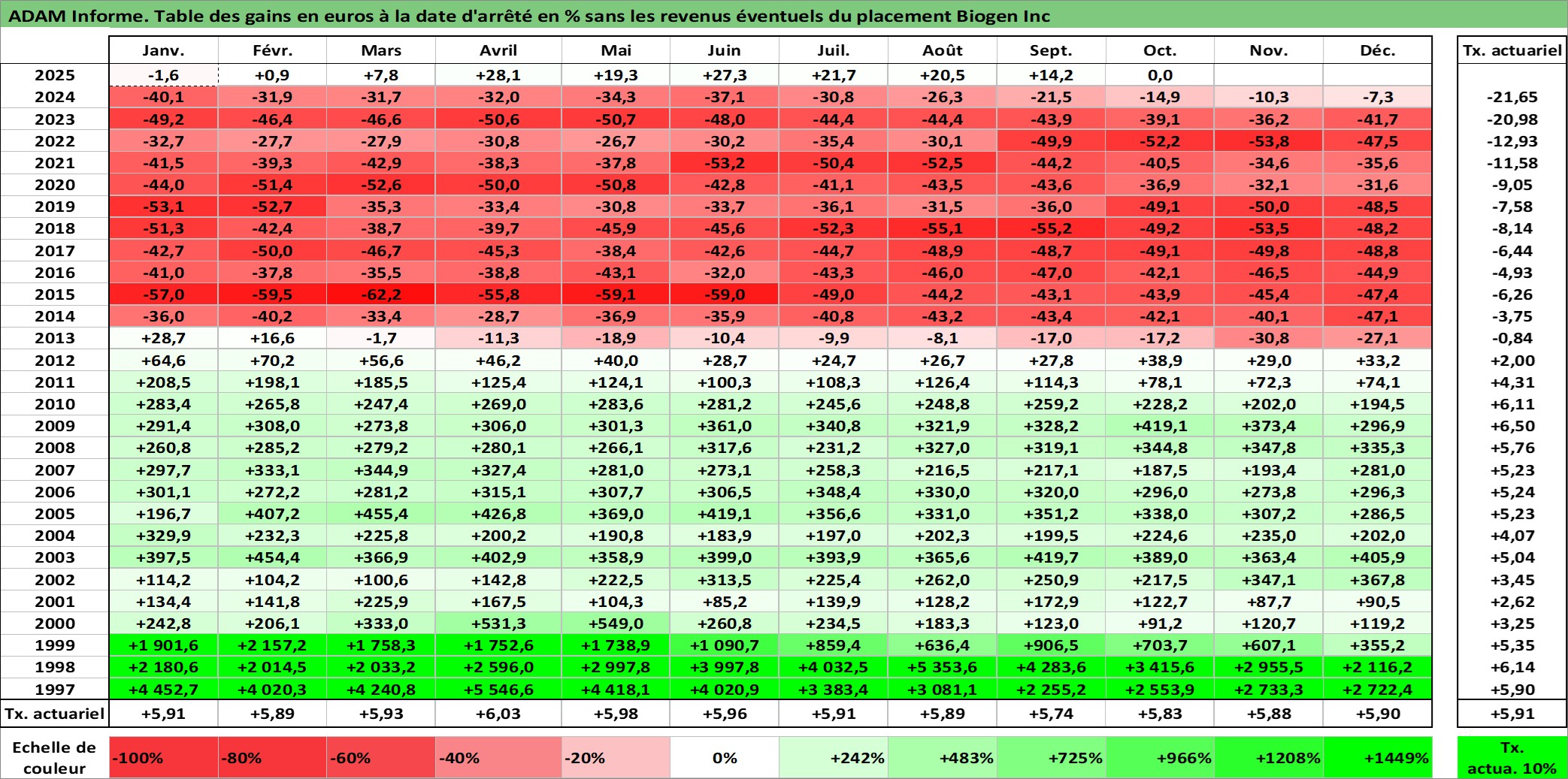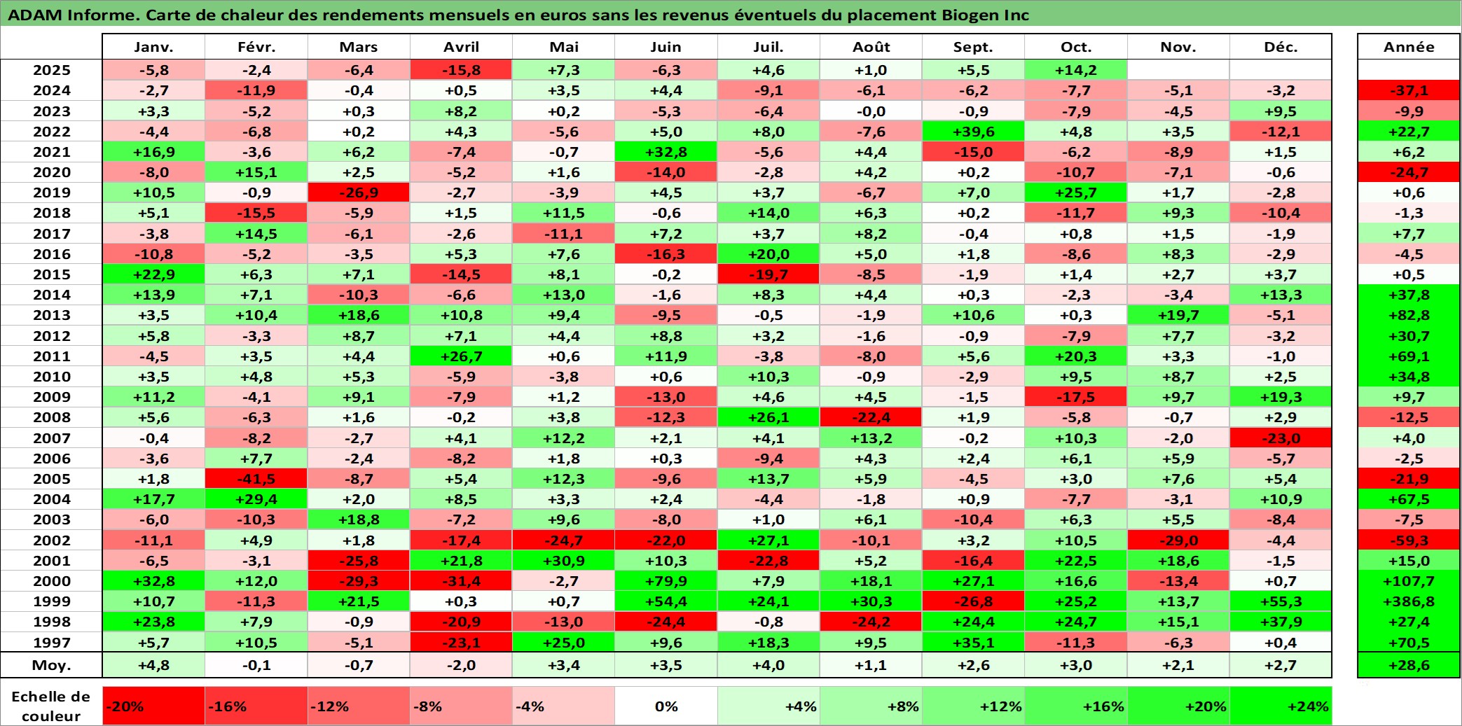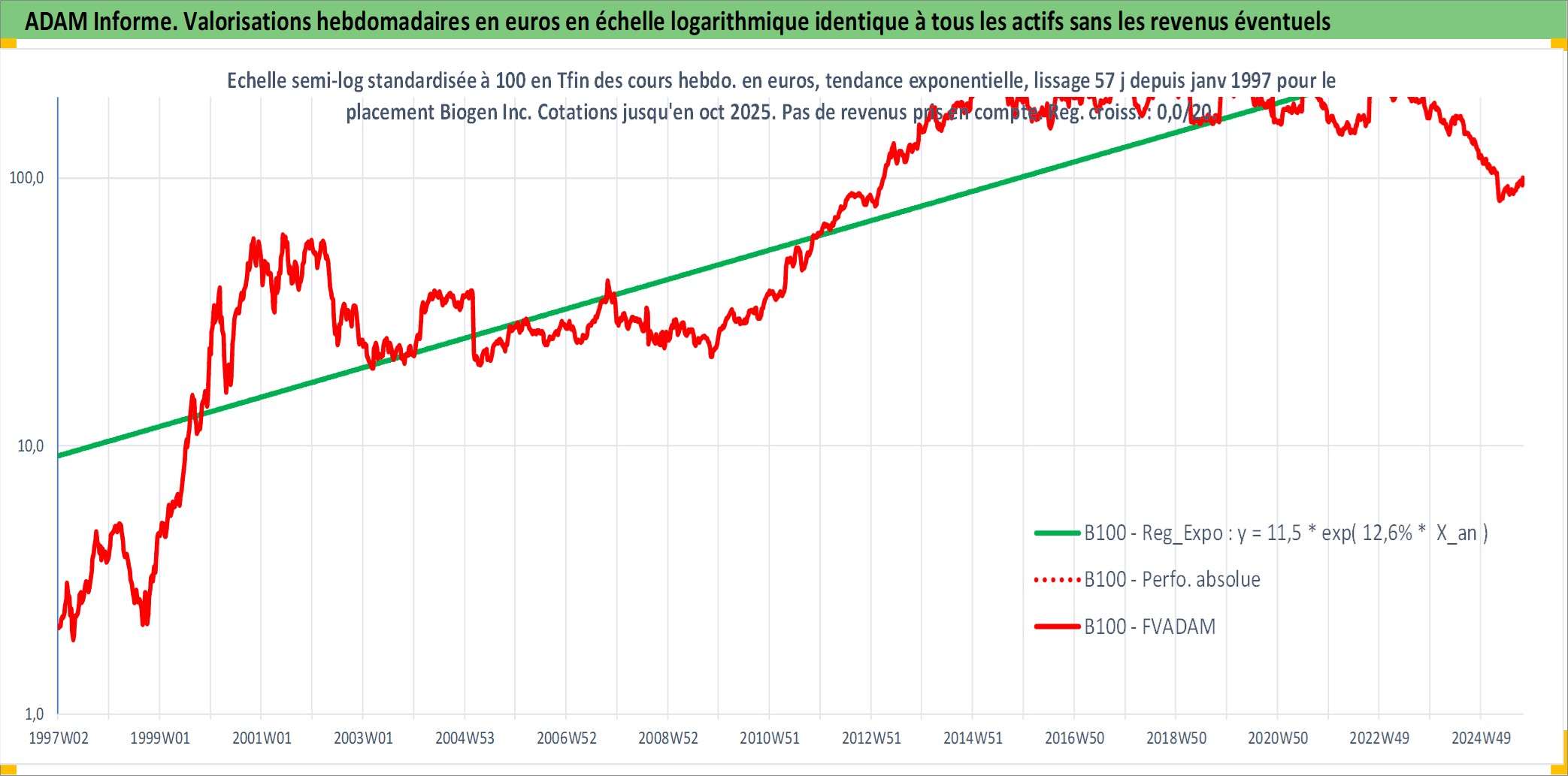 Site dédié aux investisseursPage dédiée sur site financeAnalyse des valorisations hebdomadaires de l'action Biogen Inc. Cet actif est cote en USD. Les valorisations sont en contrevaleur EURO et couvrent les semaines 1997W01 a 2025W40. Les revenus de cet actif financier ne sont pas connus car non existants ou non disponibles sur le site Yahoo Finance. La note globale ESG de cet actif est estimee a 10.0 (apres rebasage entre 0 et 20).