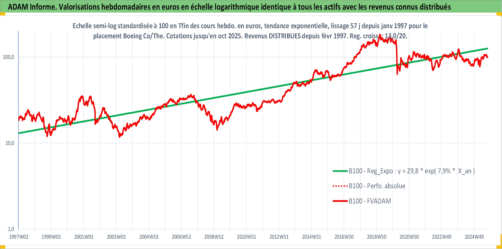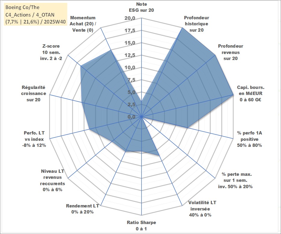 Site dédié aux investisseursPage dédiée sur site financeAnalyse des valorisations hebdomadaires de l'action Boeing Co/The. Cet actif est cote en USD. Les valorisations sont en contrevaleur EURO et couvrent les semaines 1997W01 a 2025W40. Les revenus de cet actif financier sont pris en compte depuis la semaine 1997W07. La note globale ESG de cet actif est estimee a 3.0 (apres rebasage entre 0 et 20).