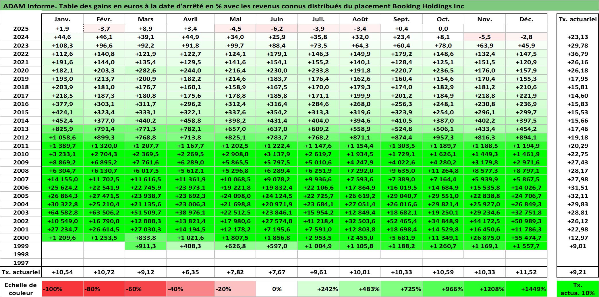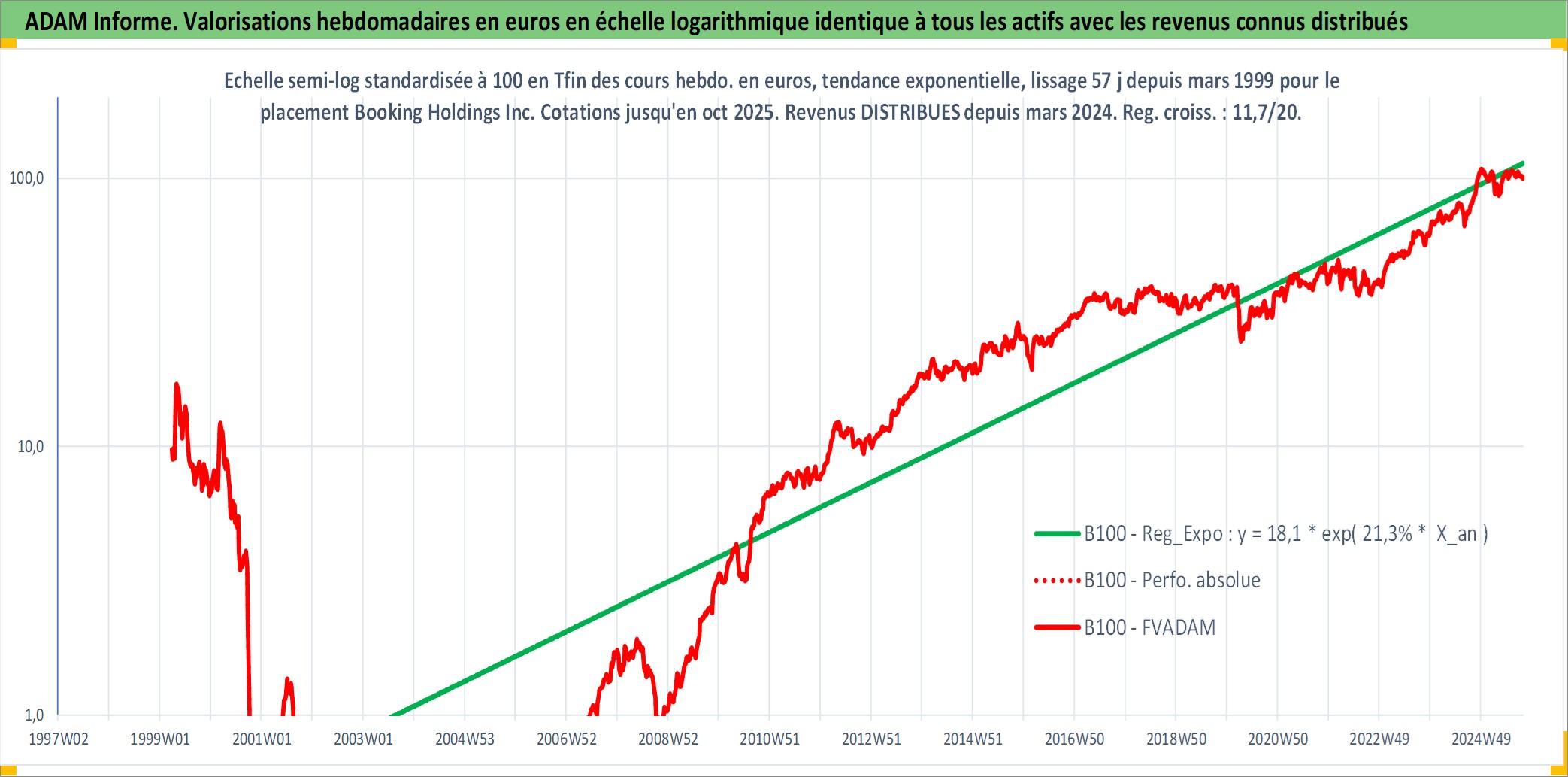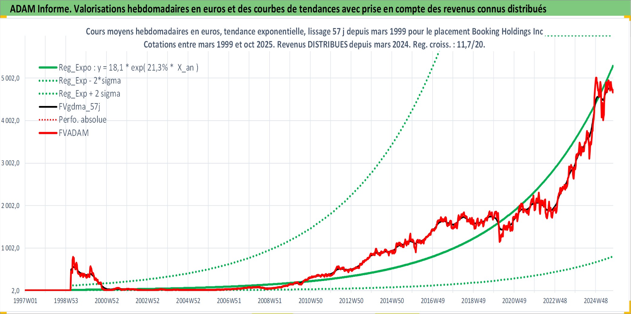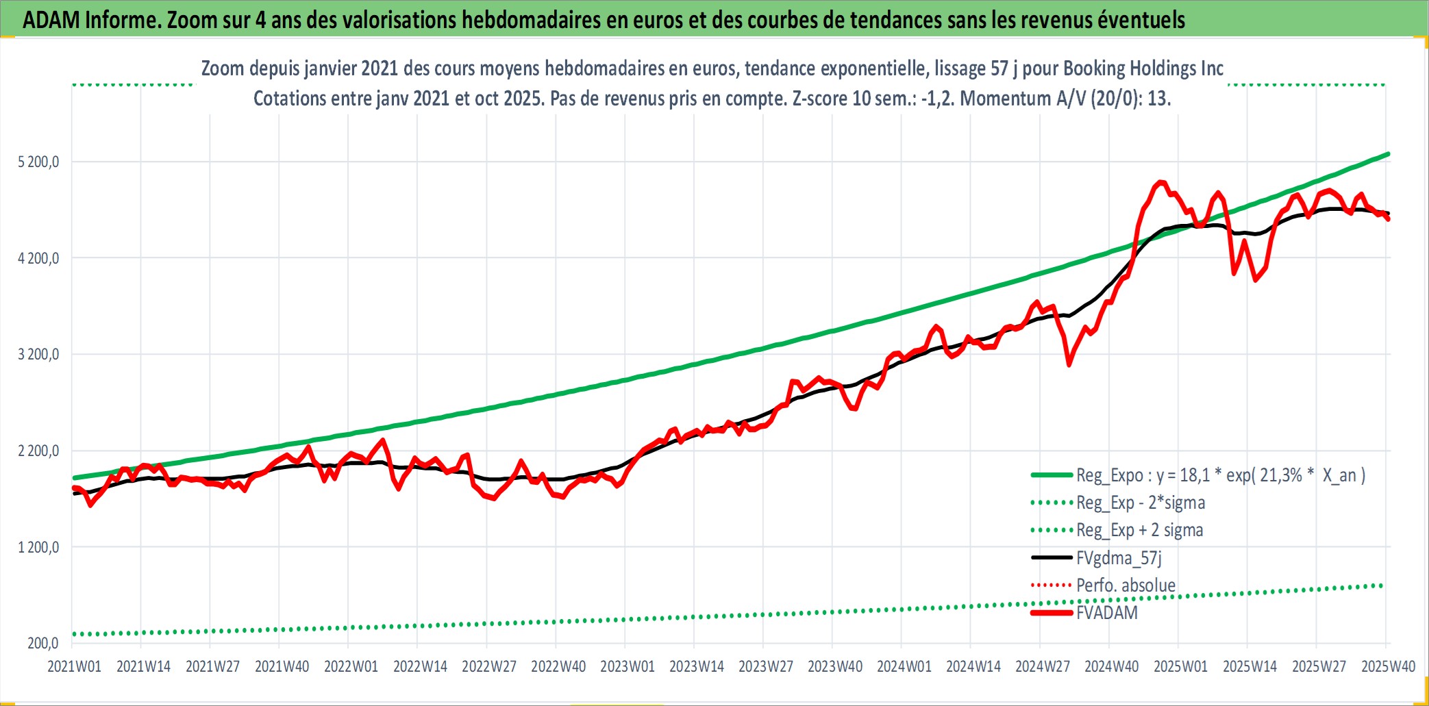 Site dédié aux investisseursPage dédiée sur site financeAnalyse des valorisations hebdomadaires de l'action Booking Holdings Inc. Cet actif est cote en USD. Les valorisations sont en contrevaleur EURO et couvrent les semaines 1999W13 a 2025W40. Les revenus de cet actif financier sont pris en compte depuis la semaine 2024W10. La note globale ESG de cet actif est estimee a 9.0 (apres rebasage entre 0 et 20).