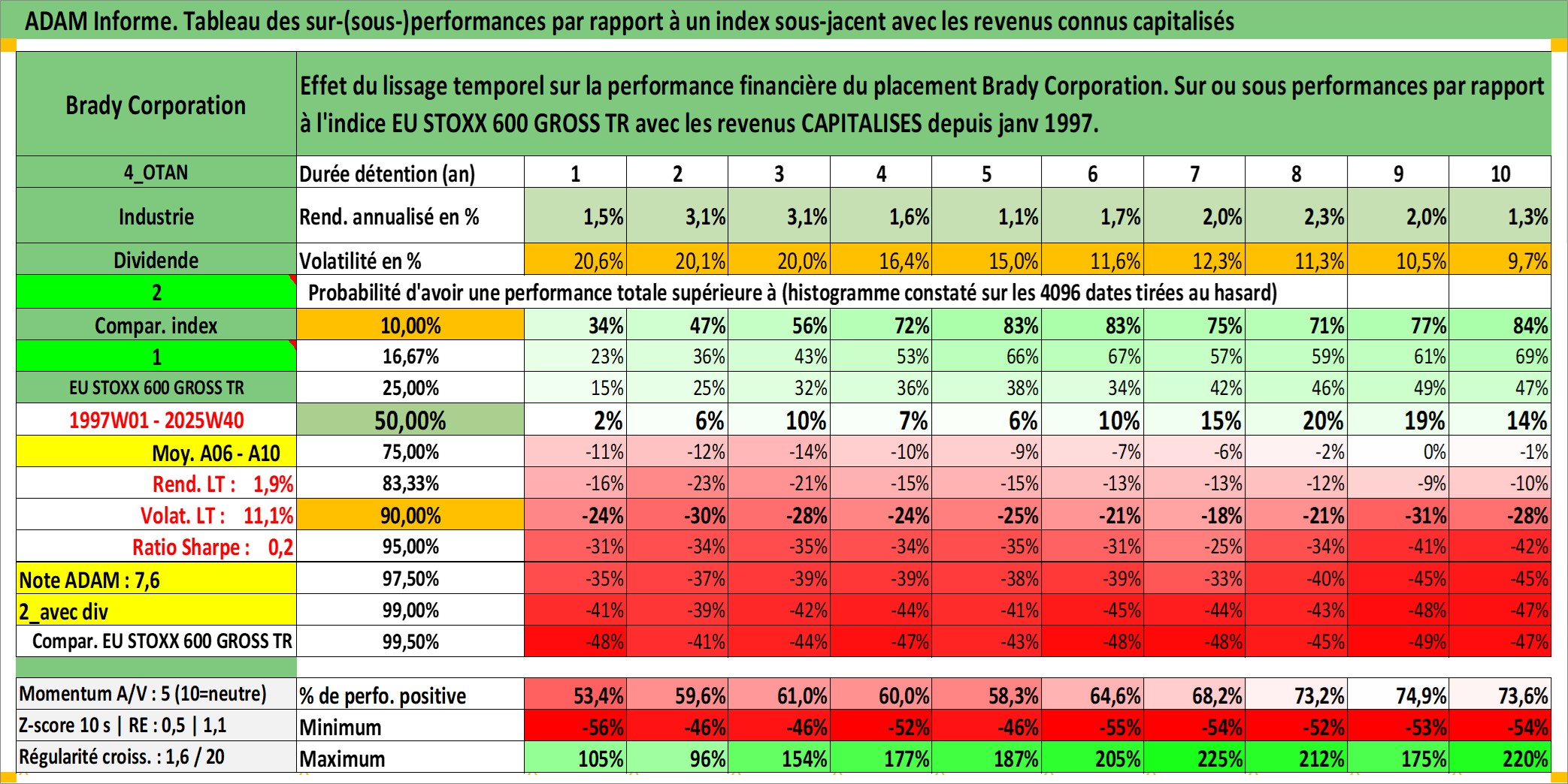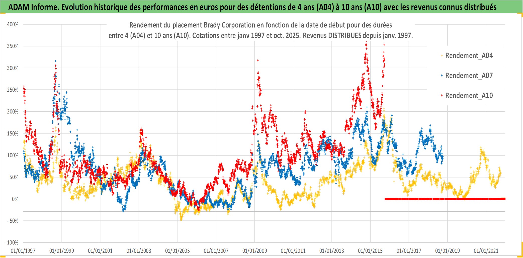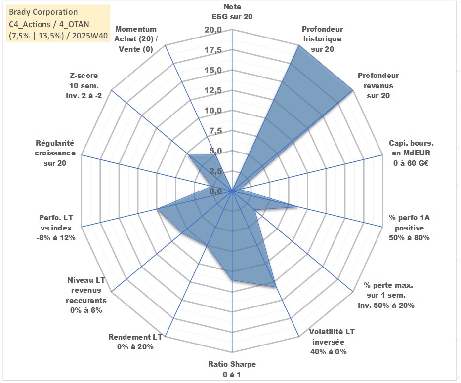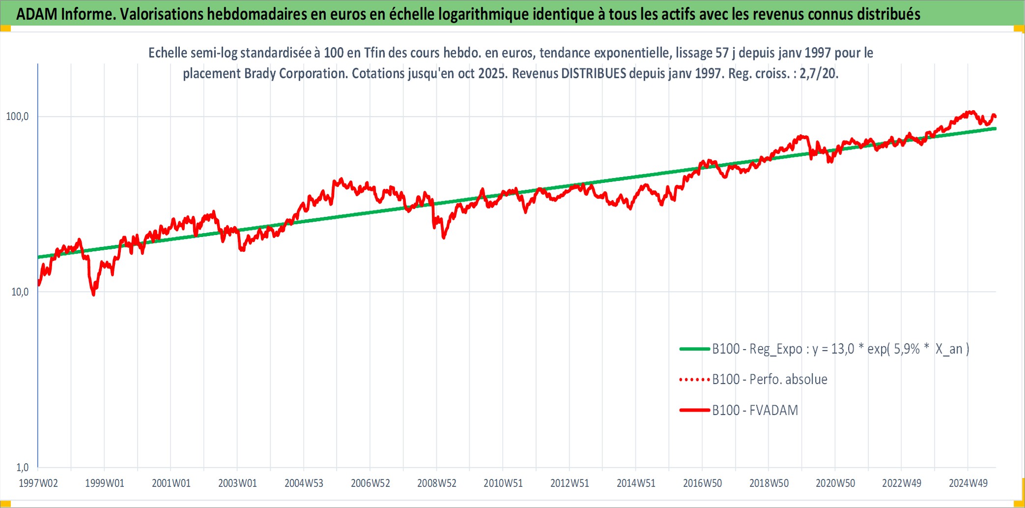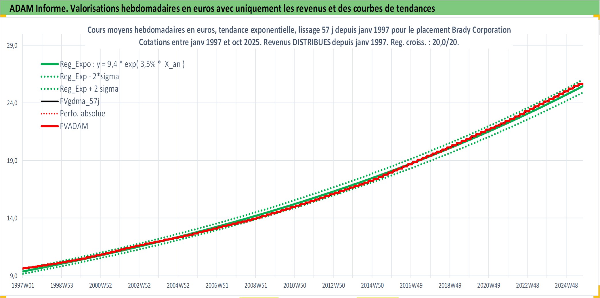 Site dédié aux investisseursPage dédiée sur site financeAnalyse des valorisations hebdomadaires de l'action Brady Corporation. Cet actif est cote en USD. Les valorisations sont en contrevaleur EURO et couvrent les semaines 1997W01 a 2025W40. Les revenus de cet actif financier sont pris en compte depuis la semaine 1997W02. La note ESG de cet actif n'est pas connue.