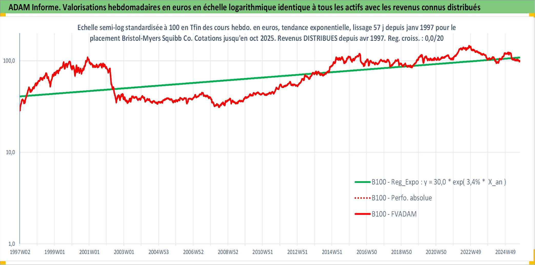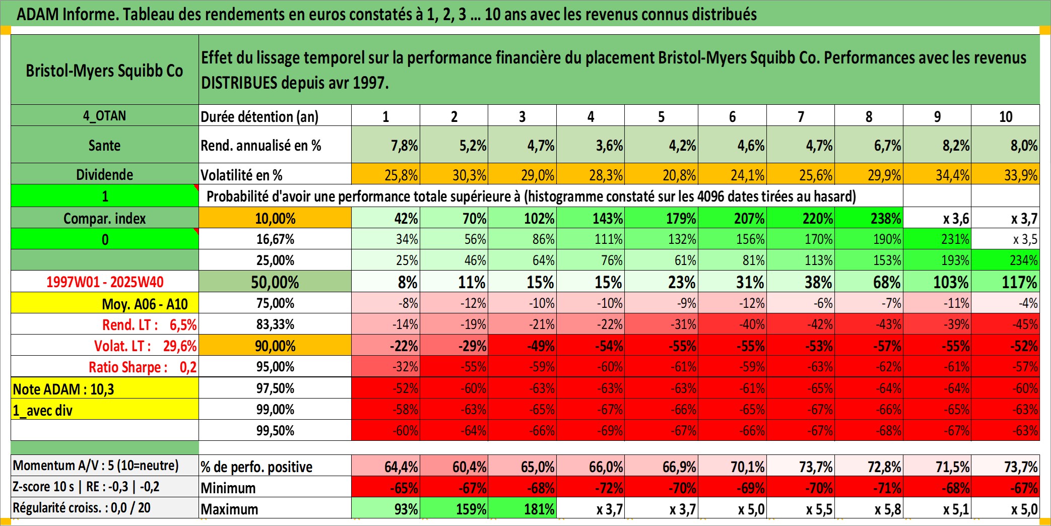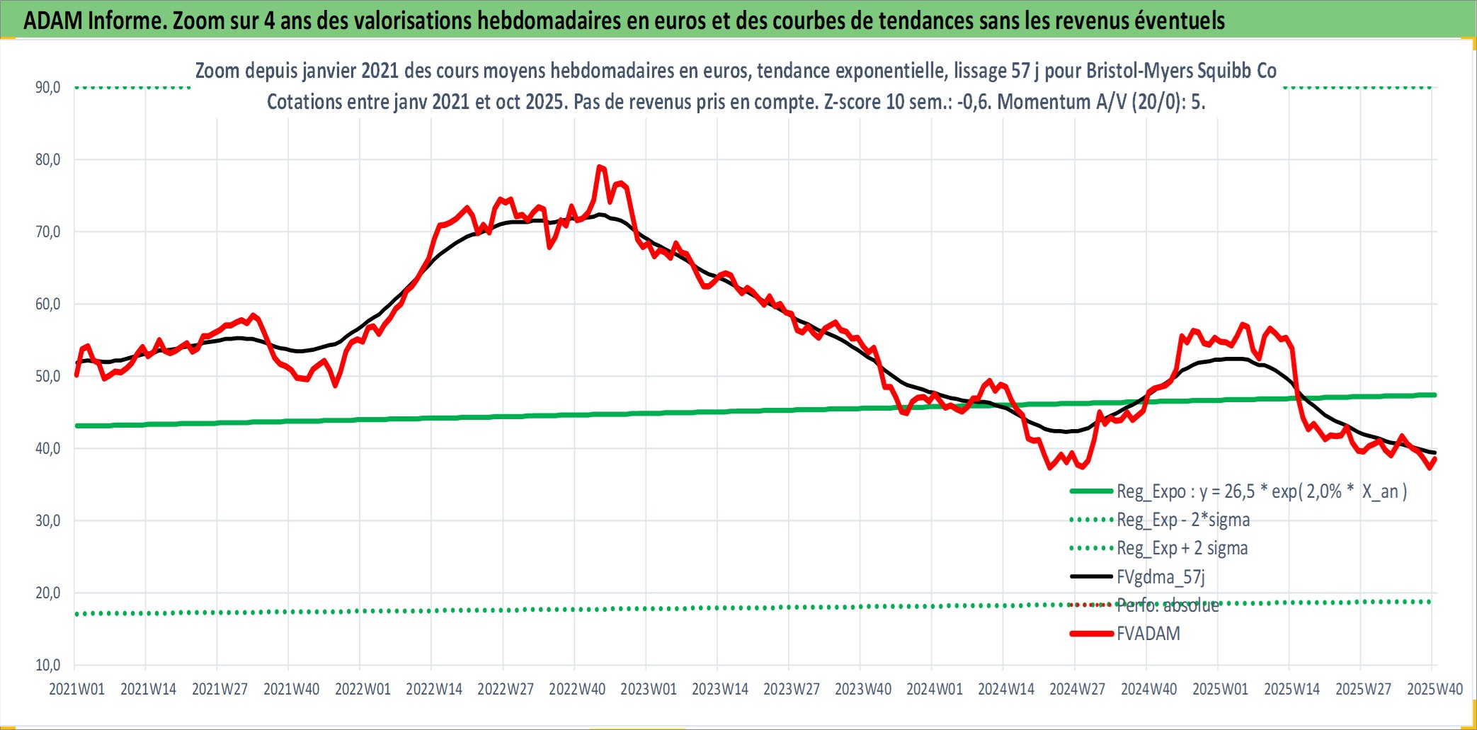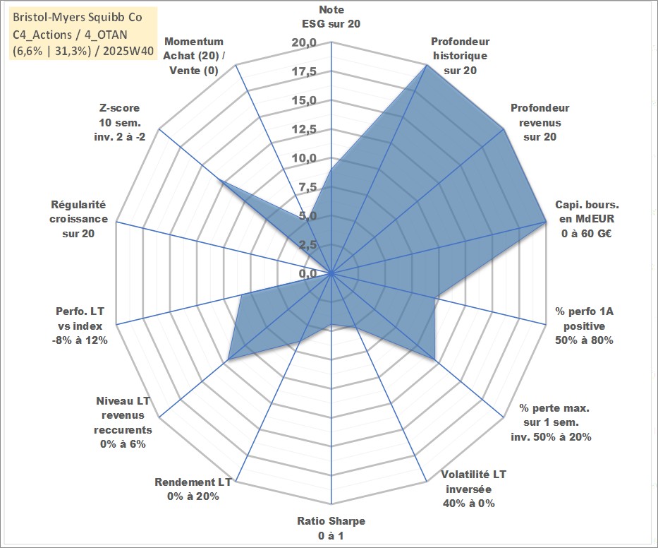Site dédié aux investisseursPage dédiée sur site financeAnalyse des valorisations hebdomadaires de l'action Bristol-Myers Squibb Co. Cet actif est cote en USD. Les valorisations sont en contrevaleur EURO et couvrent les semaines 1997W01 a 2025W40. Les revenus de cet actif financier sont pris en compte depuis la semaine 1997W14. La note globale ESG de cet actif est estimee a 9.0 (apres rebasage entre 0 et 20).