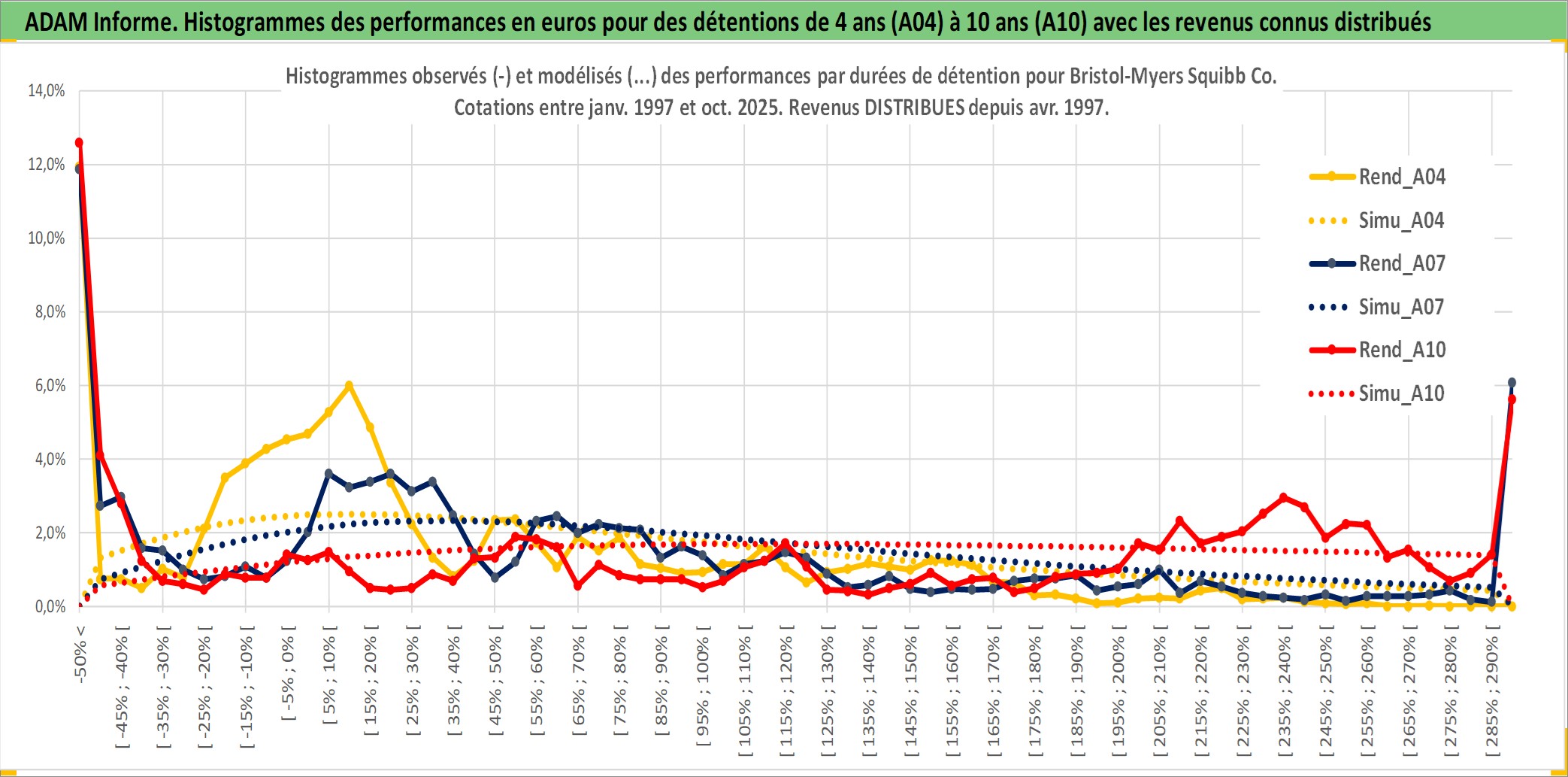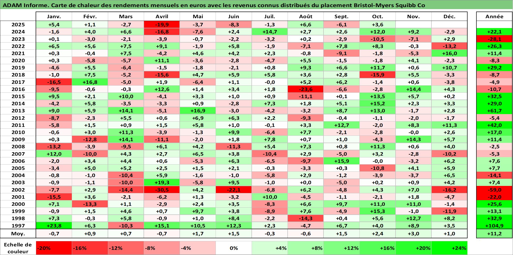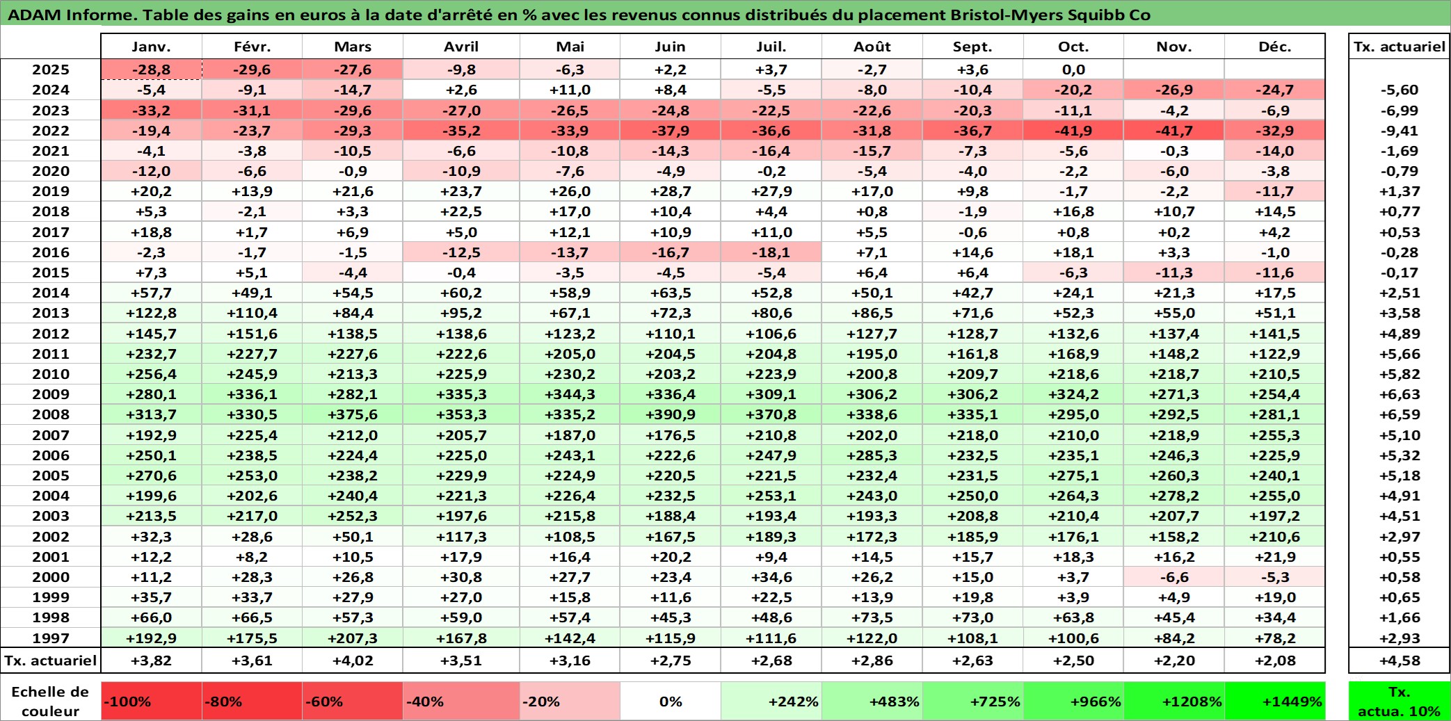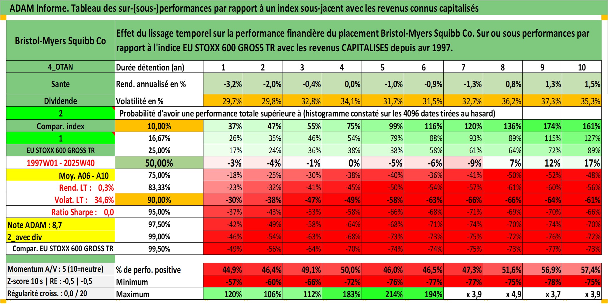 Site dédié aux investisseursPage dédiée sur site financeAnalyse des valorisations hebdomadaires de l'action Bristol-Myers Squibb Co. Cet actif est cote en USD. Les valorisations sont en contrevaleur EURO et couvrent les semaines 1997W01 a 2025W40. Les revenus de cet actif financier sont pris en compte depuis la semaine 1997W14. La note globale ESG de cet actif est estimee a 9.0 (apres rebasage entre 0 et 20).