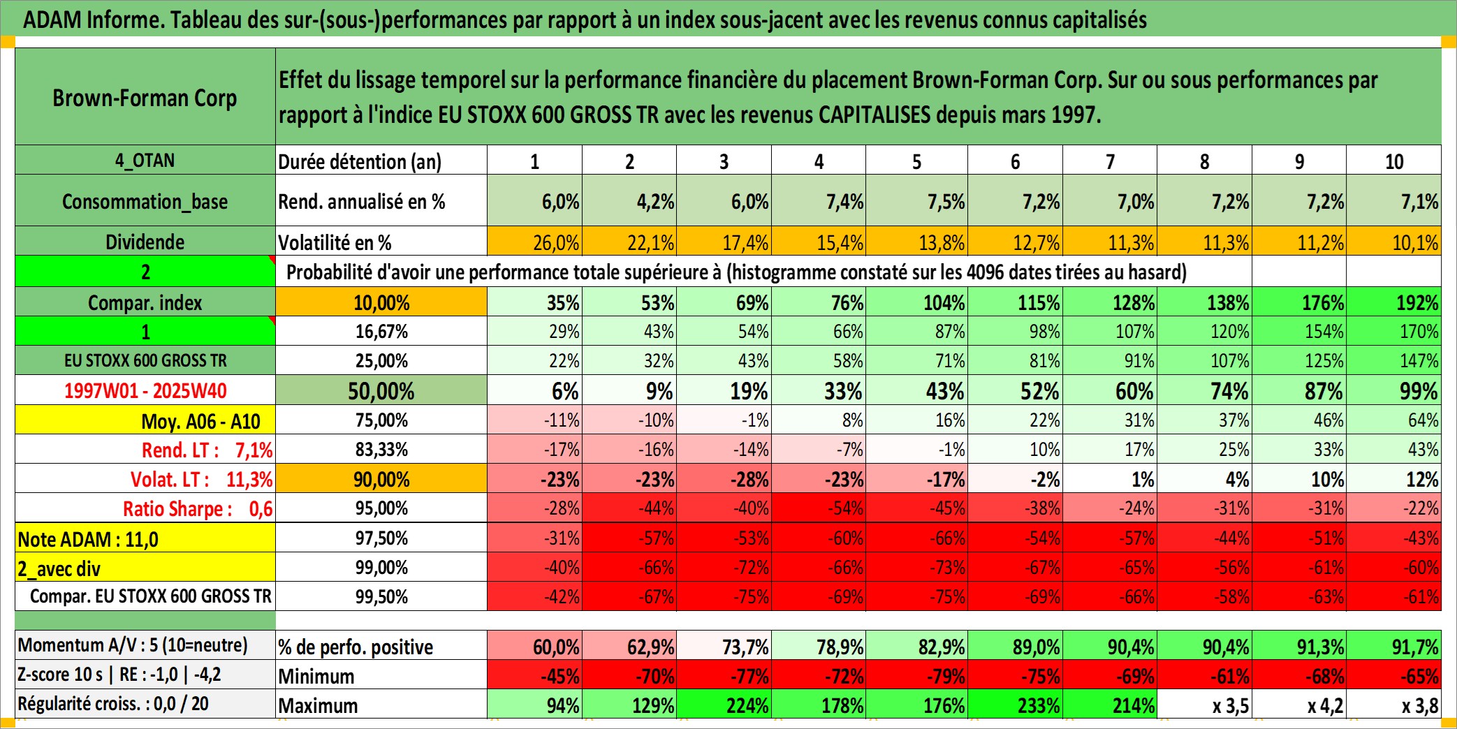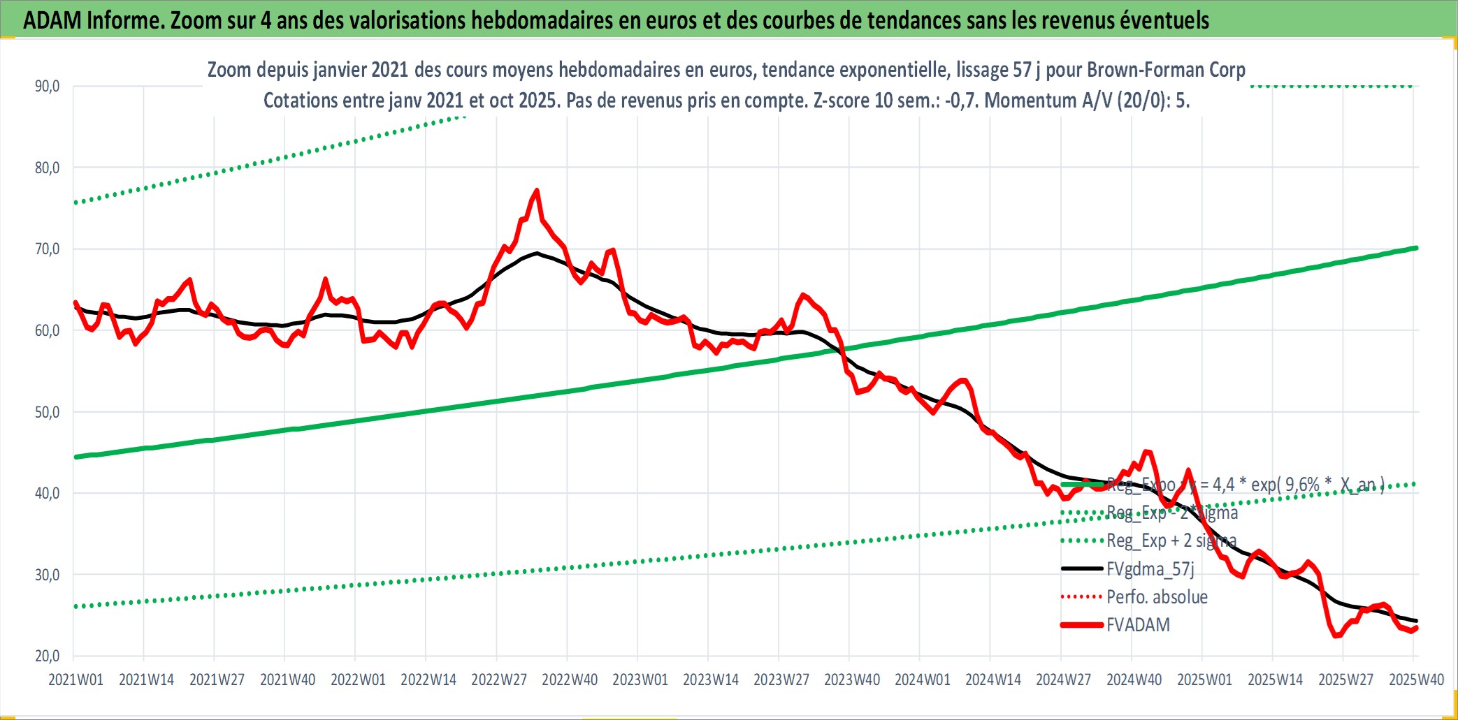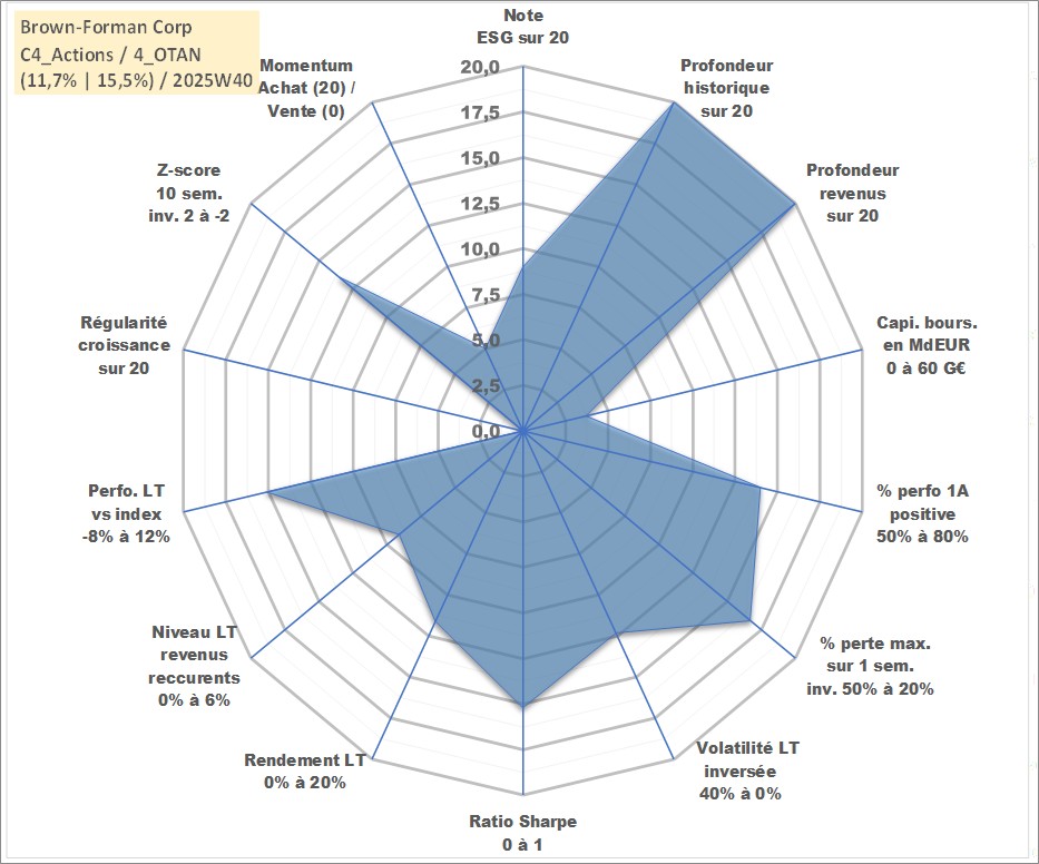 Site dédié aux investisseursPage dédiée sur site financeAnalyse des valorisations hebdomadaires de l'action Brown-Forman Corp. Cet actif est cote en USD. Les valorisations sont en contrevaleur EURO et couvrent les semaines 1997W01 a 2025W40. Les revenus de cet actif financier sont pris en compte depuis la semaine 1997W10. La note globale ESG de cet actif est estimee a 9.0 (apres rebasage entre 0 et 20).