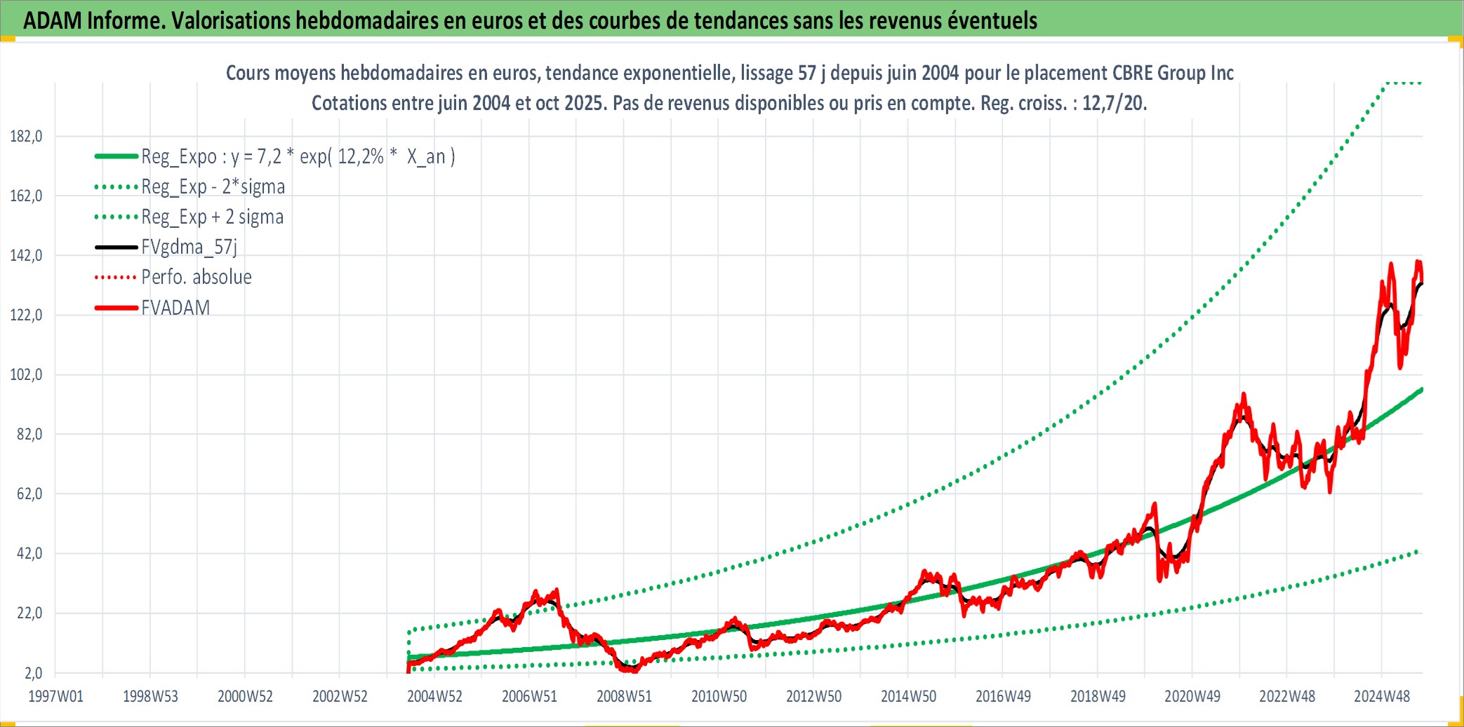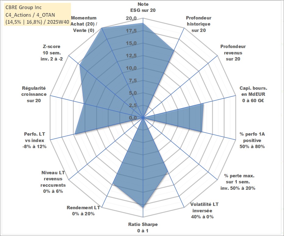 Site dédié aux investisseursPage dédiée sur site financeAnalyse des valorisations hebdomadaires de l'action CBRE Group Inc. Cet actif est cote en USD. Les valorisations sont en contrevaleur EURO et couvrent les semaines 2004W24 a 2025W40. Les revenus de cet actif financier ne sont pas connus car non existants ou non disponibles sur le site Yahoo Finance. La note globale ESG de cet actif est estimee a 19.0 (apres rebasage entre 0 et 20).