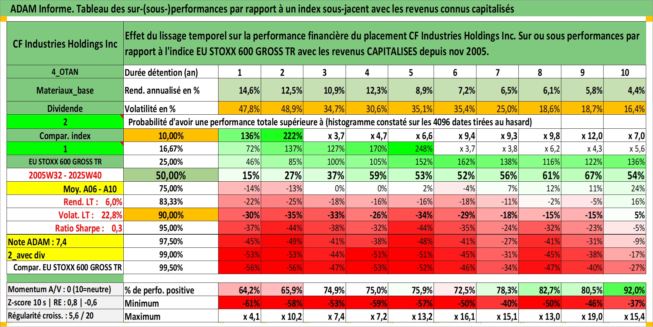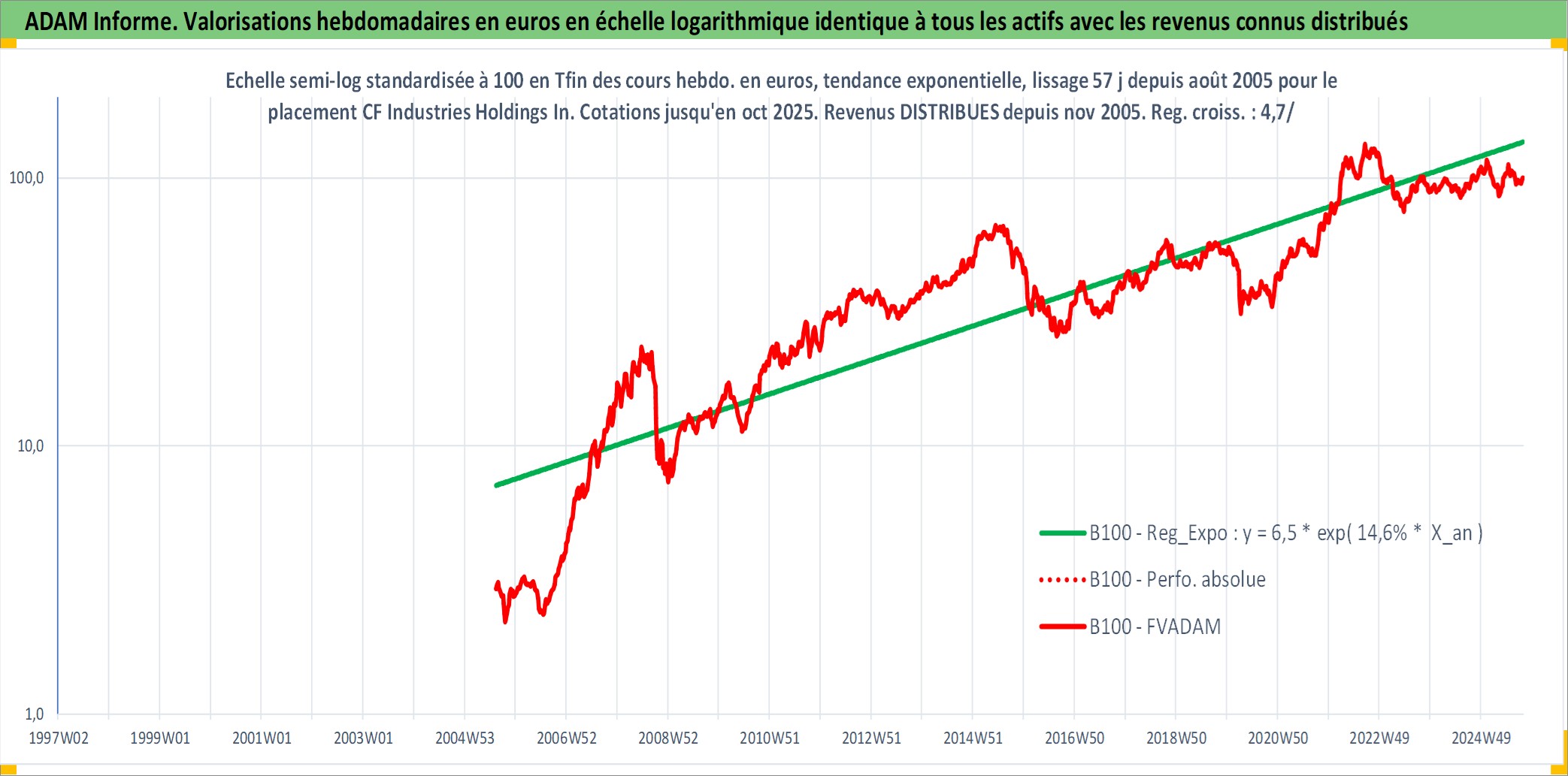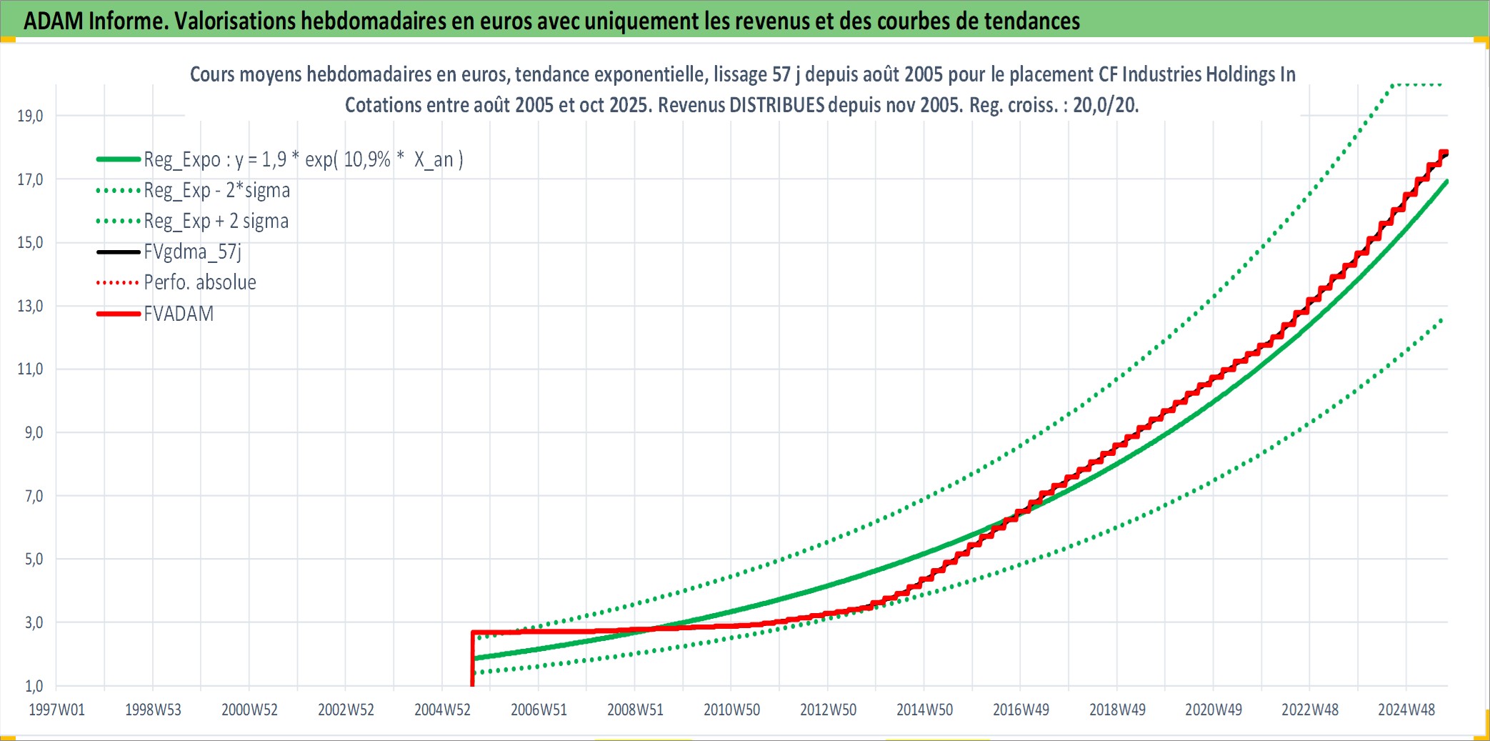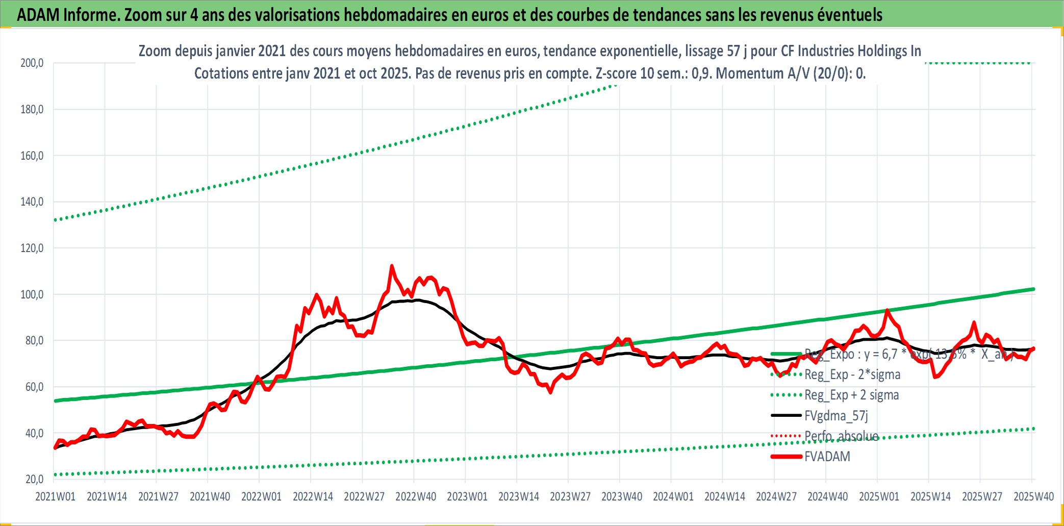 Site dédié aux investisseursPage dédiée sur site financeAnalyse des valorisations hebdomadaires de l'action CF Industries Holdings Inc. Cet actif est cote en USD. Les valorisations sont en contrevaleur EURO et couvrent les semaines 2005W32 a 2025W40. Les revenus de cet actif financier sont pris en compte depuis la semaine 2005W45. La note globale ESG de cet actif est estimee a 5.0 (apres rebasage entre 0 et 20).